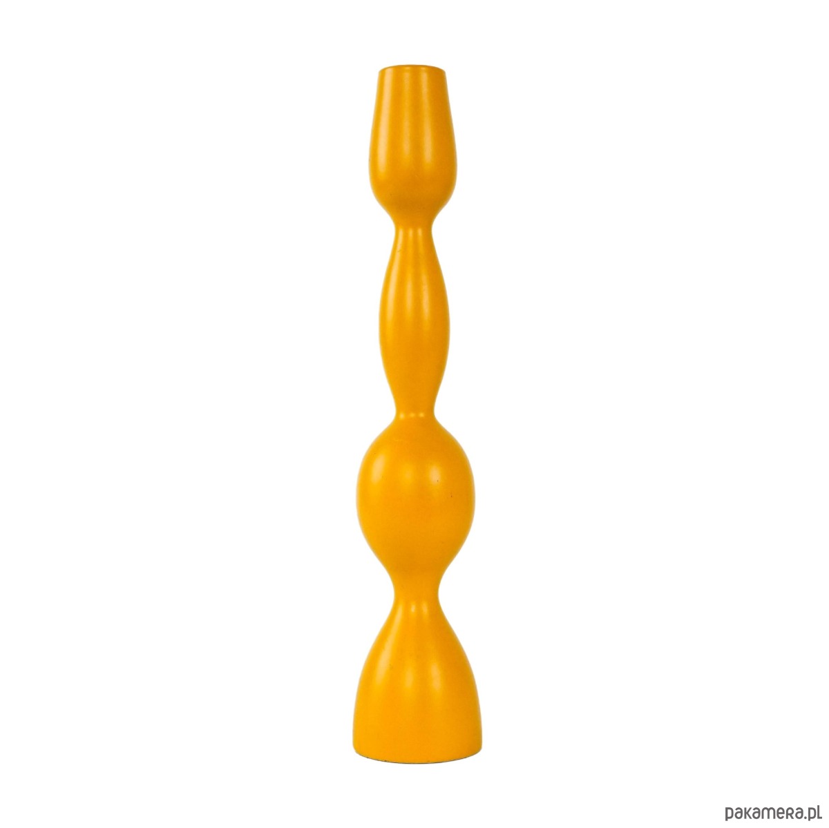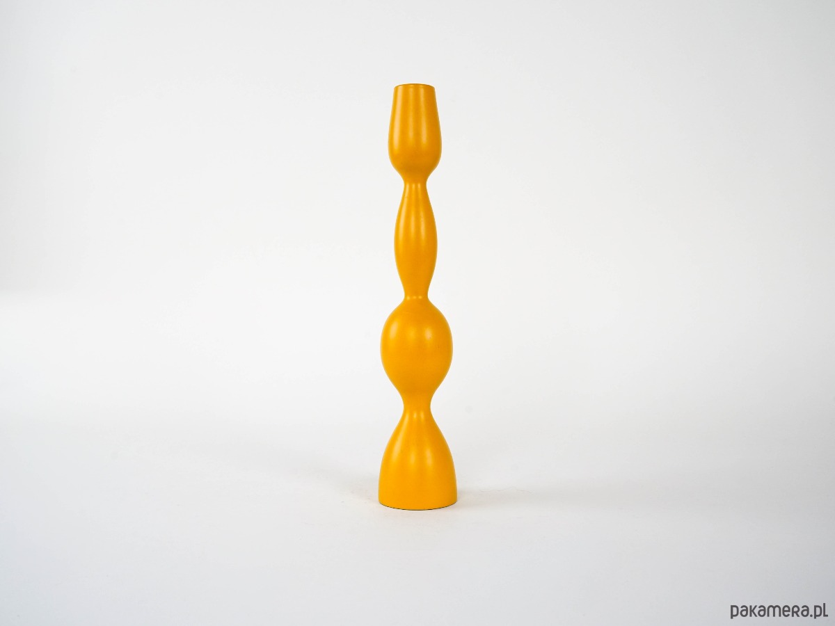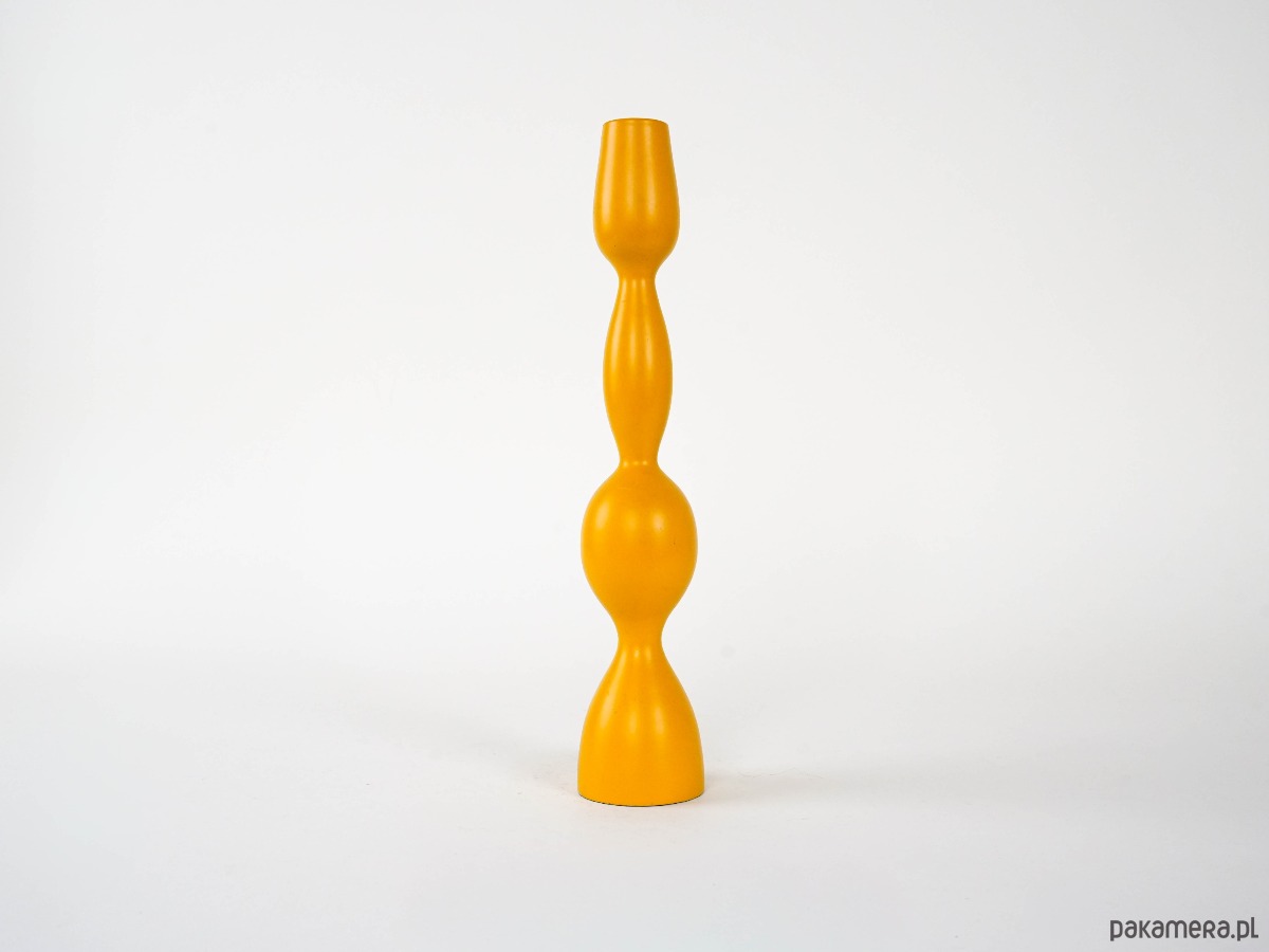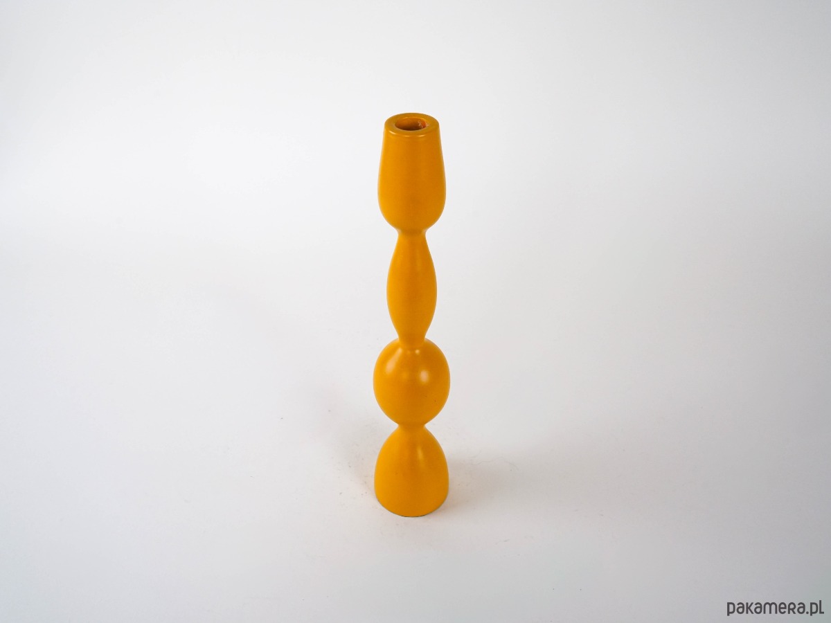 Wyjątkowy świecznik z lat 60./70., wykonany z drewna i pokryty satynową, musztardową emalią. Organiczna, rzeźbiarska forma o miękkich liniach przyciąga uwagę i stanowi przykład skandynawskiego modernizmu. Idealny akcent kolorystyczny do wnętrz w stylu mid-century modern.