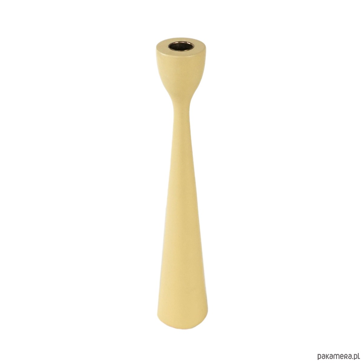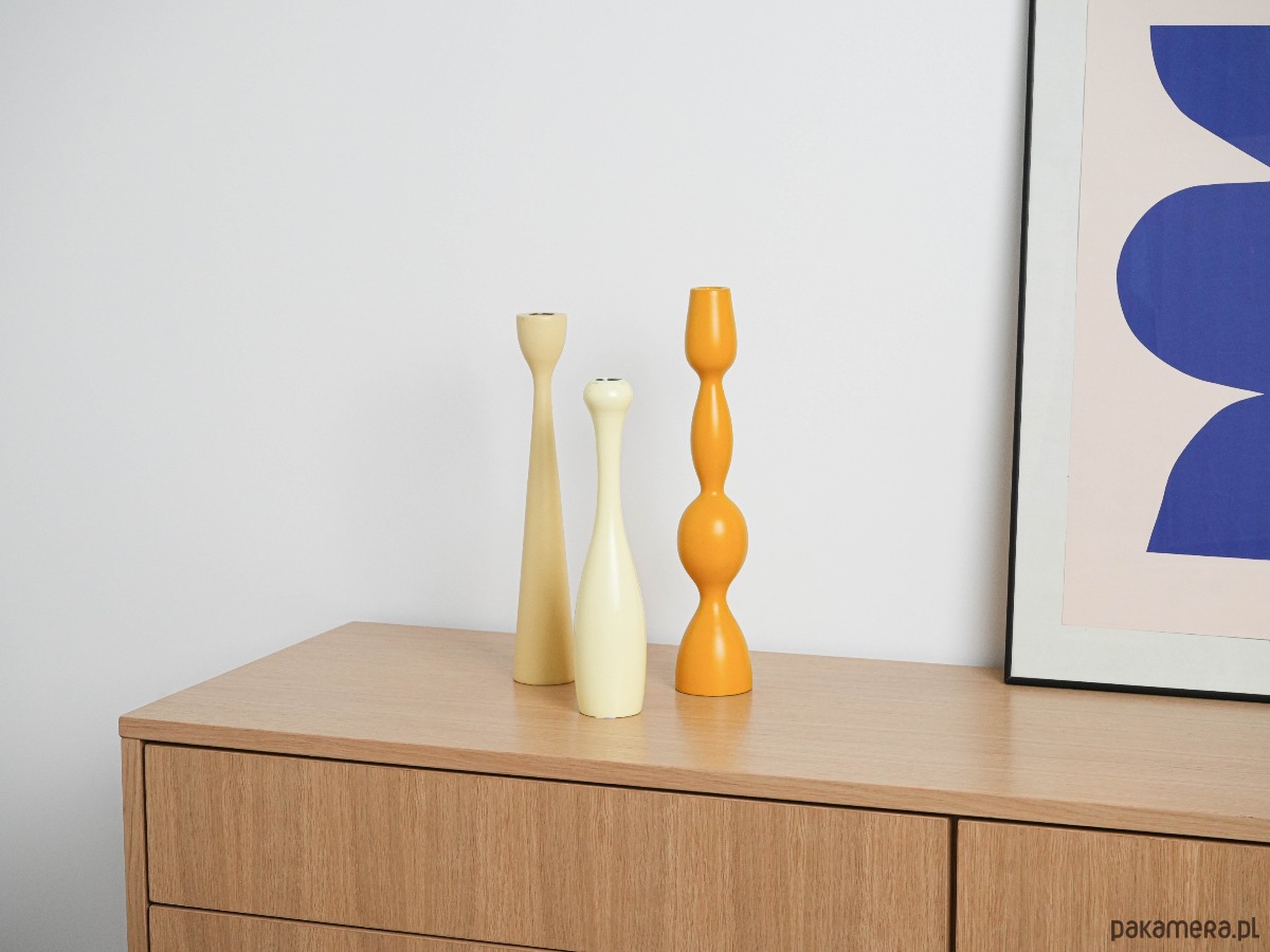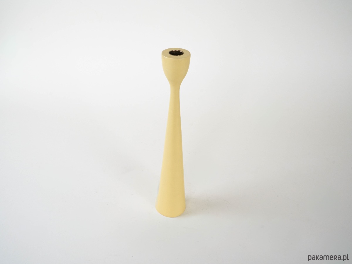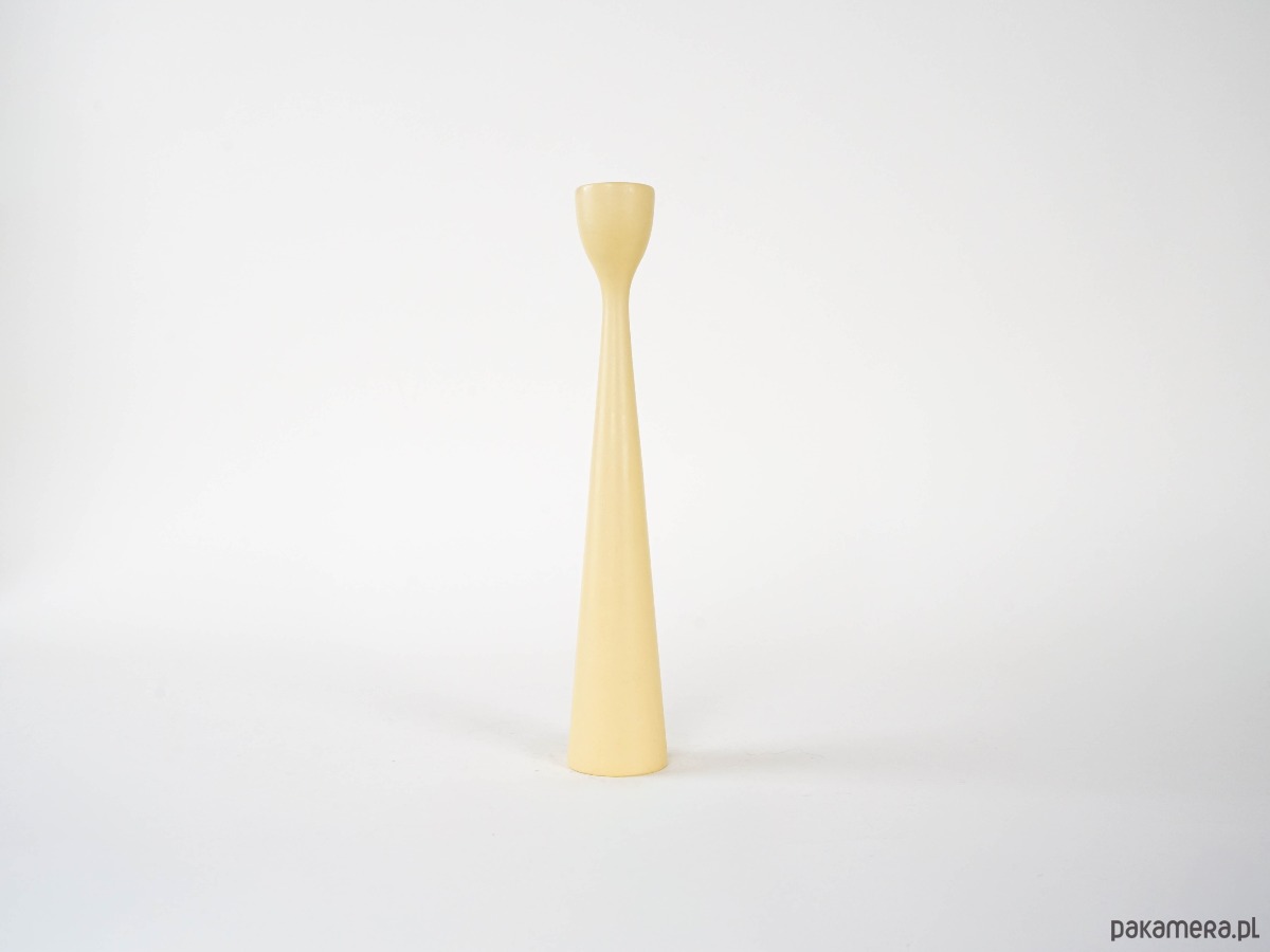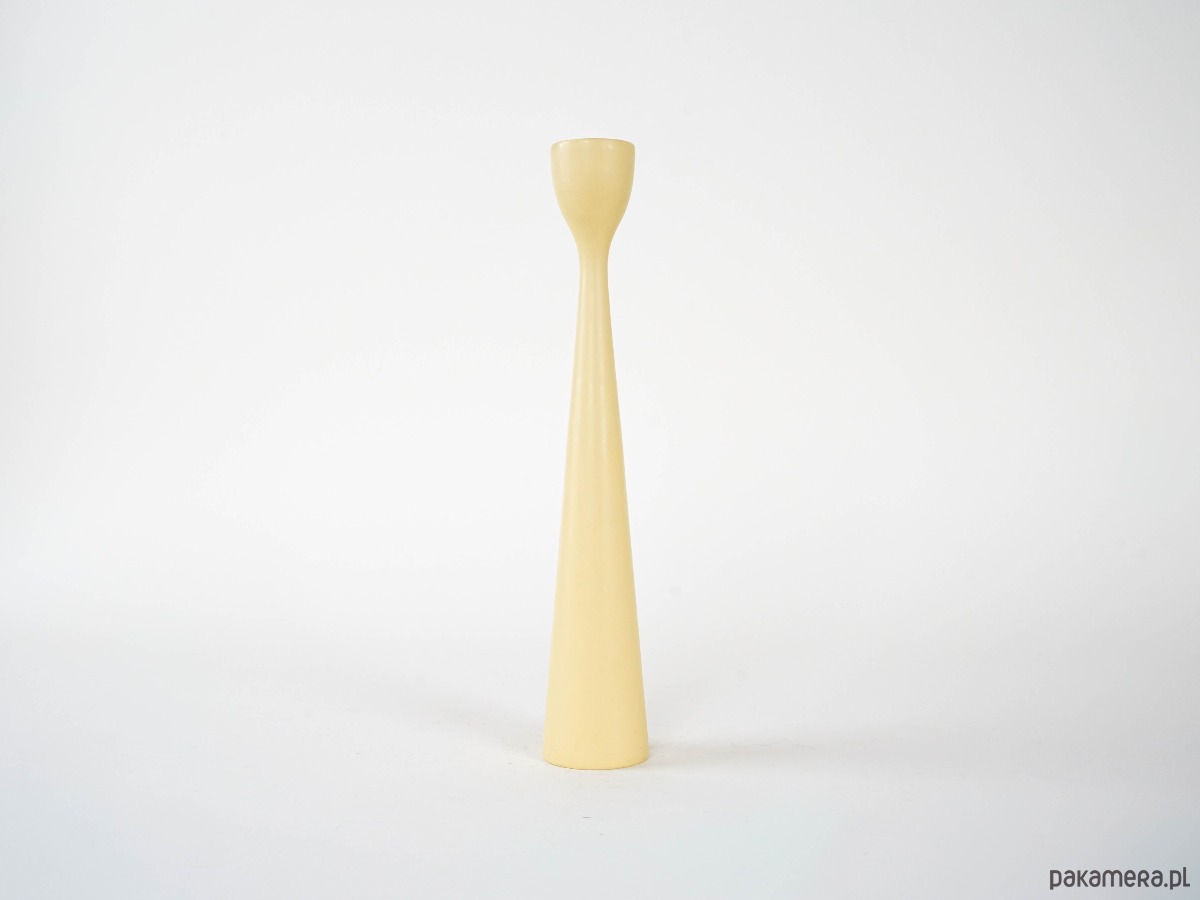 Elegancki świecznik z lat 60./70., wykonany z drewna i pokryty jasną, pastelowo-żółtą emalią. Smukła, stożkowa sylwetka podkreśla modernistyczny charakter przedmiotu, a subtelny kolor dodaje lekkości każdemu wnętrzu. Idealny w duecie z innymi świecznikami w odcieniach musztardowym czy naturalnym drewnie.