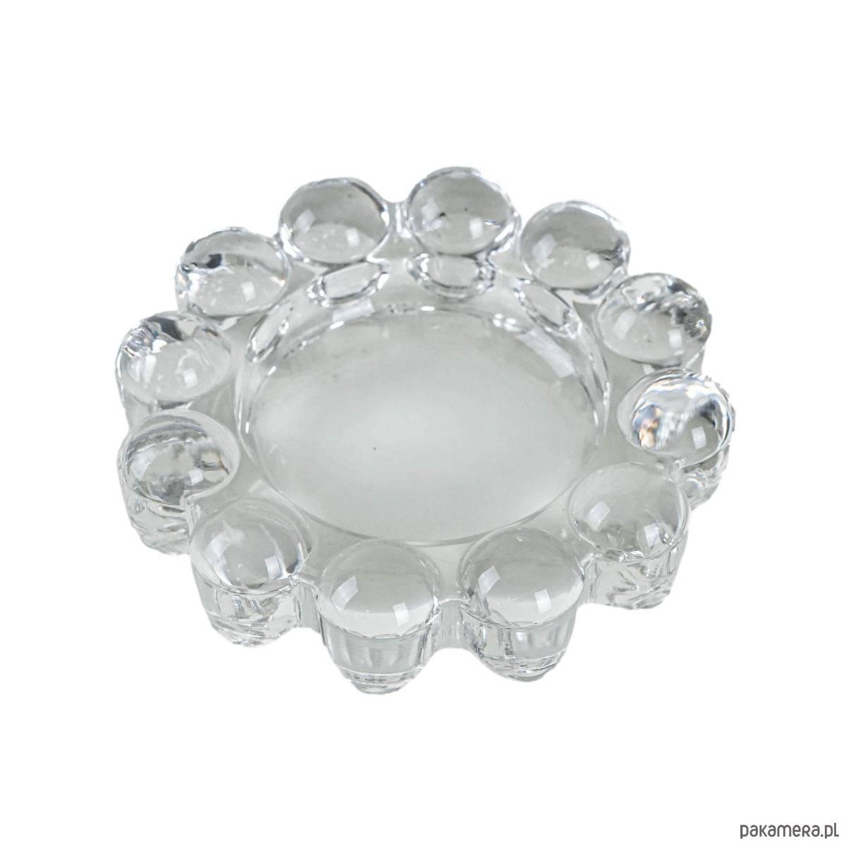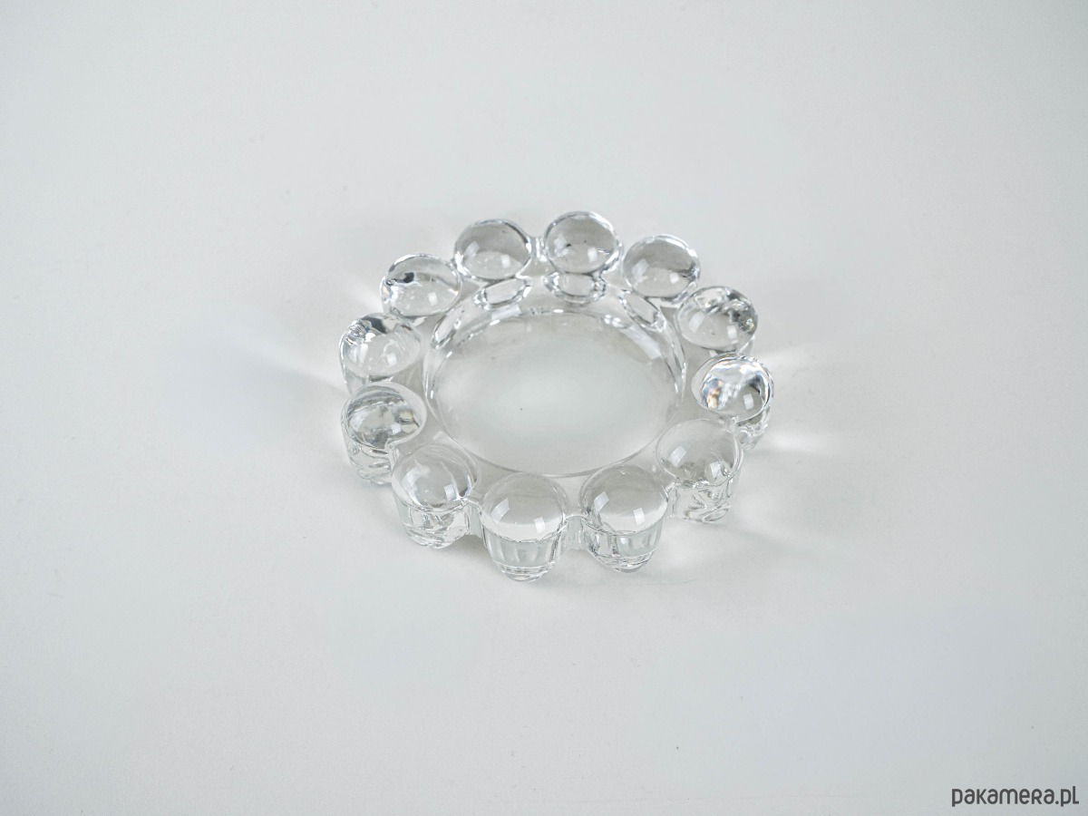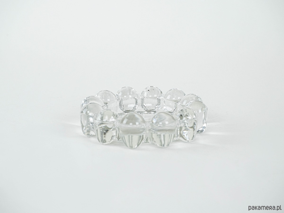 Szklany świecznik lub podstawka na tealight o dekoracyjnej, organicznej formie. Brzeg zdobiony wypukłymi, obłymi elementami przypominającymi krople szkła lub kryształowe perełki, co tworzy efekt świetlnej gry i podkreśla charakter vintage. To przykład wysokiej jakości skandynawskiego szkła użytkowego z okresu mid-century modern.