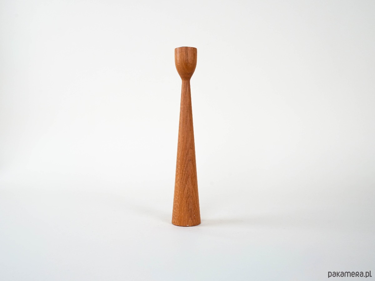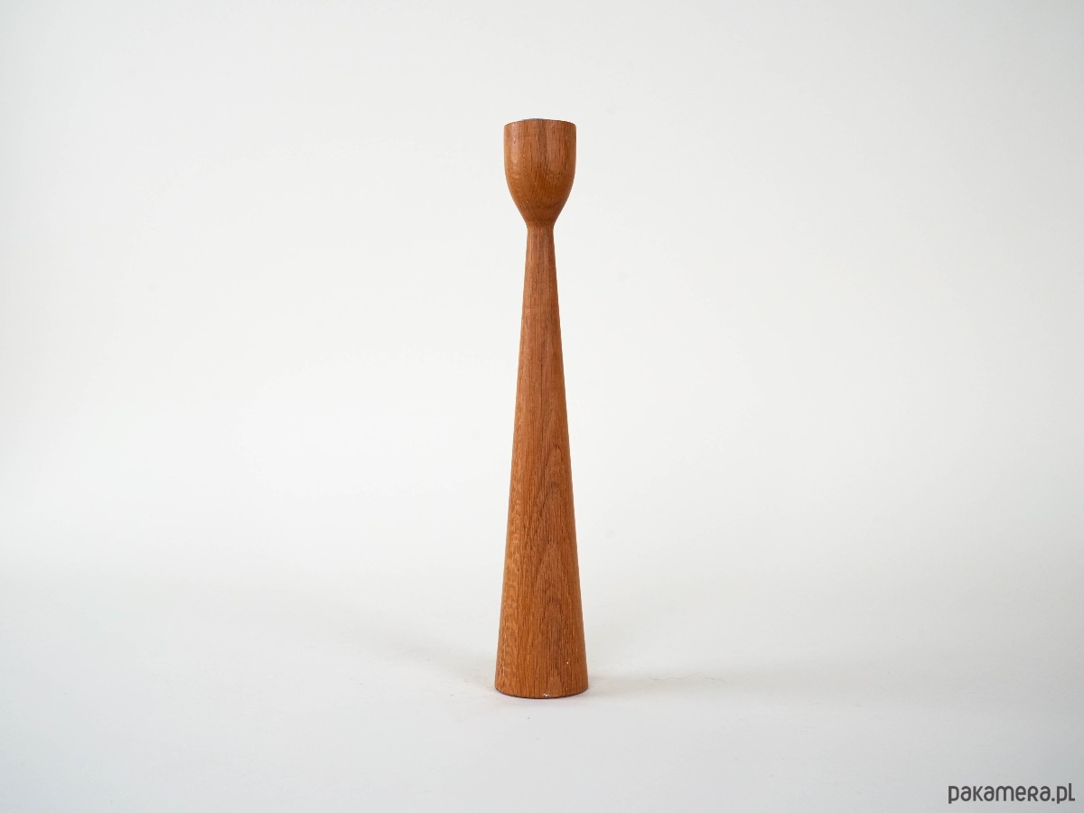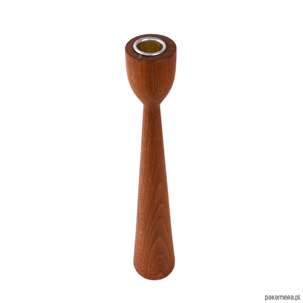 Minimalistyczny świecznik z drewna tekowego, typowy dla skandynawskiego wzornictwa połowy XX wieku. Prosta forma i naturalny odcień drewna sprawiają, że idealnie wpisuje się w estetykę mid-century modern.