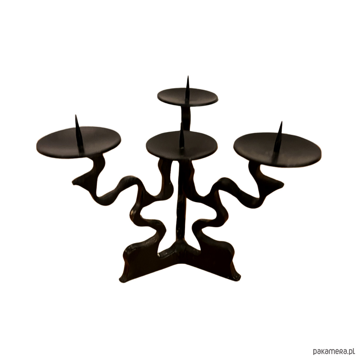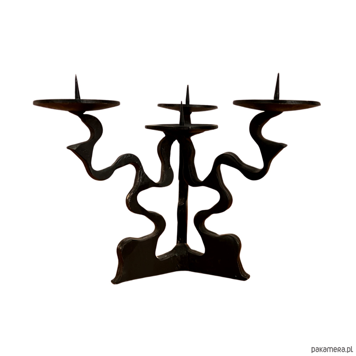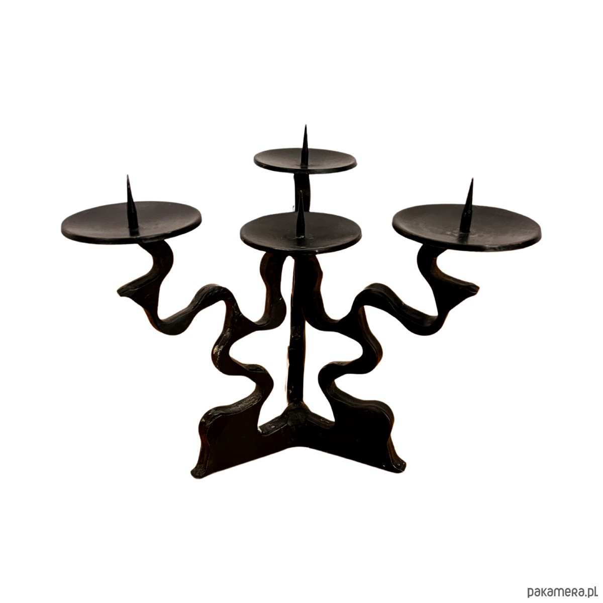 Przedmiot wykonany z kutego metalu, z charakterystyczną, nieregularną strukturą. Przeznaczony jest na 4 świece. Zachowany w bardzo dobrym stanie i niewielkimi śladami czasu. Świecznik jest solidny i stabilny, w pełni funkcjonalny.