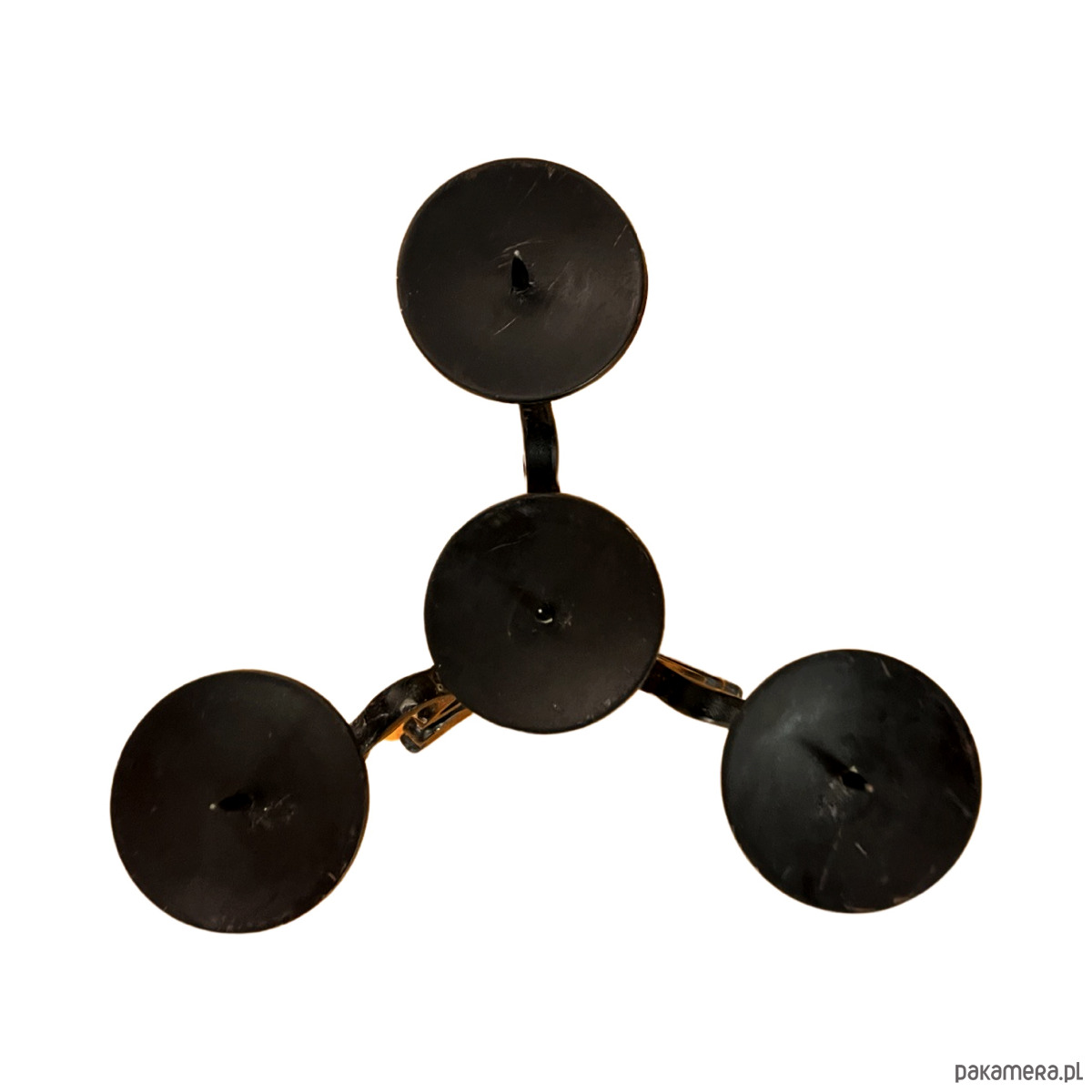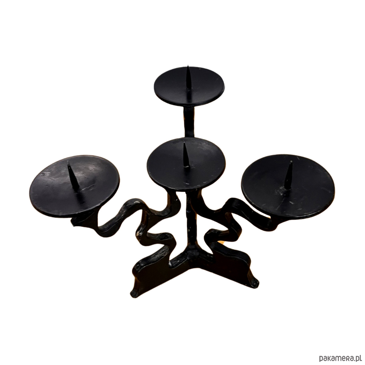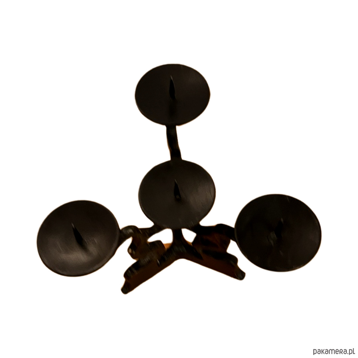 Przedmiot wykonany z kutego metalu, z charakterystyczną, nieregularną strukturą. Przeznaczony jest na 4 świece. Zachowany w bardzo dobrym stanie i niewielkimi śladami czasu. Świecznik jest solidny i stabilny, w pełni funkcjonalny.