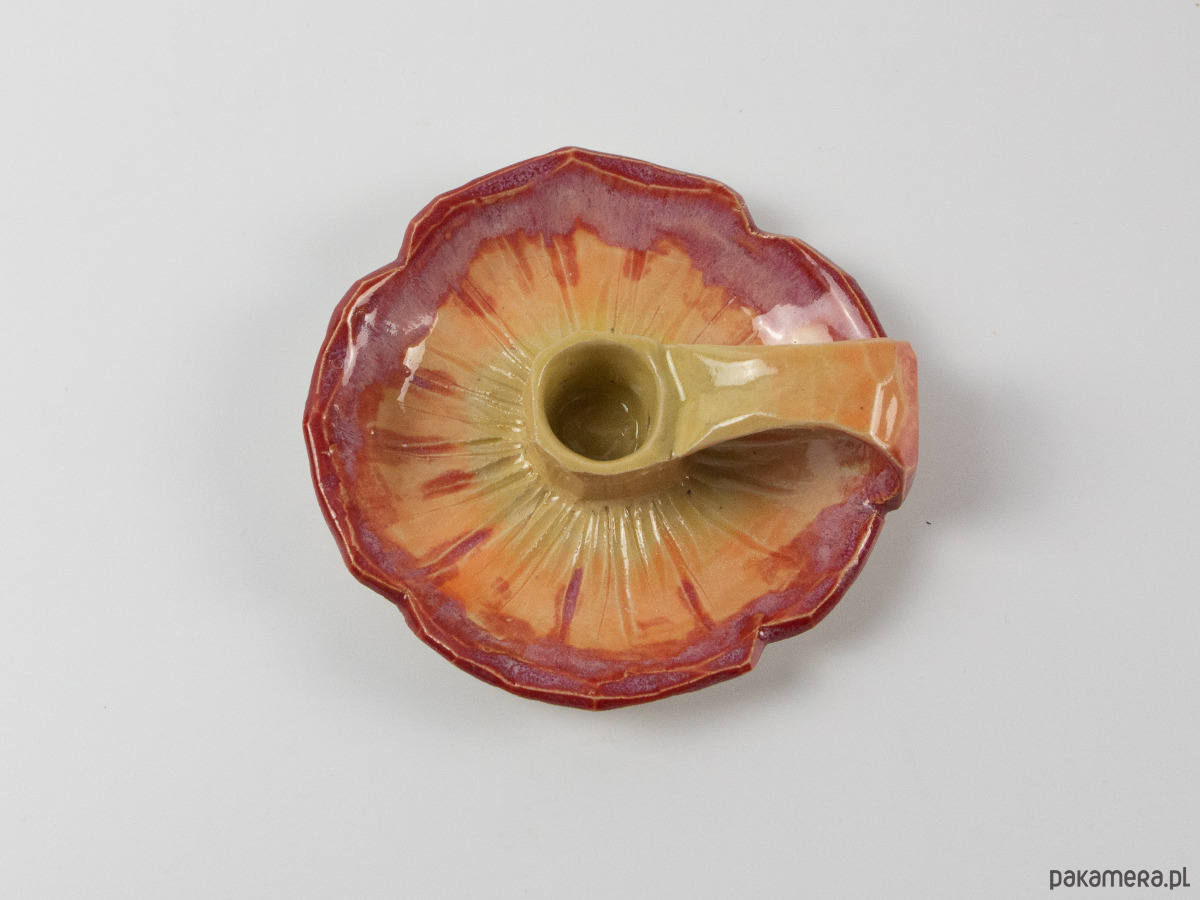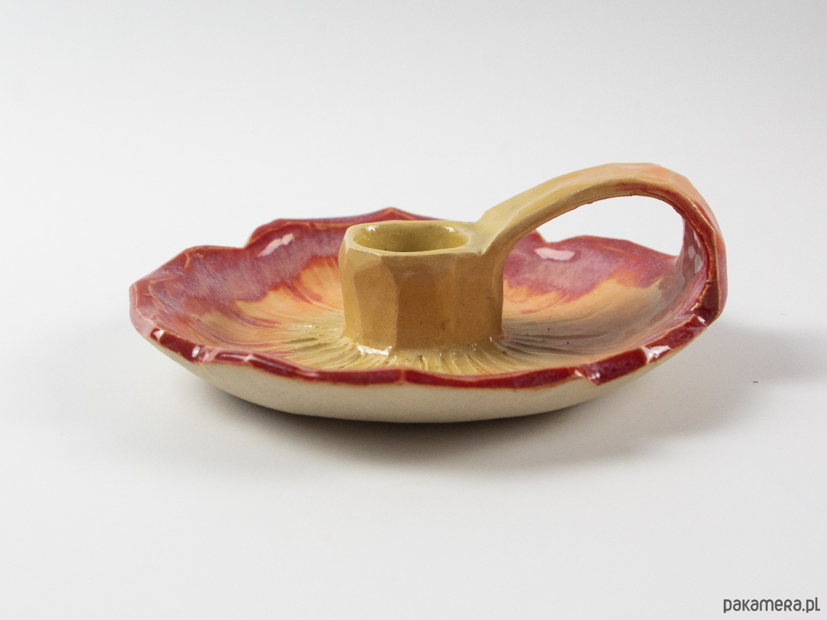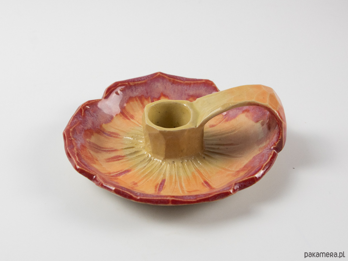 Świecznik-kaganek ręcznie wykonany z jasnej gliny, szkliwiony na kolory zachodu słońca - żółty, pomarańczowy i czerwony.. Dzięki uchwytowi można łatwo przenosić zapaloną świecę.