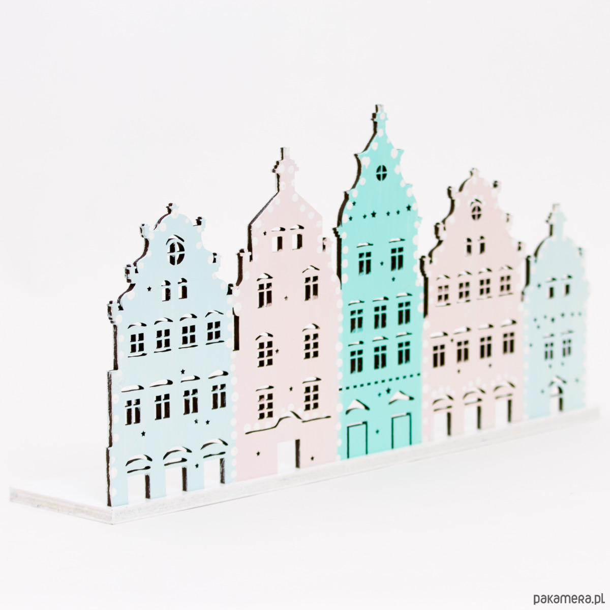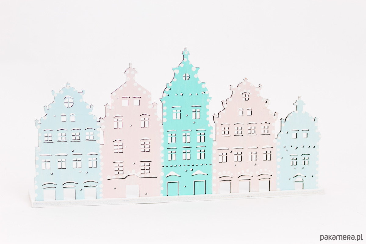 Urokliwe kamieniczki z podstawką,w pastelowych kolorach, chętnie ozdobią każdą półkę, kominek czy inne potrzebujące tego miejsce. Mogą też pełnić funkcję świecznika, postawione za nimi tealighty lub świeczki wprowadzają niezwykły klimat.