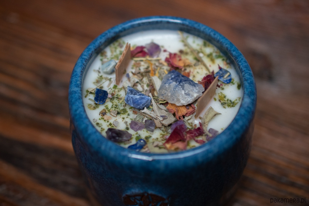 Podstawowym składnikiem naszych świec jest wosk sojowy oraz olej i susz konopny. Na tej bazie proponujemy pobudzić kreatywność i intuicję, a zainspiruje nas do tego kompozycja olejków eterycznych, kamieni z intencjami i suszonych ziół. Nasza niebieska świeca poukłada nasze skołatane myśli, dzięki zapachowi olejku jaśminowego. Aromat pędu słodkiego groszku ma również kojący wpływ na nasze nerwy. Kiedy już będziemy się czuli wyciszeni, nuta orchidei delikatnie pobudzi naszą pomysłowość do działania. Kawałki białej szałwii oczyszczą przestrzeń i zrobią wolną drogę dla dotarcia dla naszej intuicji. Kreatywność pobudzają piękne kolory mieszanki malin, wrzosu i róży. Ametyst wzmacnia siłę charakteru i wolnej woli w połączeniu z duchową harmonią. Lapis lazur wspomaga organizację myśli i automotywację, polepsza koncentrację. Kompozycja obu kamieni wzmacnia pozytywny przepływ energii, dzięki zauważeniu pozytywnych skutków, realistycznego podejścia do życia. Dzięki zadbaniu o higienie naszego otoczenia intuicja dociera do naszej pomysłowości bez energetycznych przeszkód.
