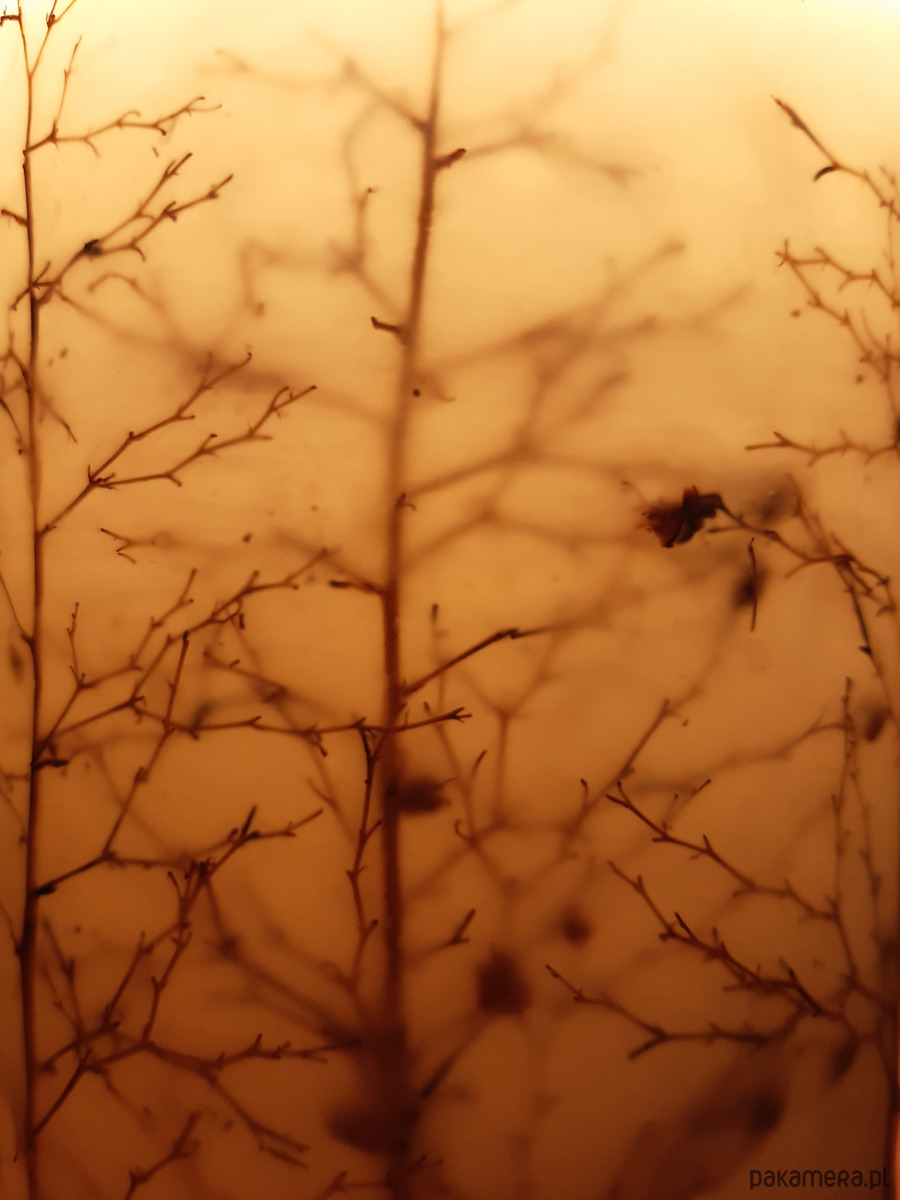 Świeca lampionowa ręcznie wykonana, z zatopionymi gałązkami wyglądającymi jak drzewa w zimowym lesie.