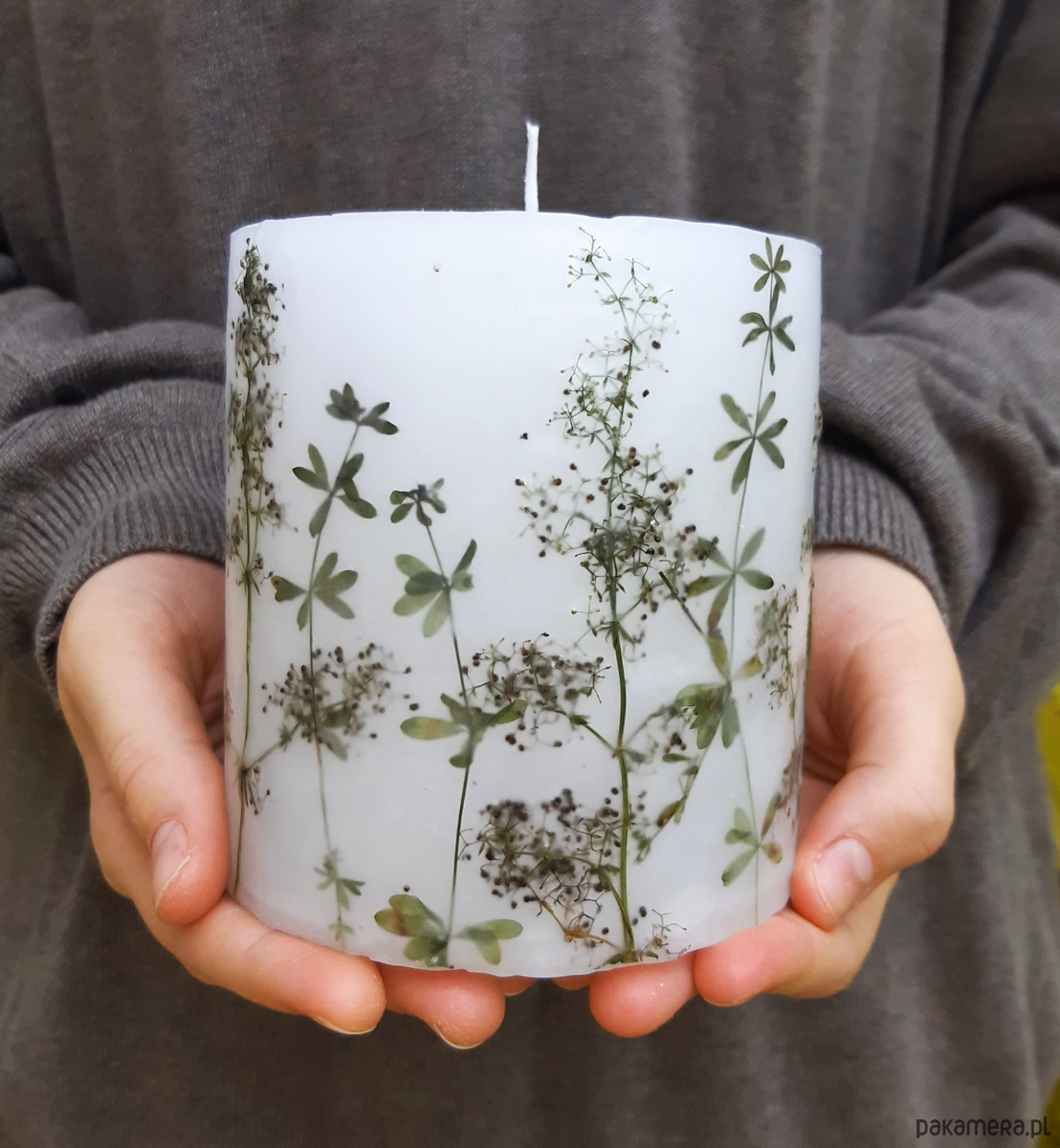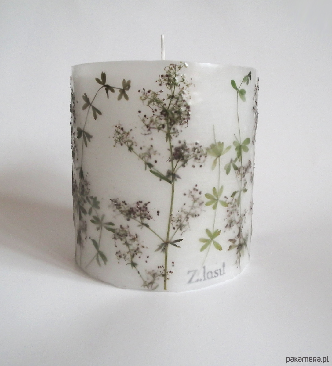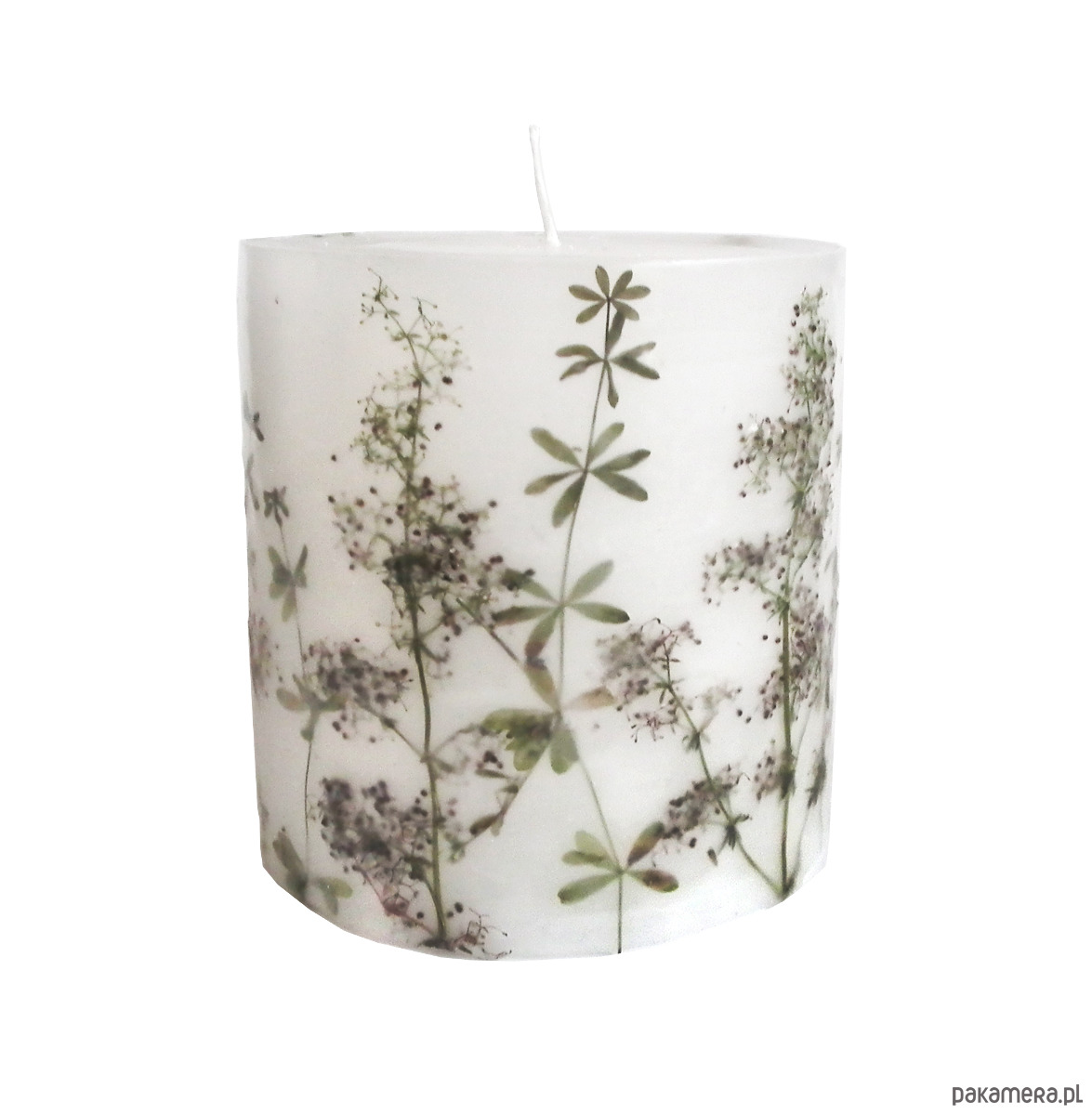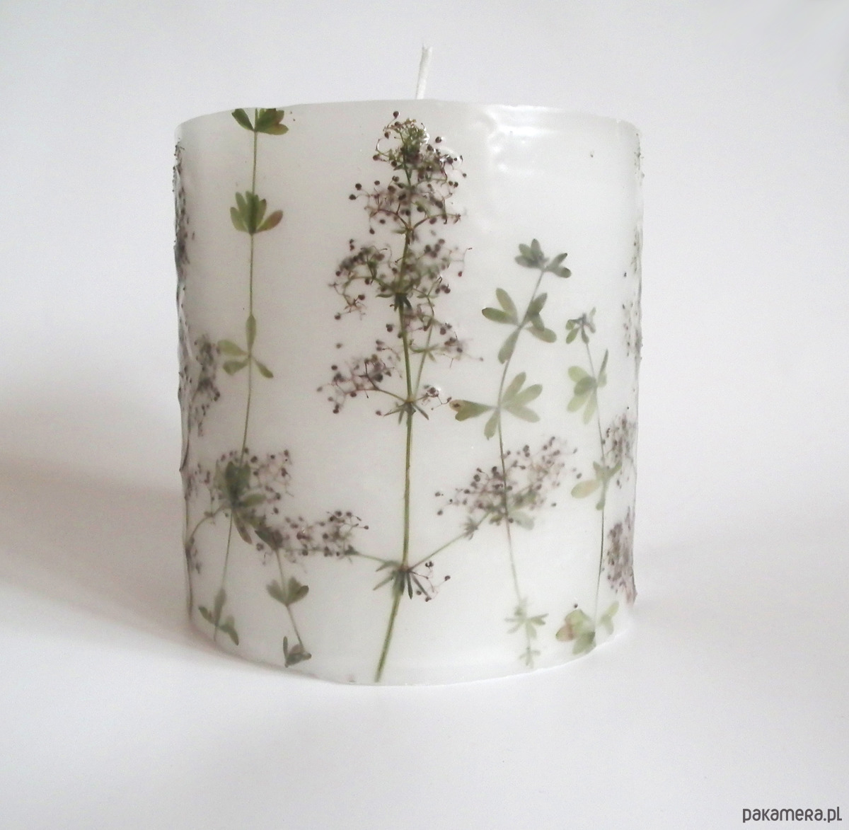 Duża świeca lampionowa ręcznie wykonana, z zatopionymi suszonymi gałązkami przytulii.