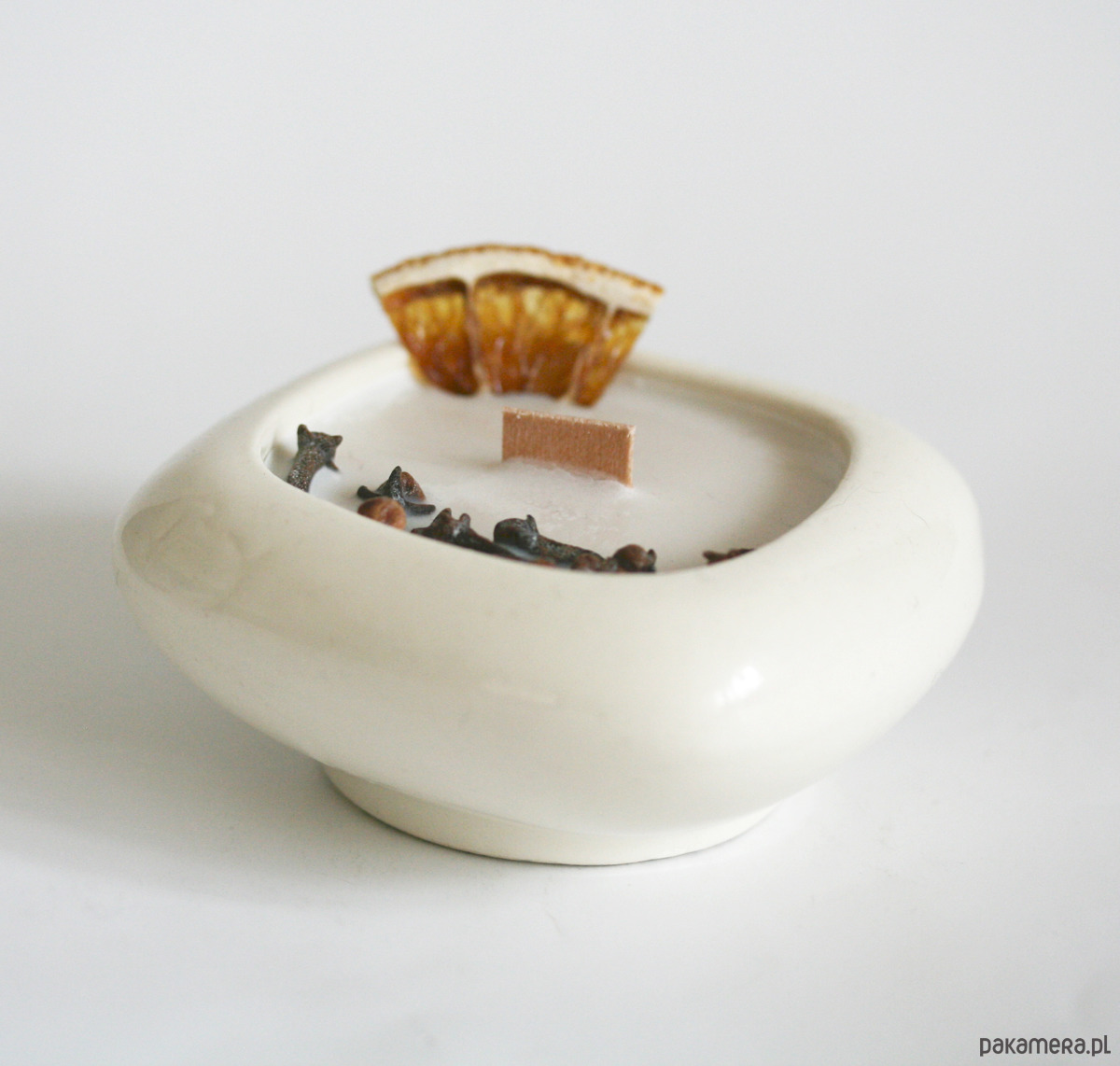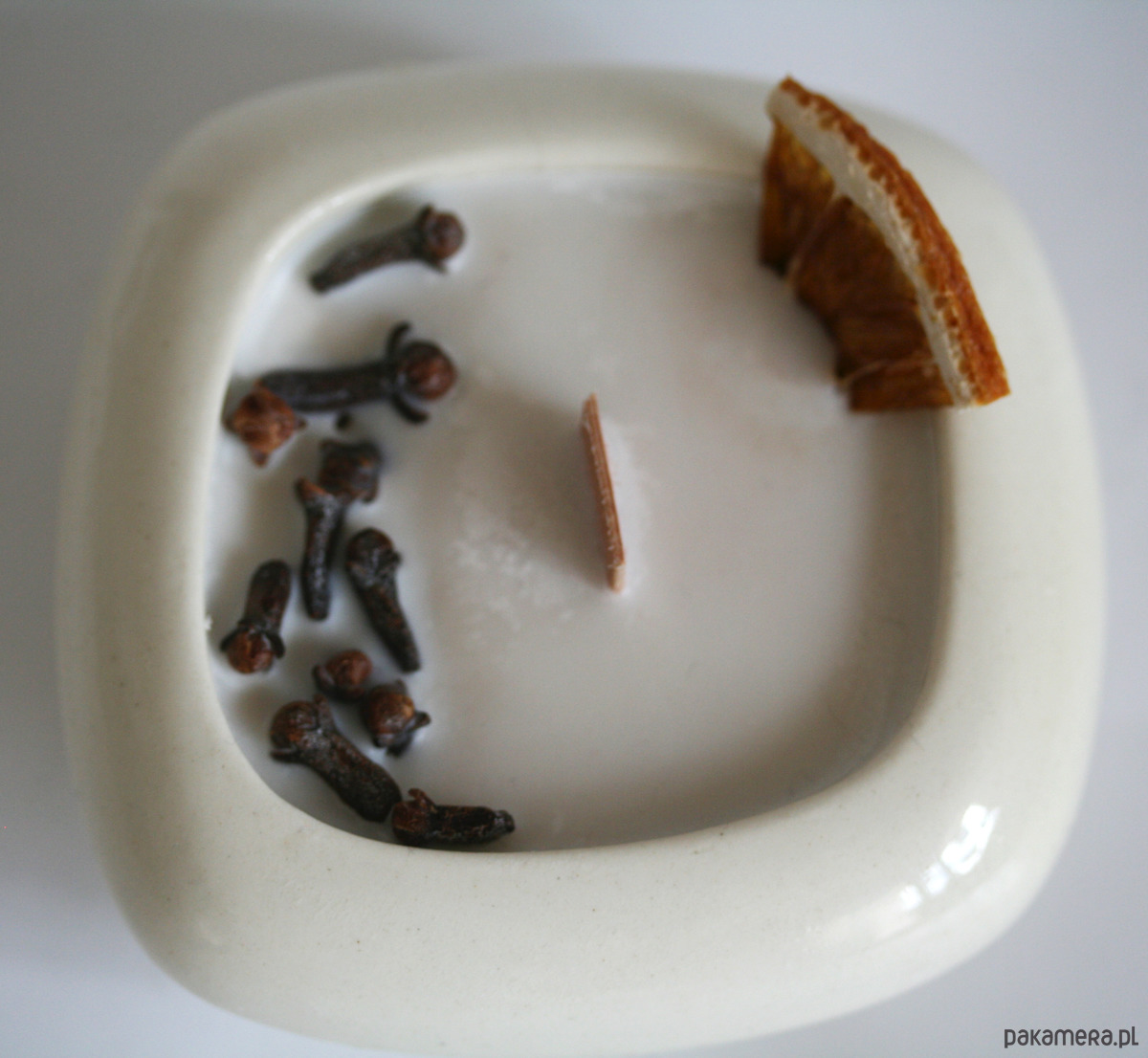 Wykonana z przyprawami korzennymi, ozdobiona goździkami i suszoną pomarańczą.