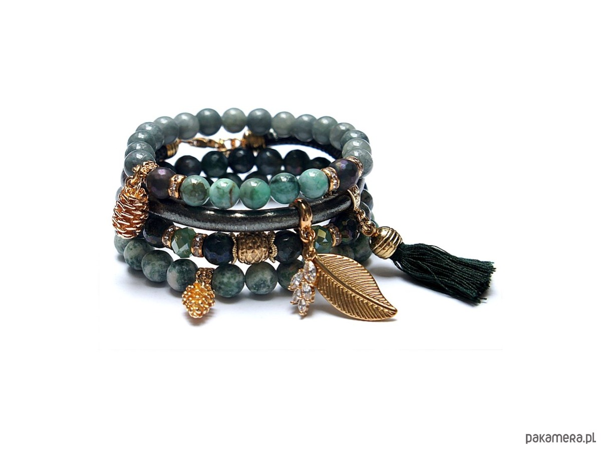 Komplet czterech bransoletek wykonanych z naturalnych kamieni: szmaragdy [8mm], agat fasetowany, platerowany [8mm], jaspis matowy [8mm], marmur [8mm], hematyt fasetowany, platerowany [8mm], kryształki fasetowane [8mm], zawieszki wysadzanej cyrkoniami, chwostu, rzemienia z ekologicznej skórki [6mm] oraz elementów metalowych w kolorze złota. Bransoletki pasują na nadgarstek 15 - 16cm. Biżuteria ozdobnie zapakowana