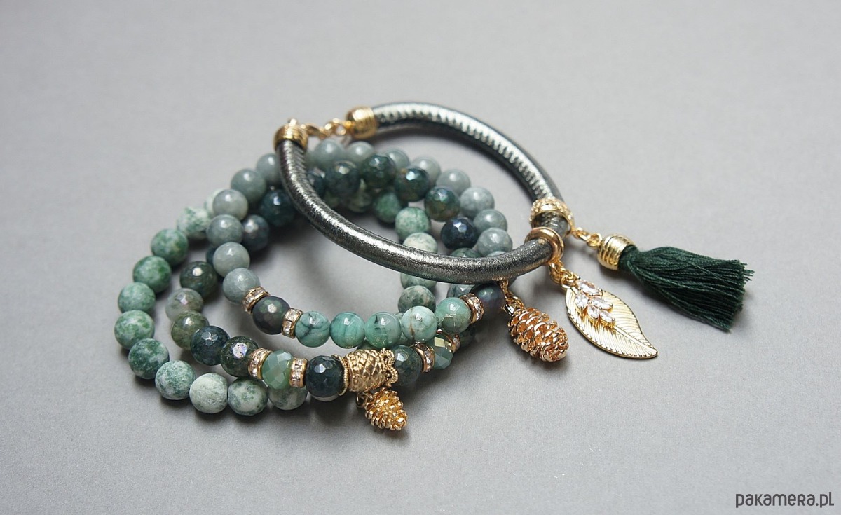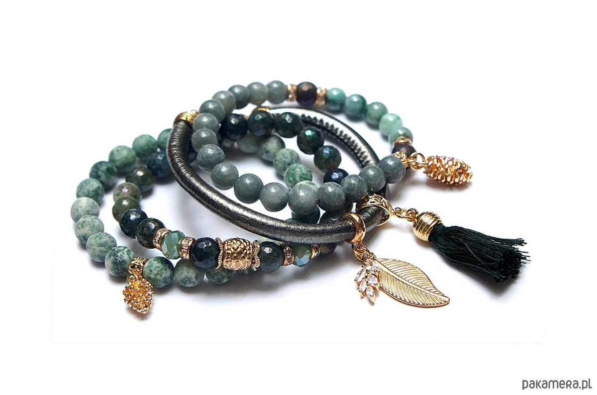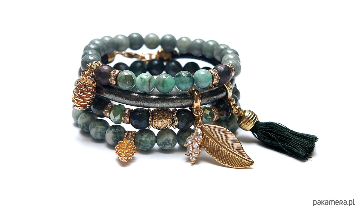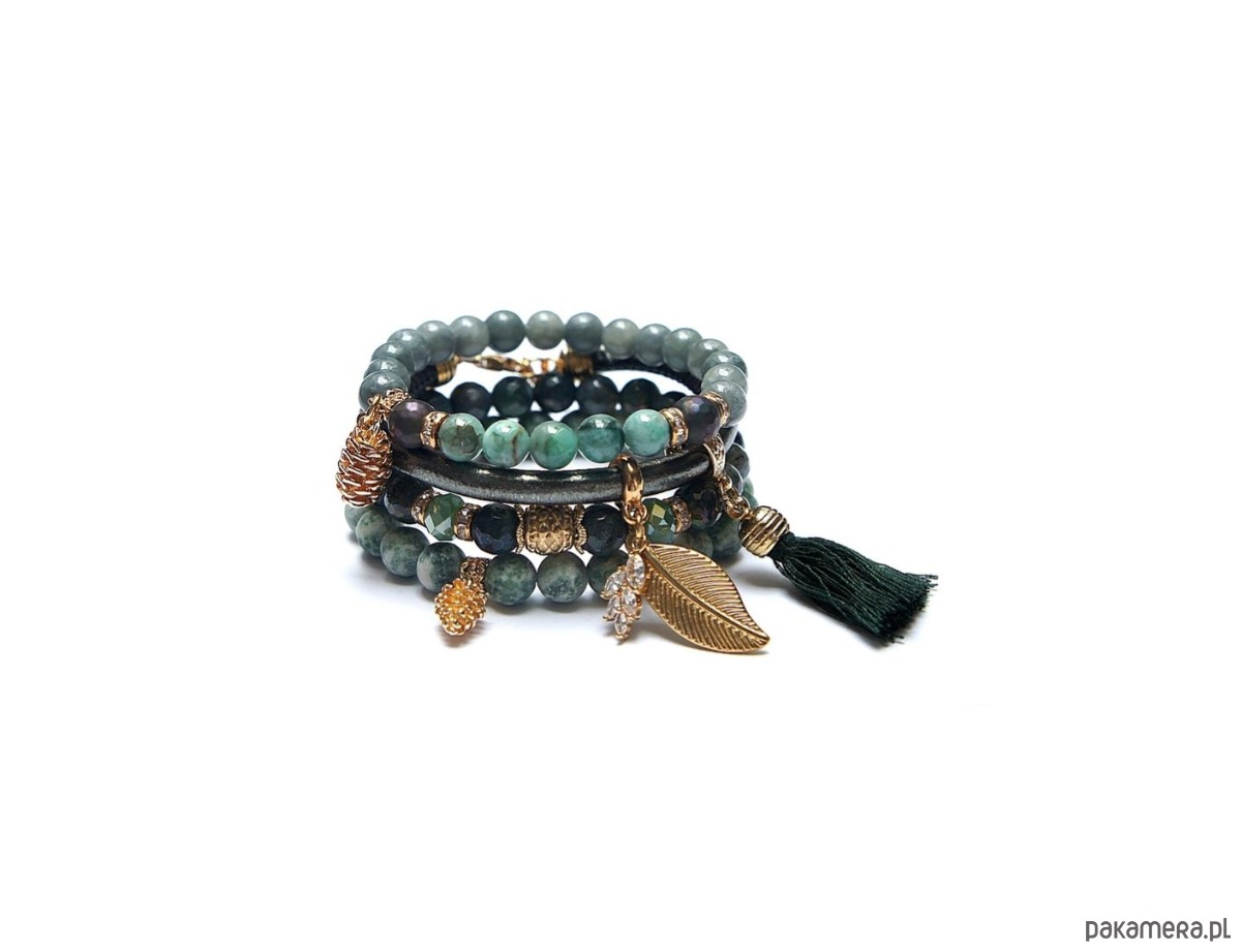 Komplet czterech bransoletek wykonanych z naturalnych kamieni: szmaragdy [8mm], agat fasetowany, platerowany [8mm], jaspis matowy [8mm], marmur [8mm], hematyt fasetowany, platerowany [8mm], kryształki fasetowane [8mm], zawieszki wysadzanej cyrkoniami, chwostu, rzemienia z ekologicznej skórki [6mm] oraz elementów metalowych w kolorze złota. Bransoletki pasują na nadgarstek 15 - 16cm. Biżuteria ozdobnie zapakowana