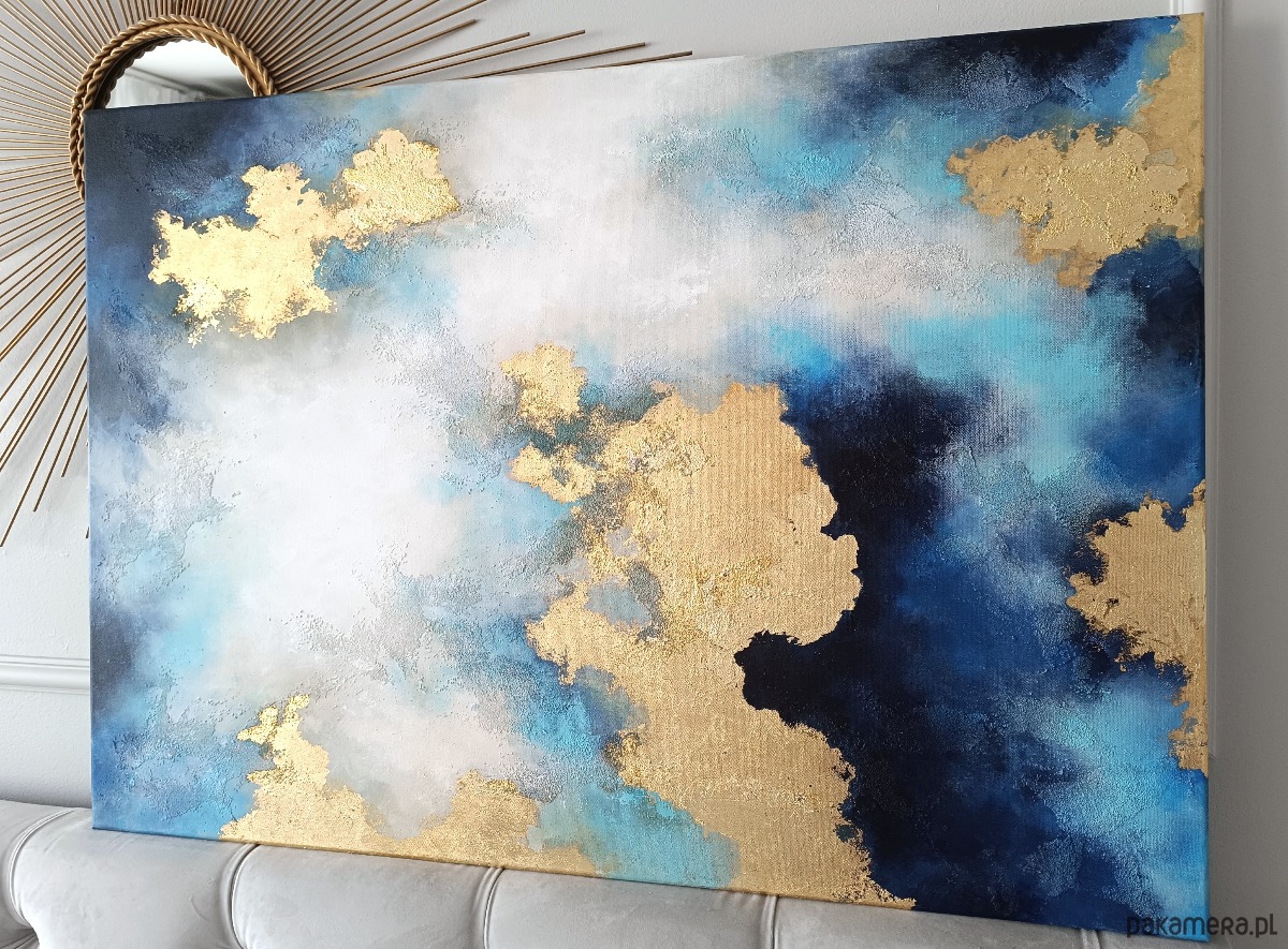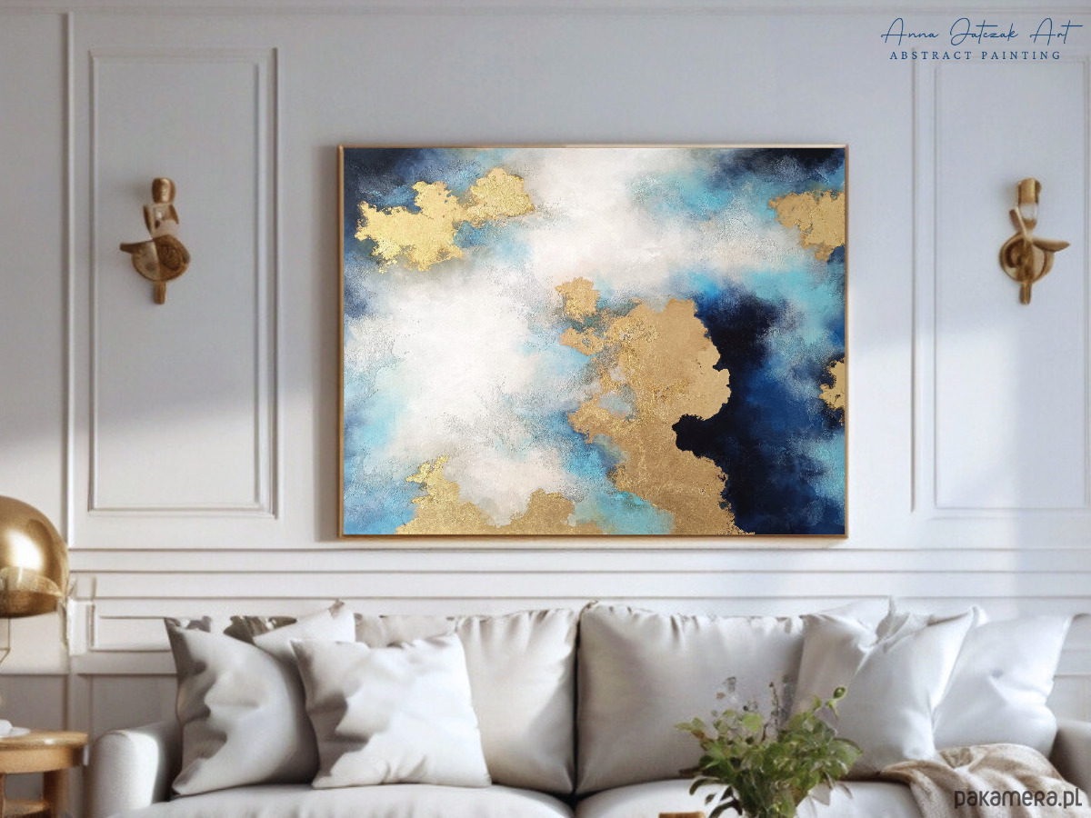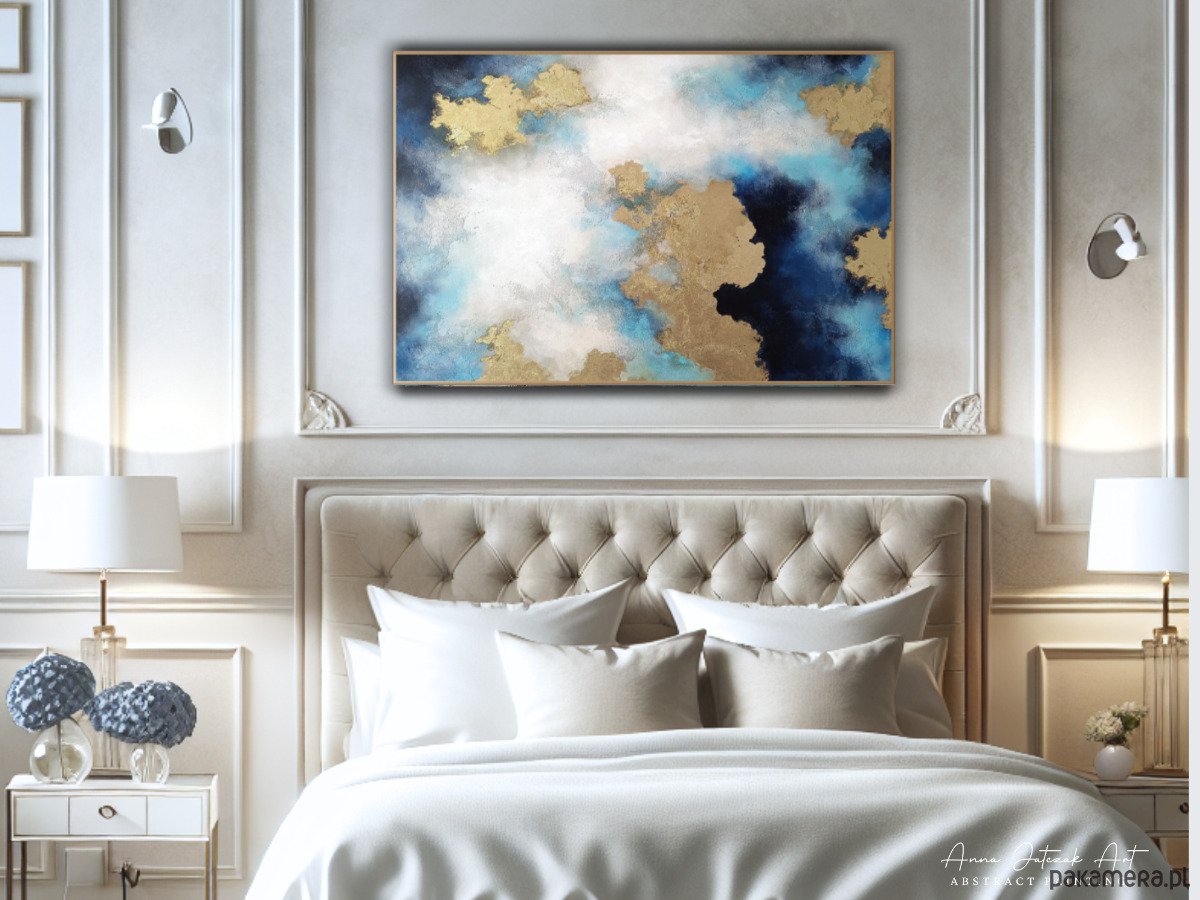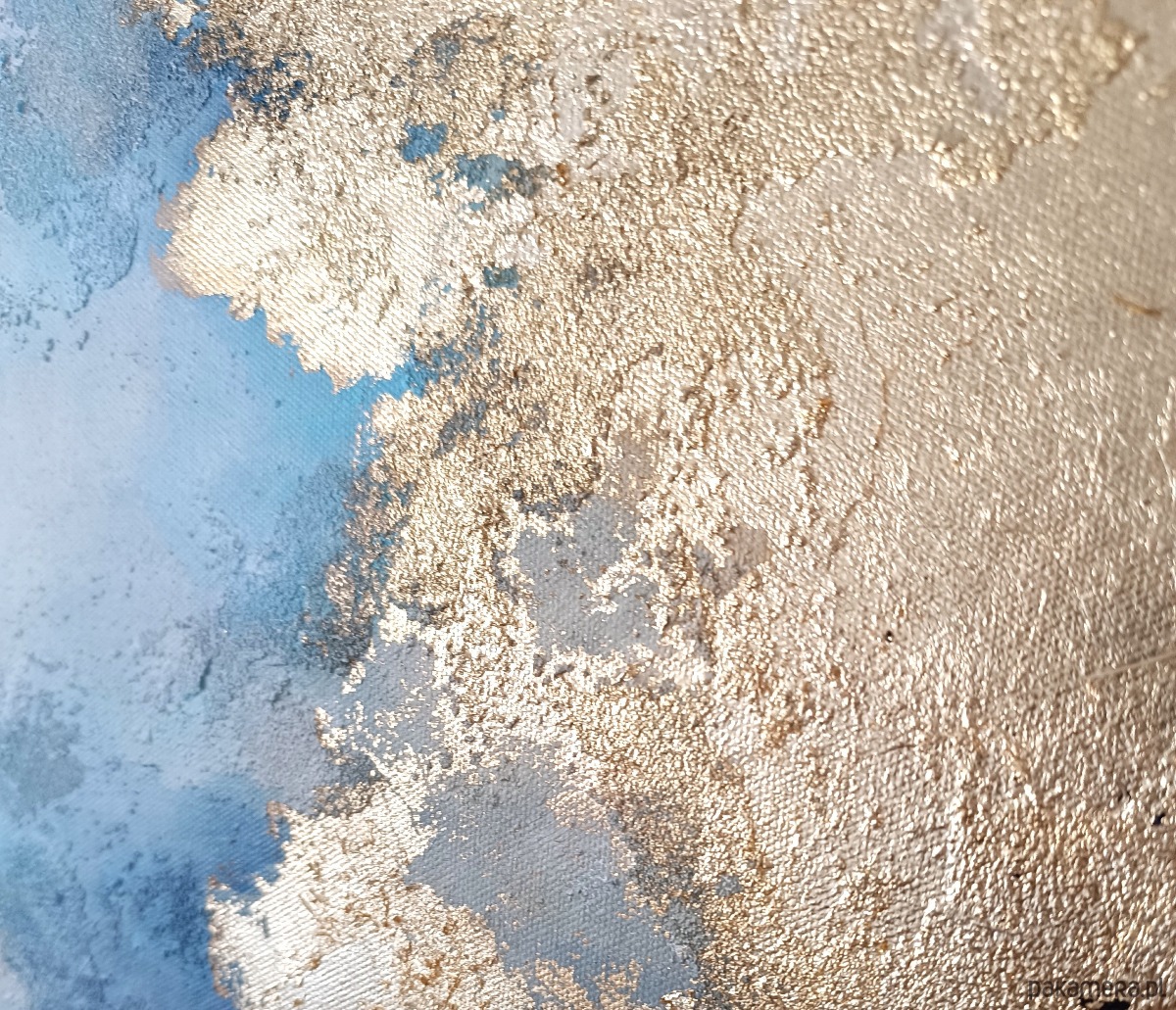 "Świetlisty Horyzont" Abstrakcyjny obraz inspirowany przestrzenią nieba i morza, w którym błękity, turkusy i granaty spotykają się z świetlistymi refleksami złota. Złote akcenty delikatnie mienią się w świetle, tworząc wrażenie ruchu, głębi i spokoju — jak promienie słońca odbijające się na powierzchni wody.