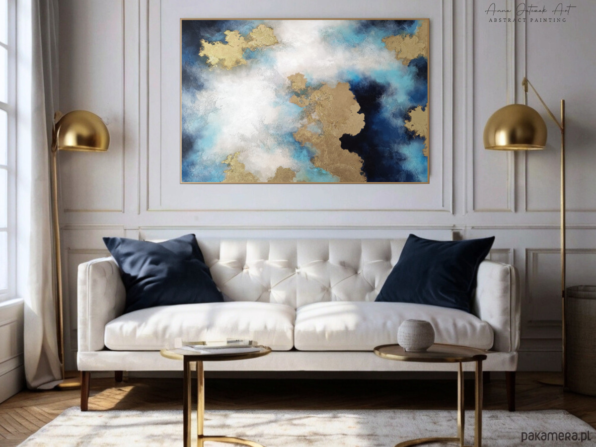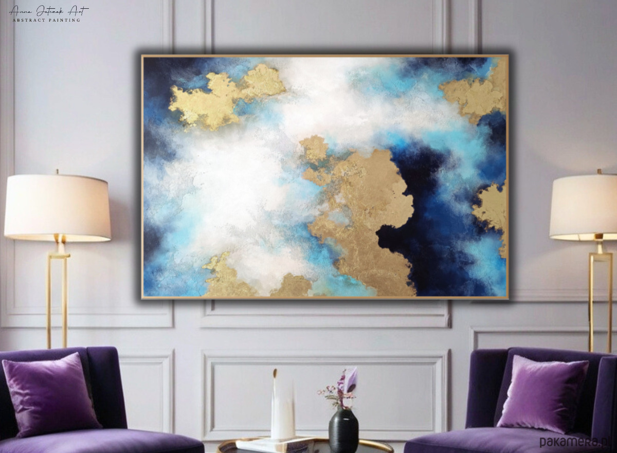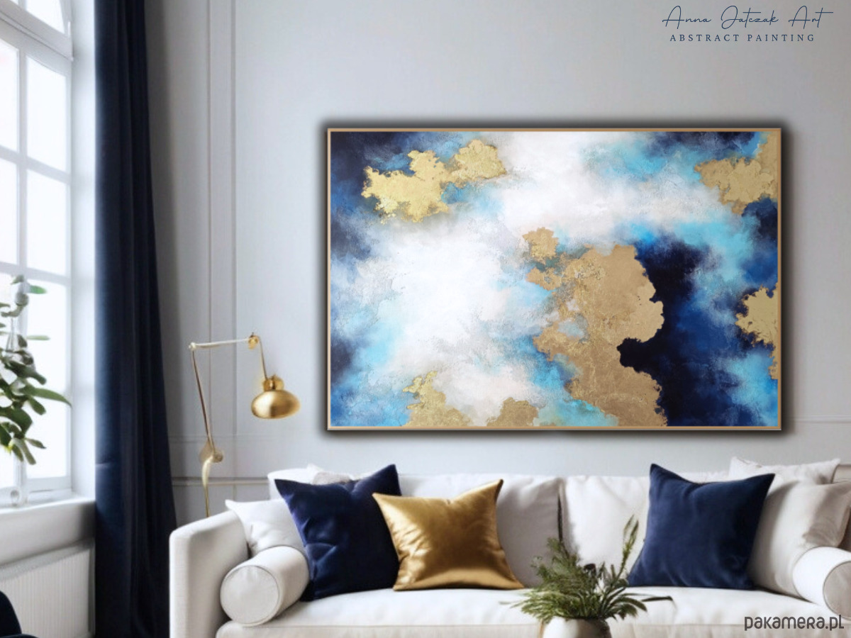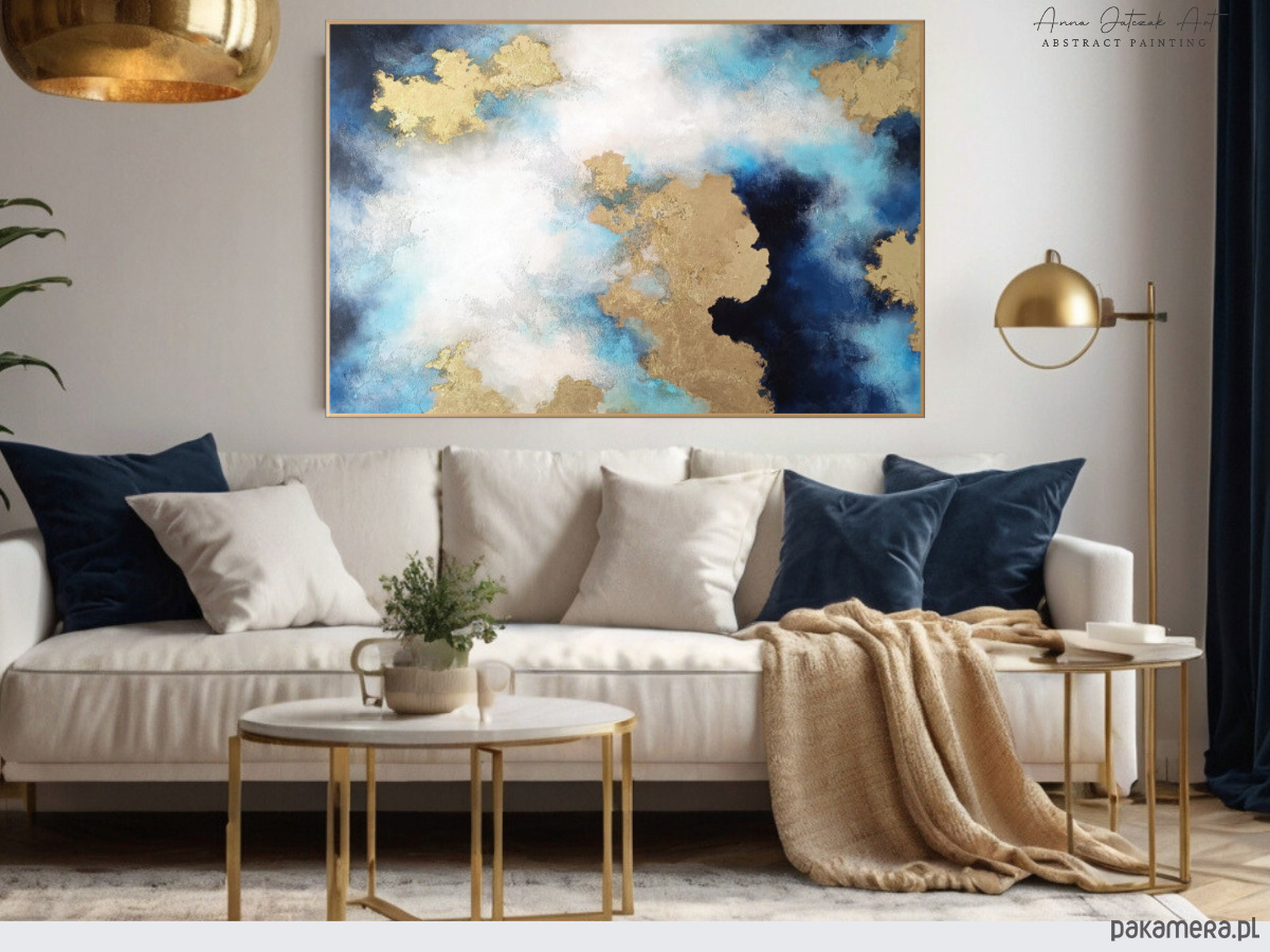 "Świetlisty Horyzont" Abstrakcyjny obraz inspirowany przestrzenią nieba i morza, w którym błękity, turkusy i granaty spotykają się z świetlistymi refleksami złota. Złote akcenty delikatnie mienią się w świetle, tworząc wrażenie ruchu, głębi i spokoju — jak promienie słońca odbijające się na powierzchni wody.