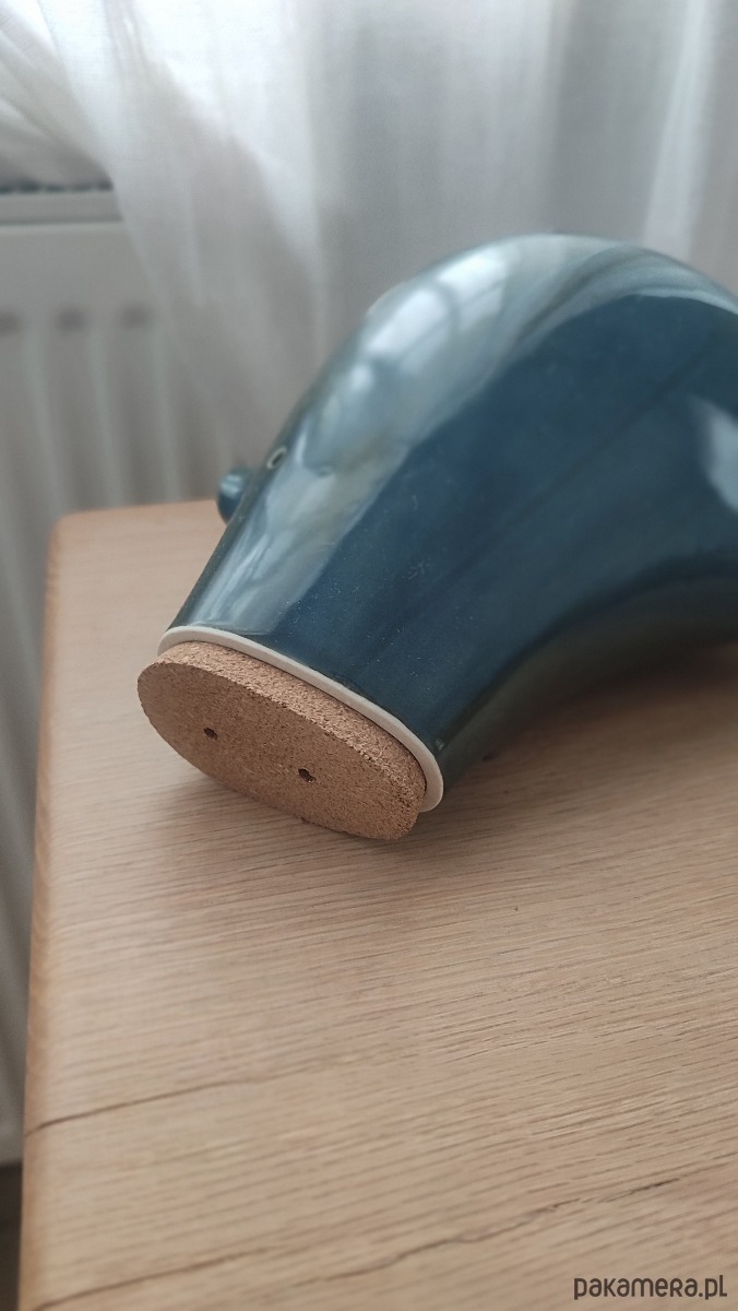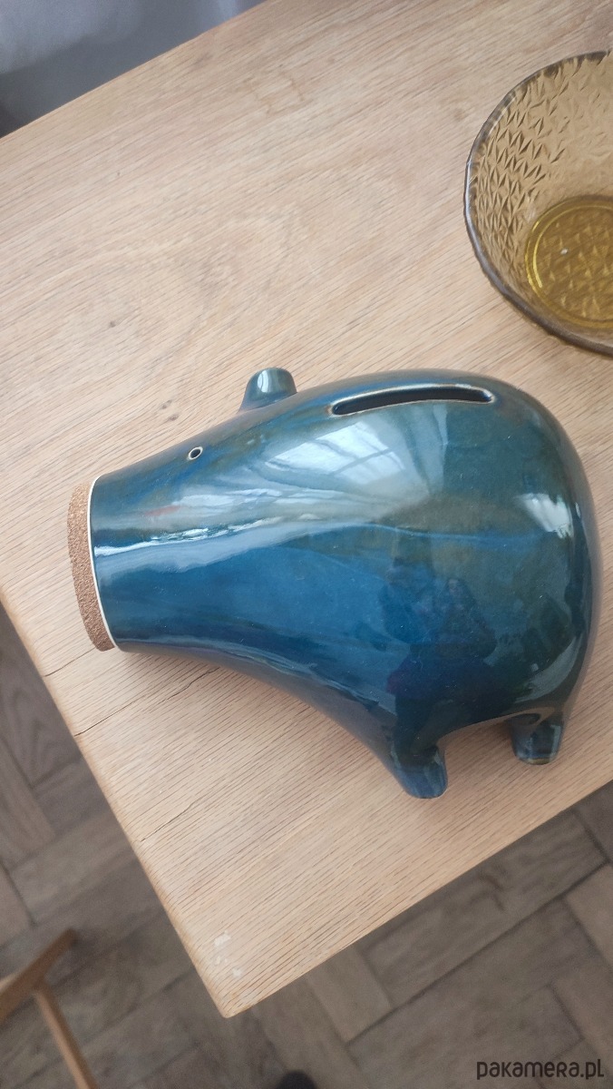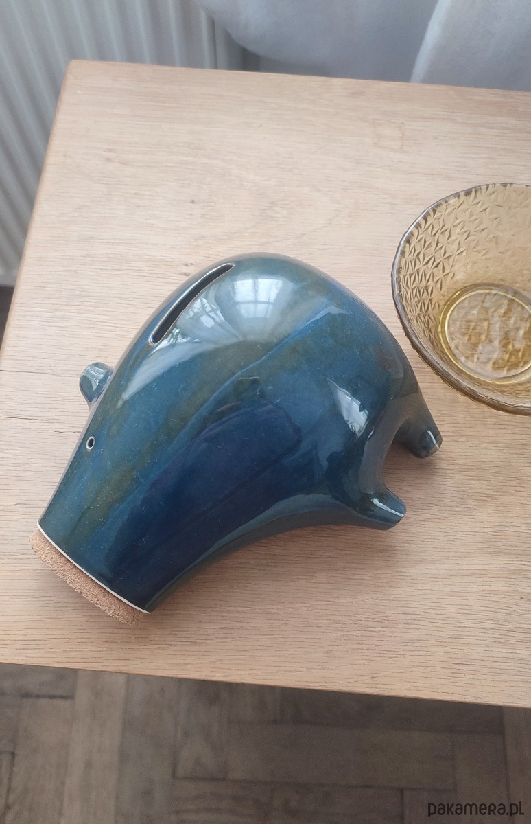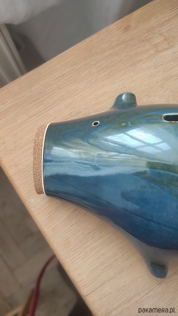 Ta unikatowa świnka została wykonana z przyjemnej, szkliwionej kamionki i naturalnego korka. Każdy korek jest indywidualnie wycinany i dopasowywany do konkretnej świnki. Jej wymiary wynoszą 17 x 15 x 10 cm.