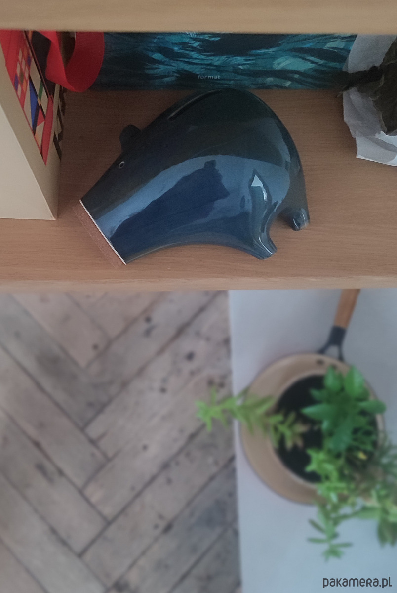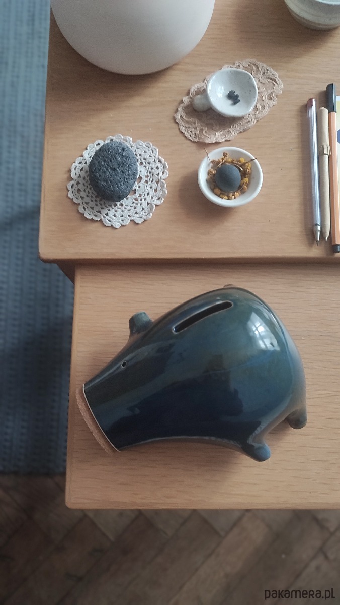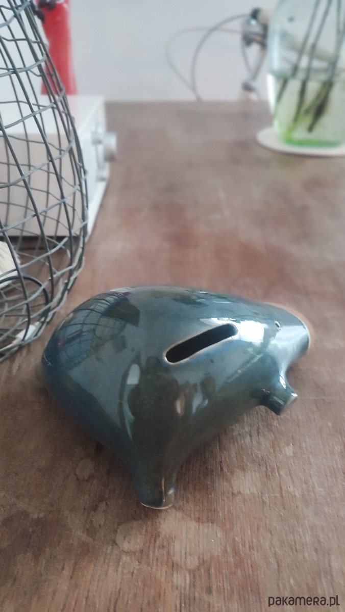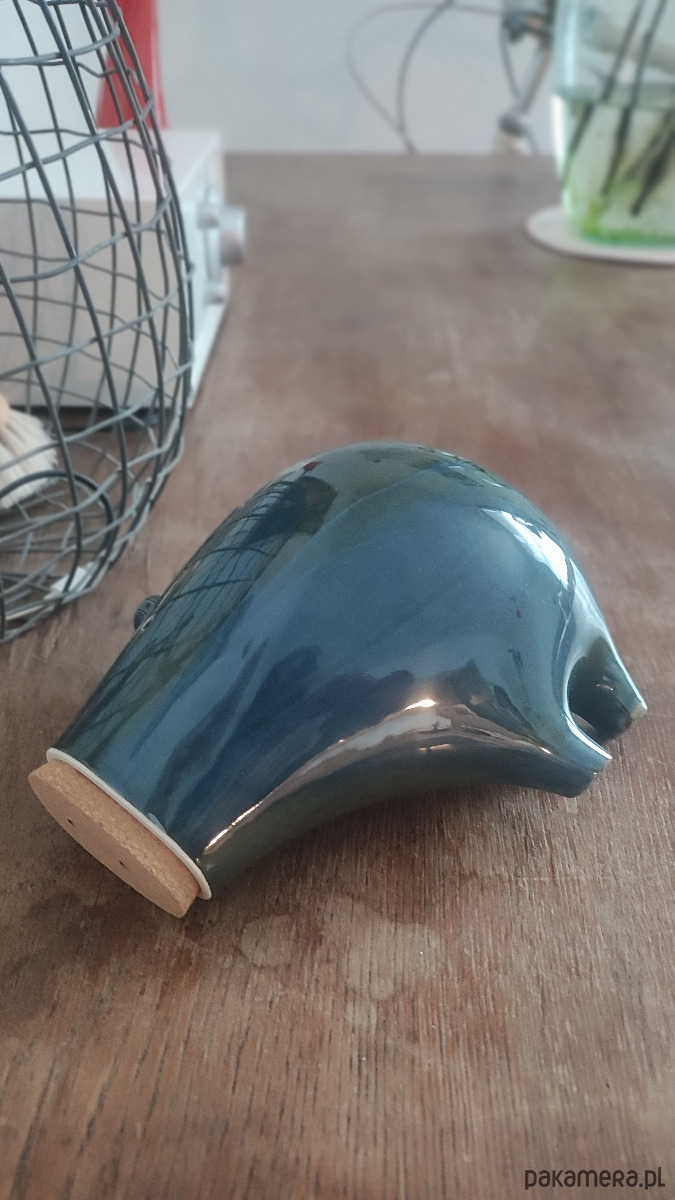 Ta unikatowa świnka została wykonana z przyjemnej, szkliwionej kamionki i naturalnego korka. Każdy korek jest indywidualnie wycinany i dopasowywany do konkretnej świnki. Jej wymiary wynoszą 17 x 15 x 10 cm.