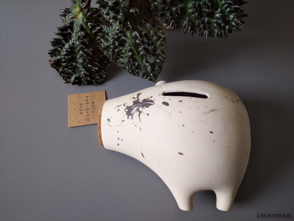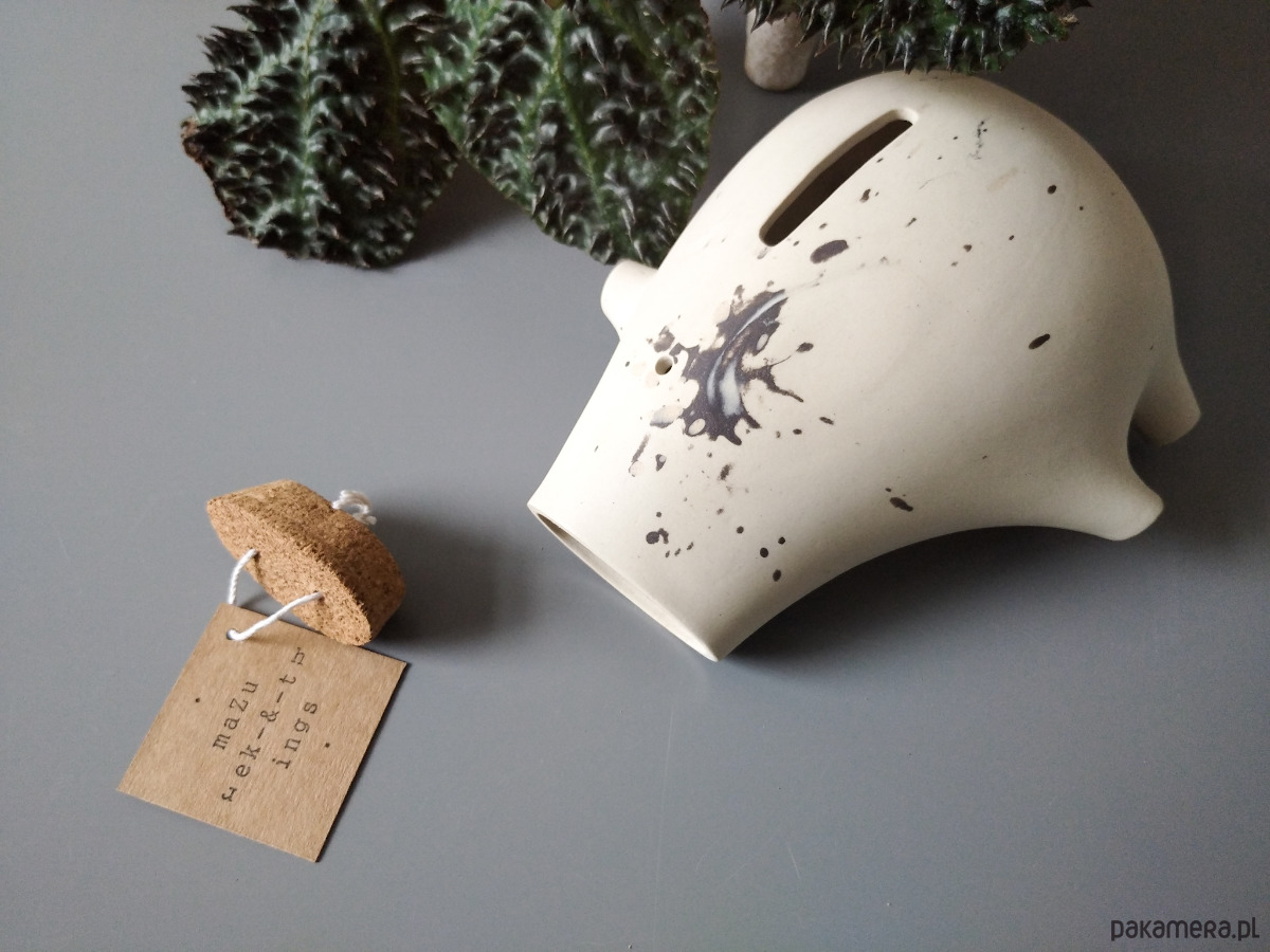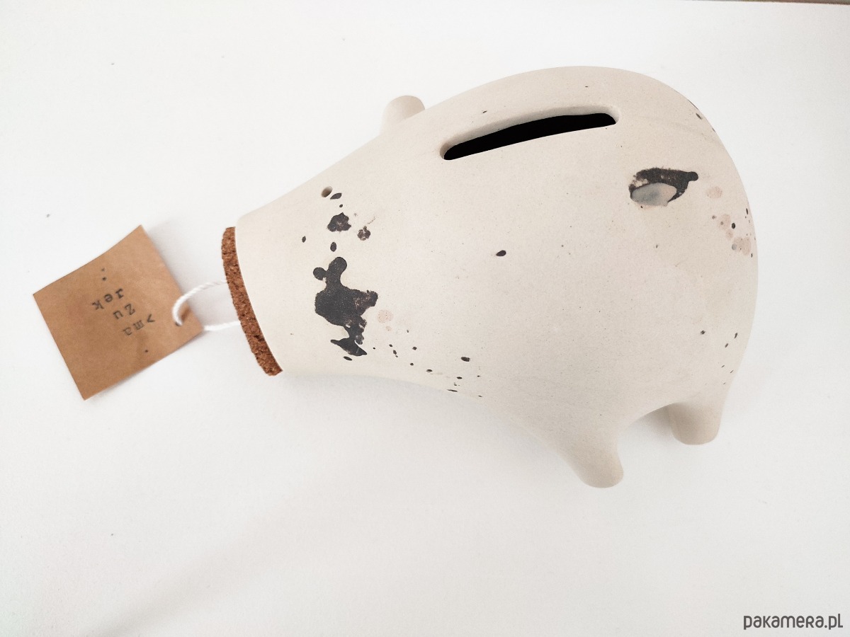 Świnka została wykonana ręcznie z nieszkliwionej kamionki oraz naturalnego korka.