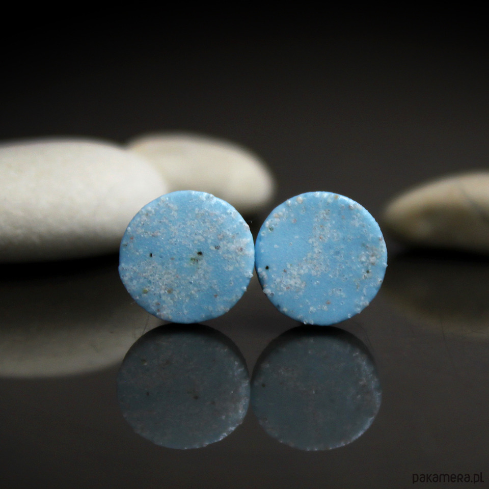 Efektowne nieregularne kolczyki w  formie sztyftów,  ręcznie wykonane z  delikatnej barwionej porcelany, pokryte morskim piaskiem z plaży w Świnoujściu, utrwalonym  w wysokiej temperaturze, szkliwione błyszczącym szkliwem, na antyalergicznych  sztyftach w kolorze  srebrnym. średnica  elementu  ceramicznego ok.  9mm,  grubość około 2mm.
