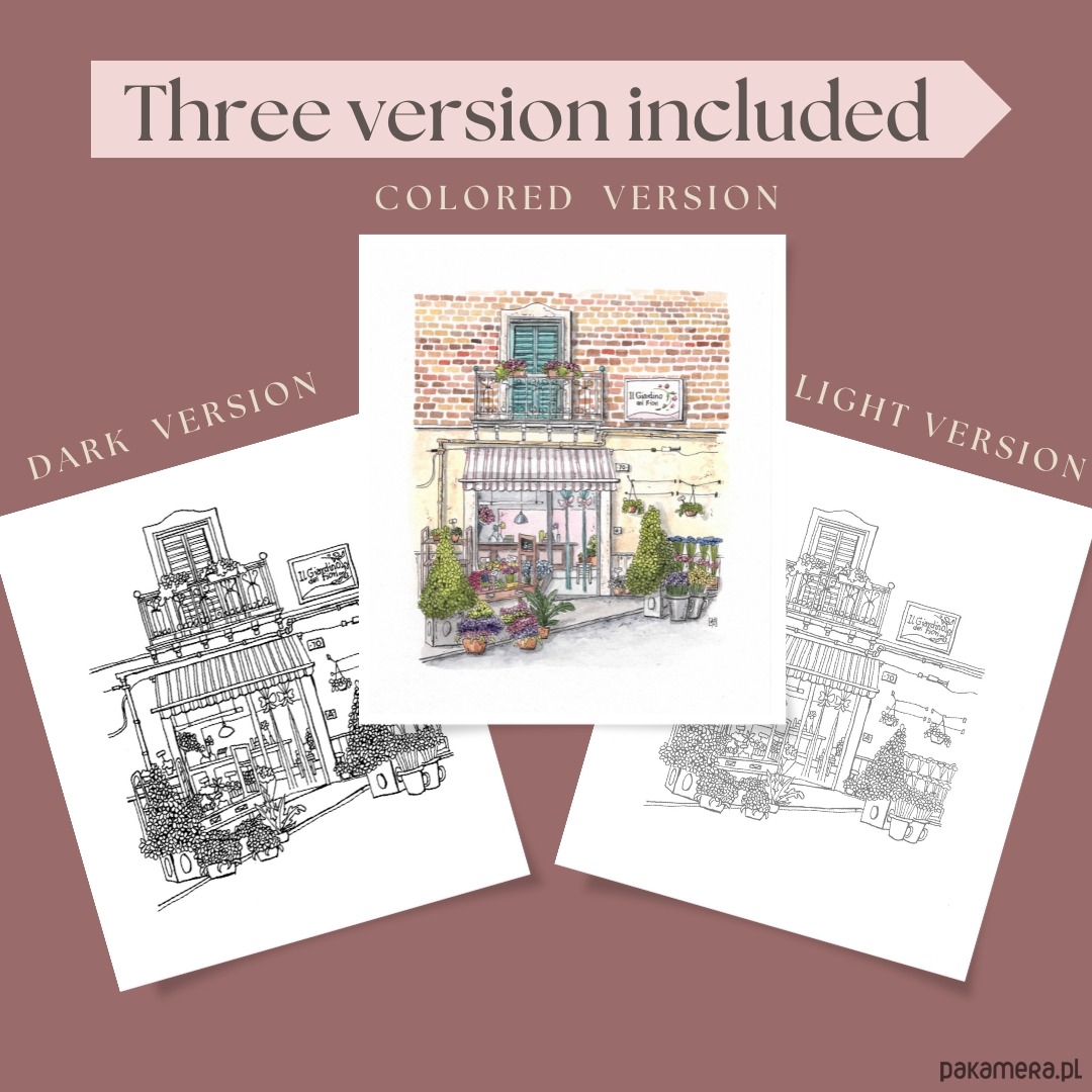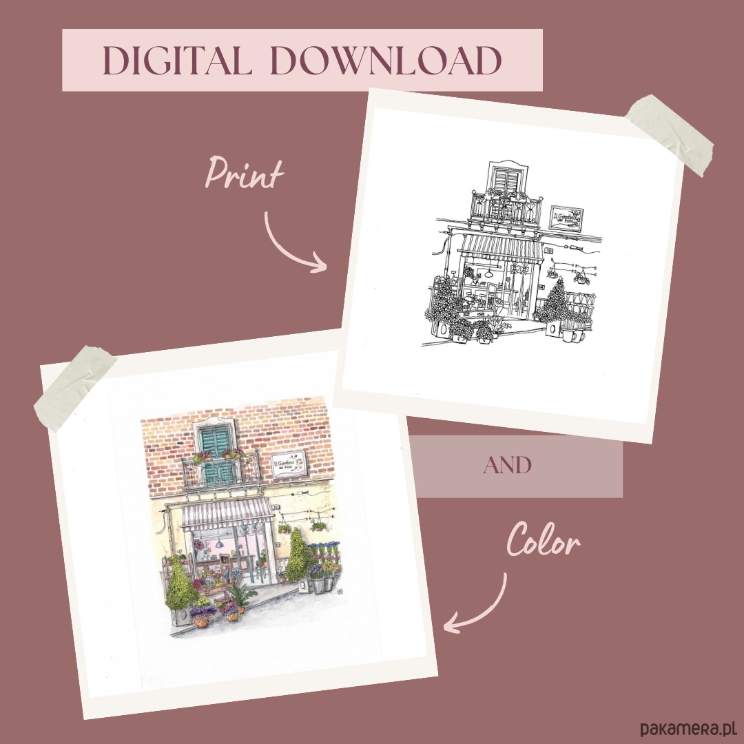 Wkrocz do świata uroku i nostalgii z tą wyjątkową, wydrukowaną kolorowanką! Ta szczegółowa czarno-biała ilustracja, oparta na moich ręcznie rysowanych akwarelach stworzonych podczas moich podróży, oddaje istotę zabytkowej witryny sklepowej lub starego domu. Idealny dla dorosłych entuzjastów kolorowania, którzy cenią architekturę, historię i sztukę, ten projekt oferuje kreatywną ucieczkę i relaks.