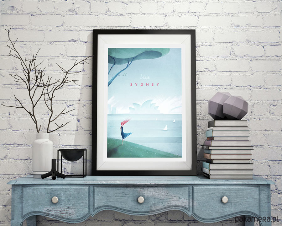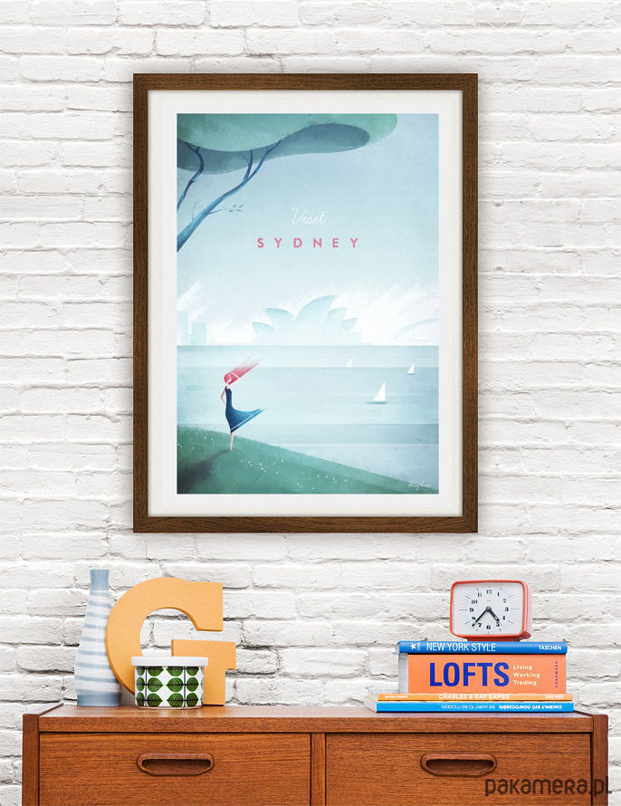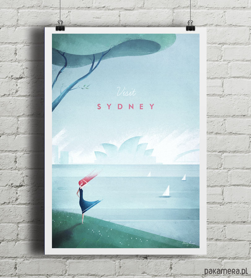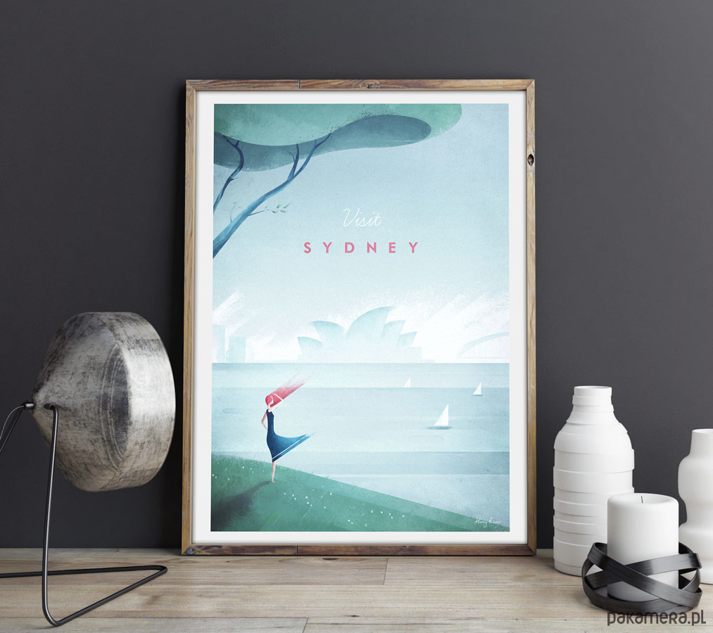 Plakat w stylu vintage przedstawiający kobietę spoglądającą na wody Zatoki Sydney z charakterystycznym gmachem Opera House i Harbour Bridge na drugim brzegu.