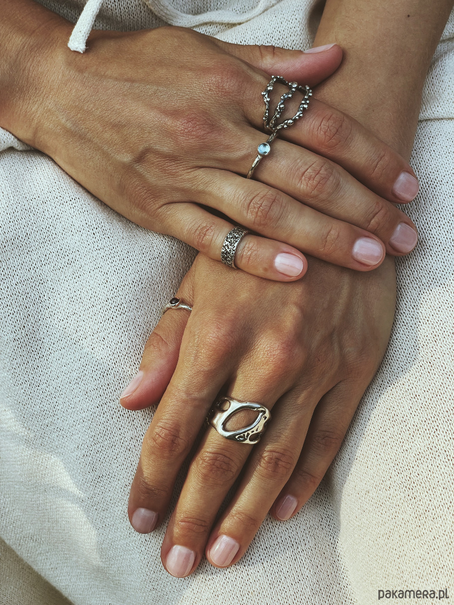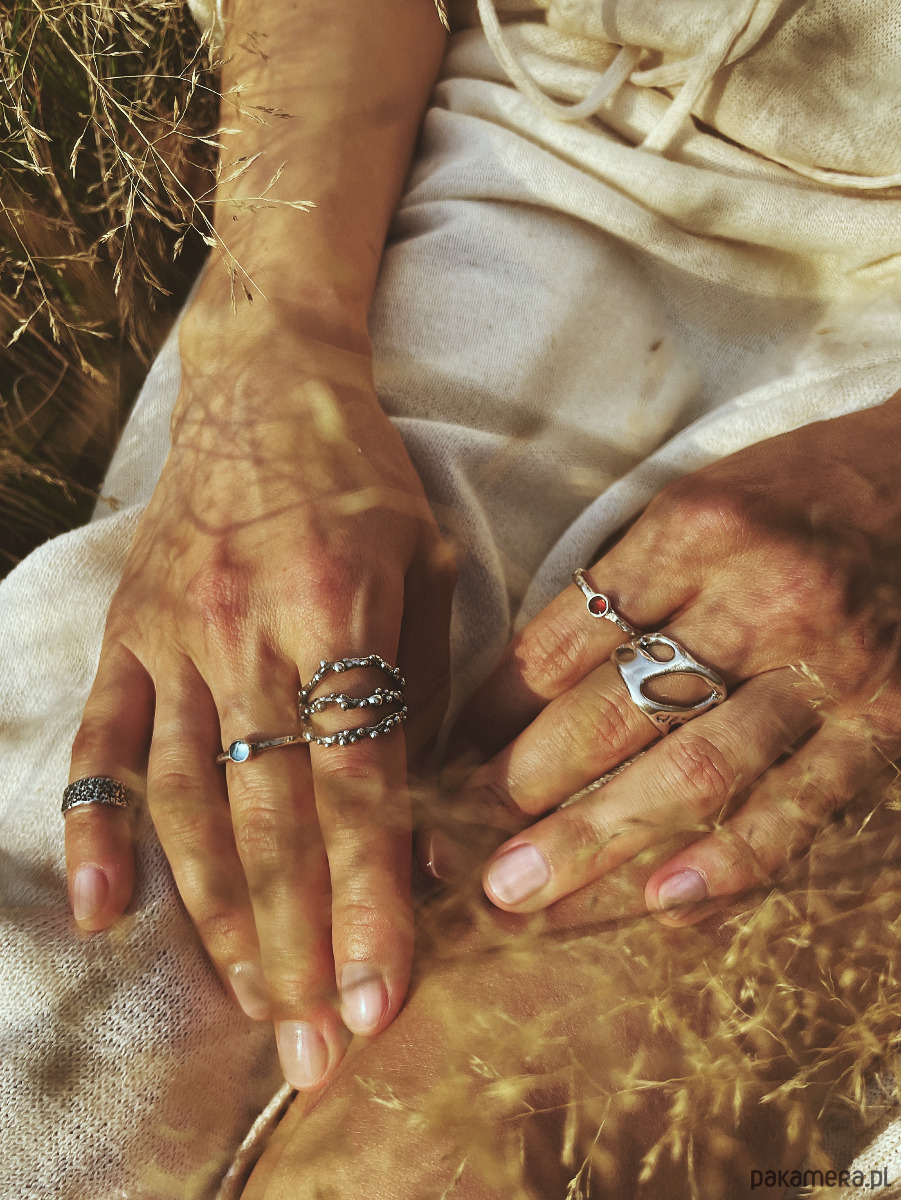 Sygnet Komorebi wyróżniający się lekką, ażurową formą. Komorebi to gra światła i cienia, organiczne lekkie sploty. Srebro oksydowane i przecierane o nieco surowym charakterze.