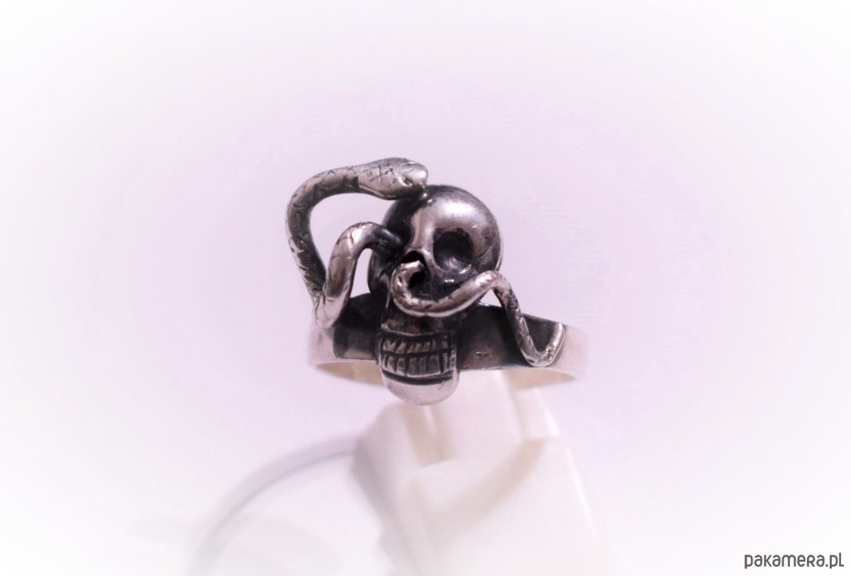 Sygnet męski czaszka z motywem węża wykonany w całości ze srebra próby 925 .Biżuteria wykonana od podstaw ręcznie, produkt unikalny i niepowtarzalny. Rozmiar 23 możliwość dopasowania rozmiaru w przedziale 20-26 . Całość polerowana oraz oksydowana przecierana dla lepszego efektu.