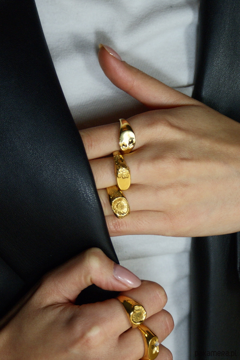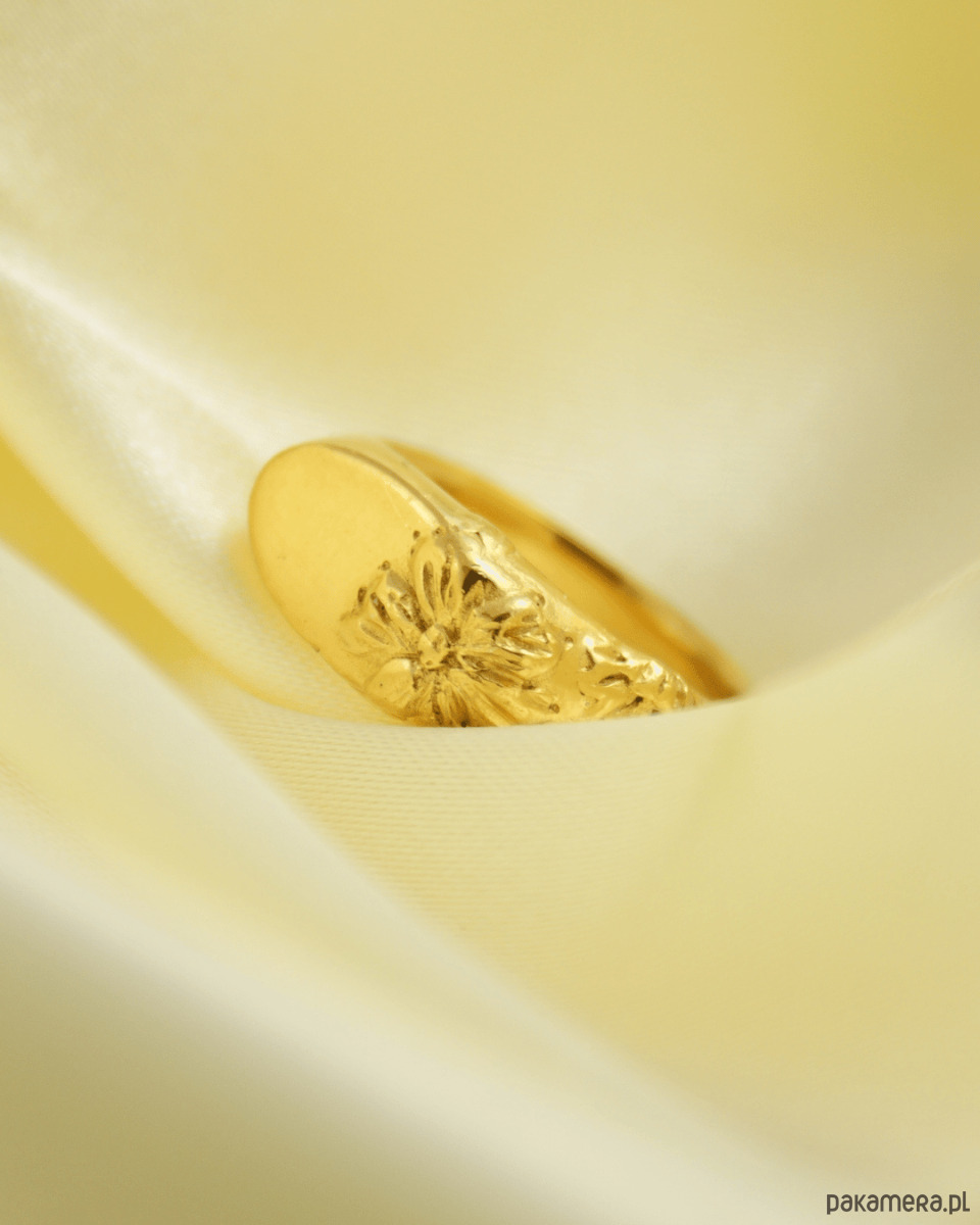 Sygnet Relief to projekt, w którym klasyczna, masywna bryła spotyka się z dynamicznym detalem roślinnym. Jako marka Her-Ring, tworząca unikatowe sygnety damskie, stawiamy na biżuterię, która jest jednocześnie małą formą rzeźbiarską. W tym modelu motyw kwiatu płynnie wychodzi z boku obrączki i nachodzi na taflę, przełamując tradycyjne podziały i nadając całości organicznego charakteru.