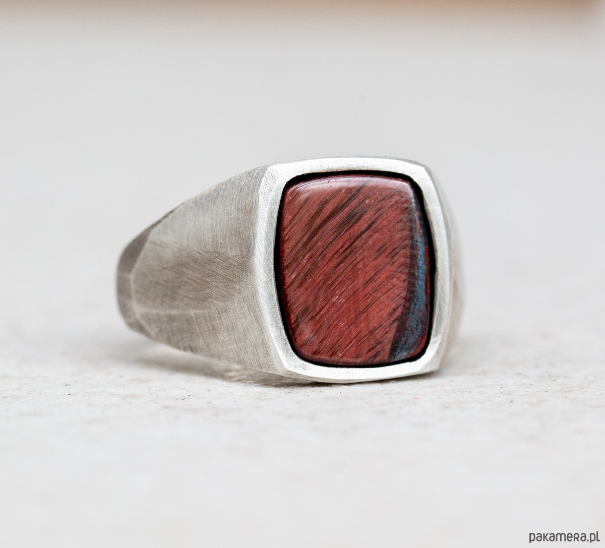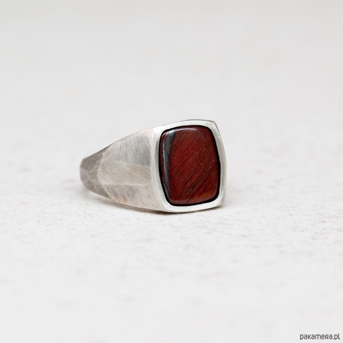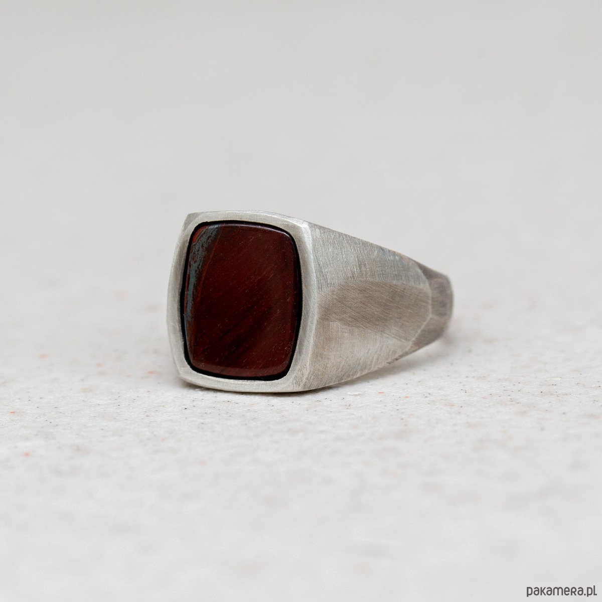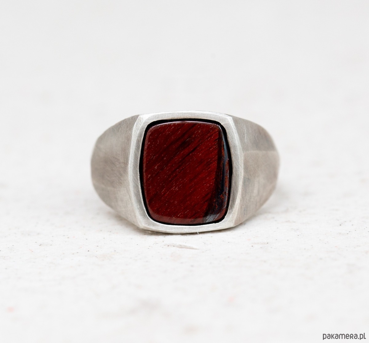 Centralnym punktem sygnetu jest bycze oko – niezwykle rzadki i wciąż mało znany kamień, powstający w naturalnym środowisku poprzez termiczne przekształcenie tygrysiego oka. Efekt tego procesu to głęboka, brunatno-czerwona barwa z ciemnymi refleksami, która w świetle mieni się i ujawnia swoją wyjątkową strukturę. Każdy kamień ma niepowtarzalny rysunek, dlatego każdy sygnet jest unikatowy.