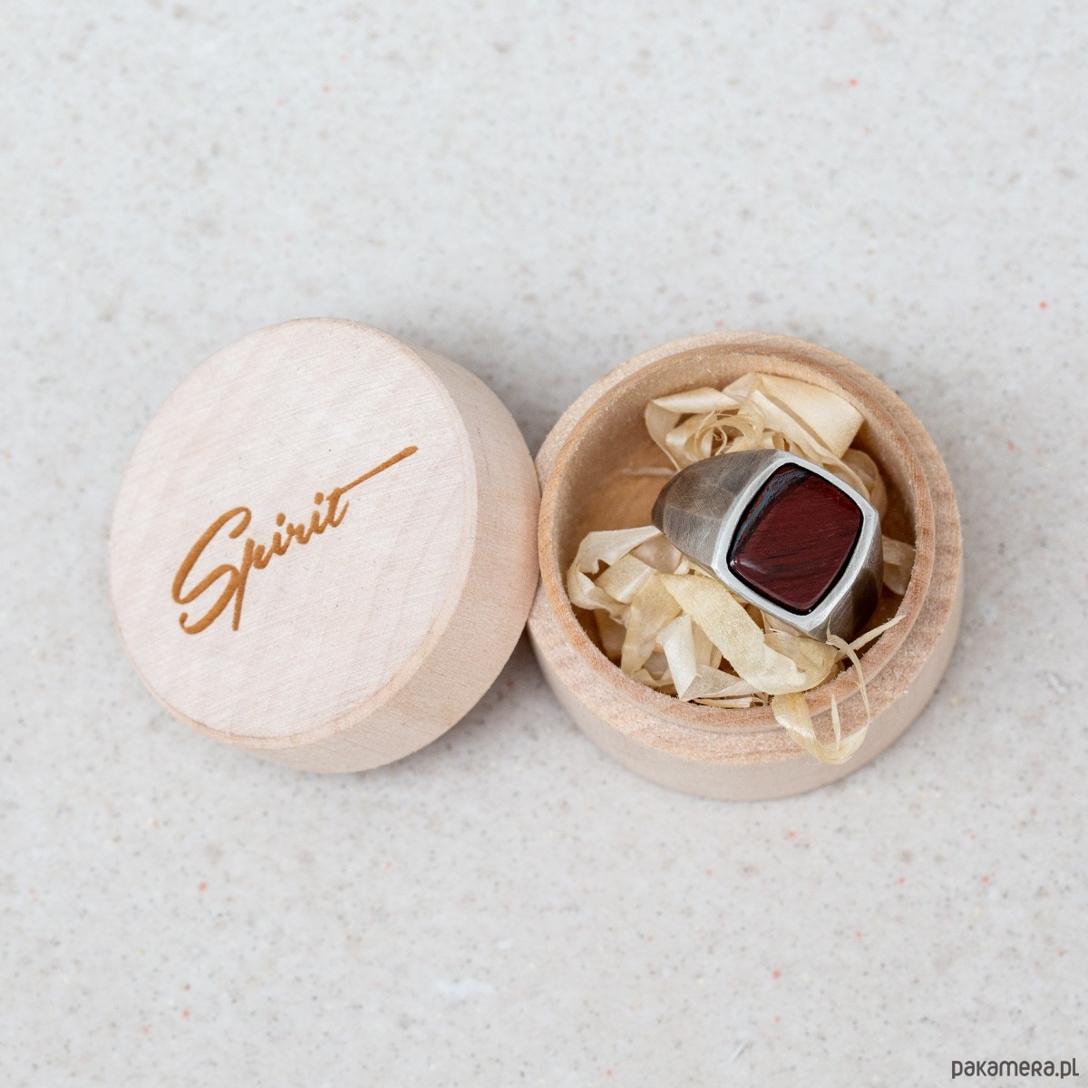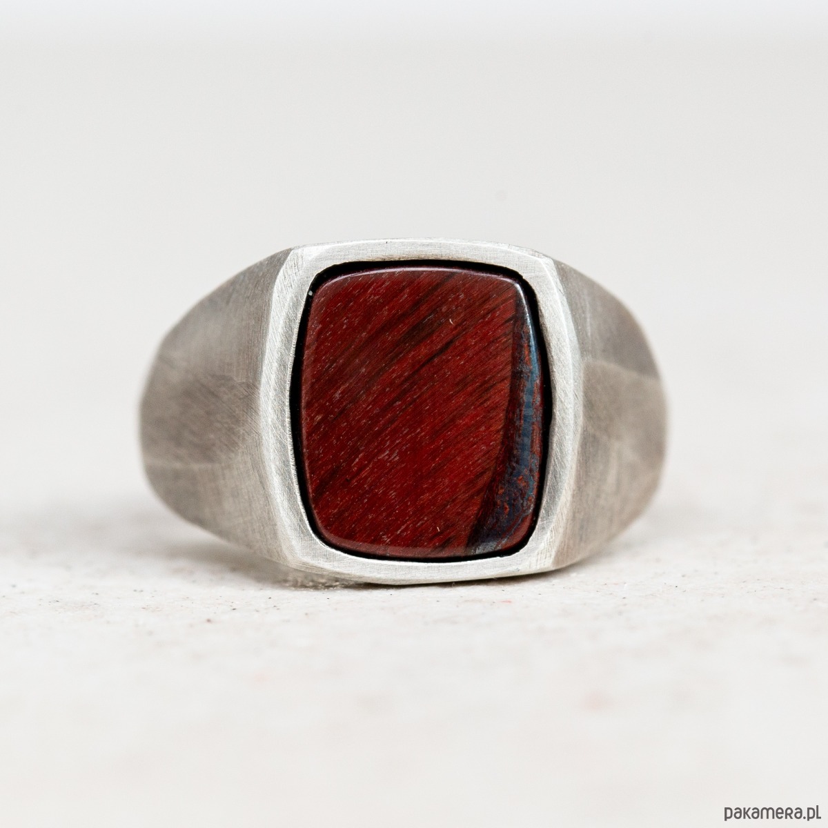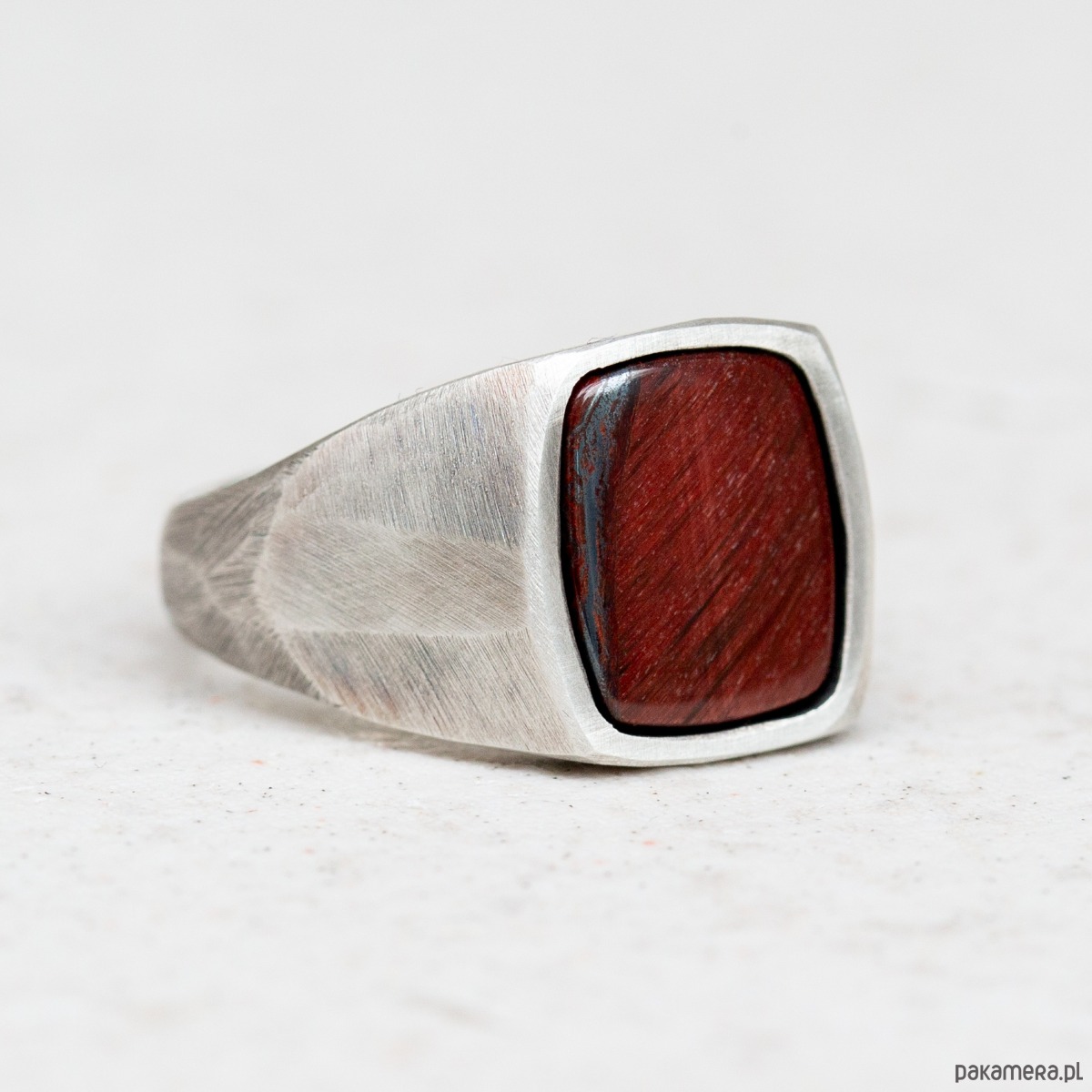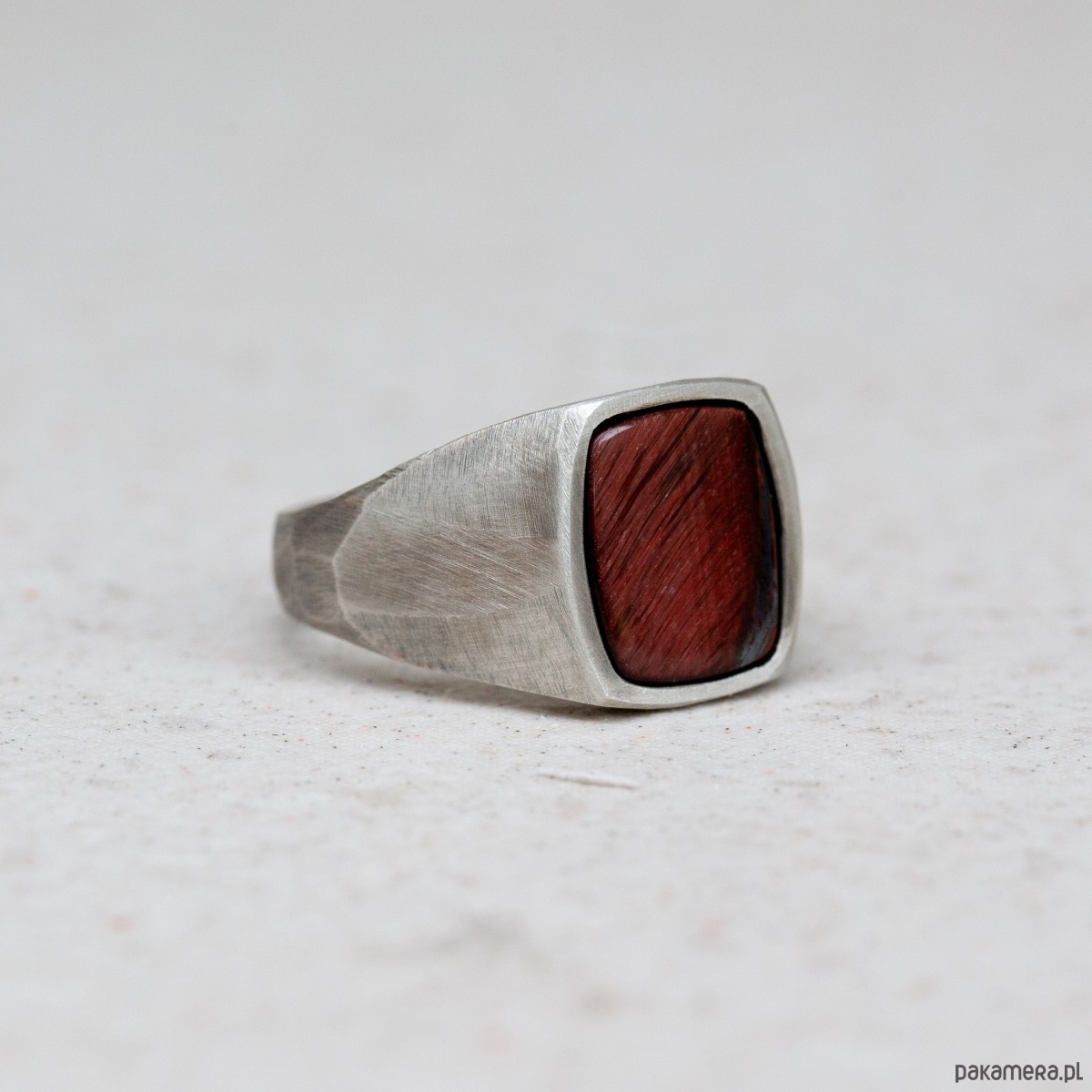 Centralnym punktem sygnetu jest bycze oko – niezwykle rzadki i wciąż mało znany kamień, powstający w naturalnym środowisku poprzez termiczne przekształcenie tygrysiego oka. Efekt tego procesu to głęboka, brunatno-czerwona barwa z ciemnymi refleksami, która w świetle mieni się i ujawnia swoją wyjątkową strukturę. Każdy kamień ma niepowtarzalny rysunek, dlatego każdy sygnet jest unikatowy.