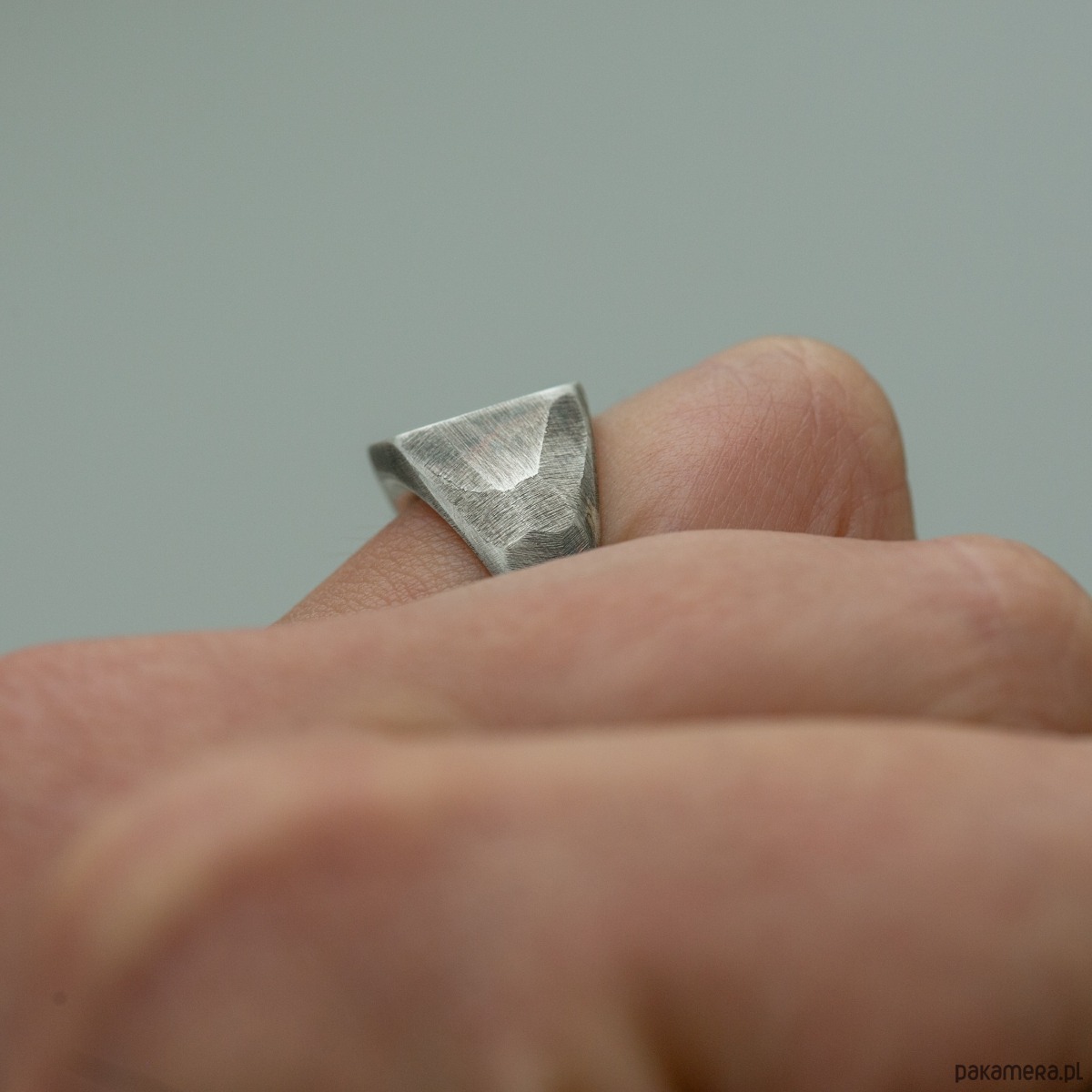 Ten wyjątkowy, męski sygnet został wykonany ręcznie ze srebra próby 925 i wykończony charakterystyczną, fasetowaną teksturą, która nadaje mu surowy, nowoczesny charakter. Dodatkowo całość została delikatnie oksydowana, co podkreśla geometryczne cięcia i tworzy subtelny kontrast z kamieniem.