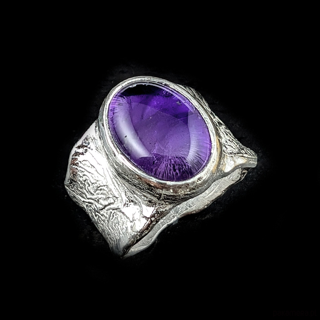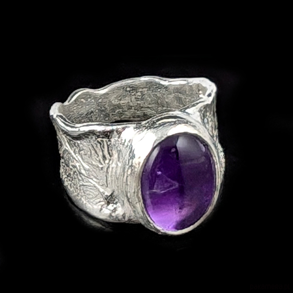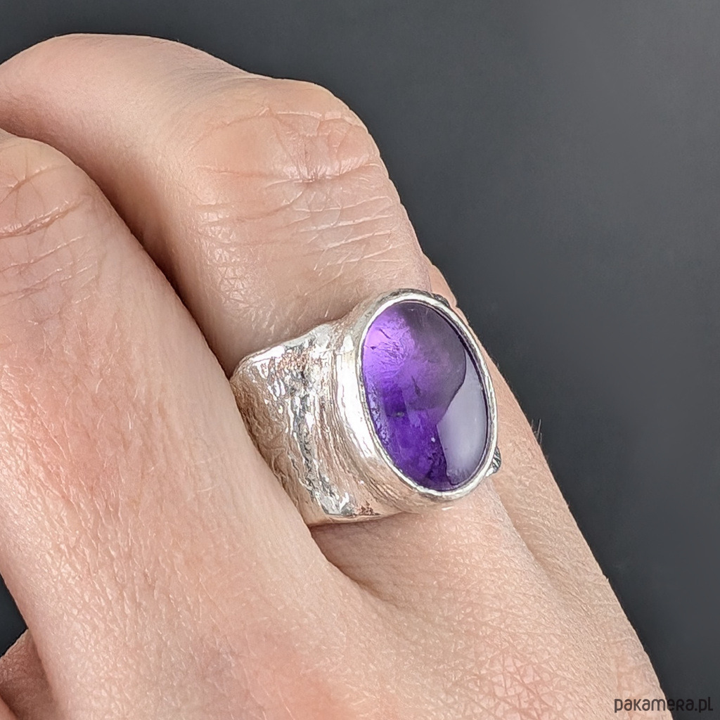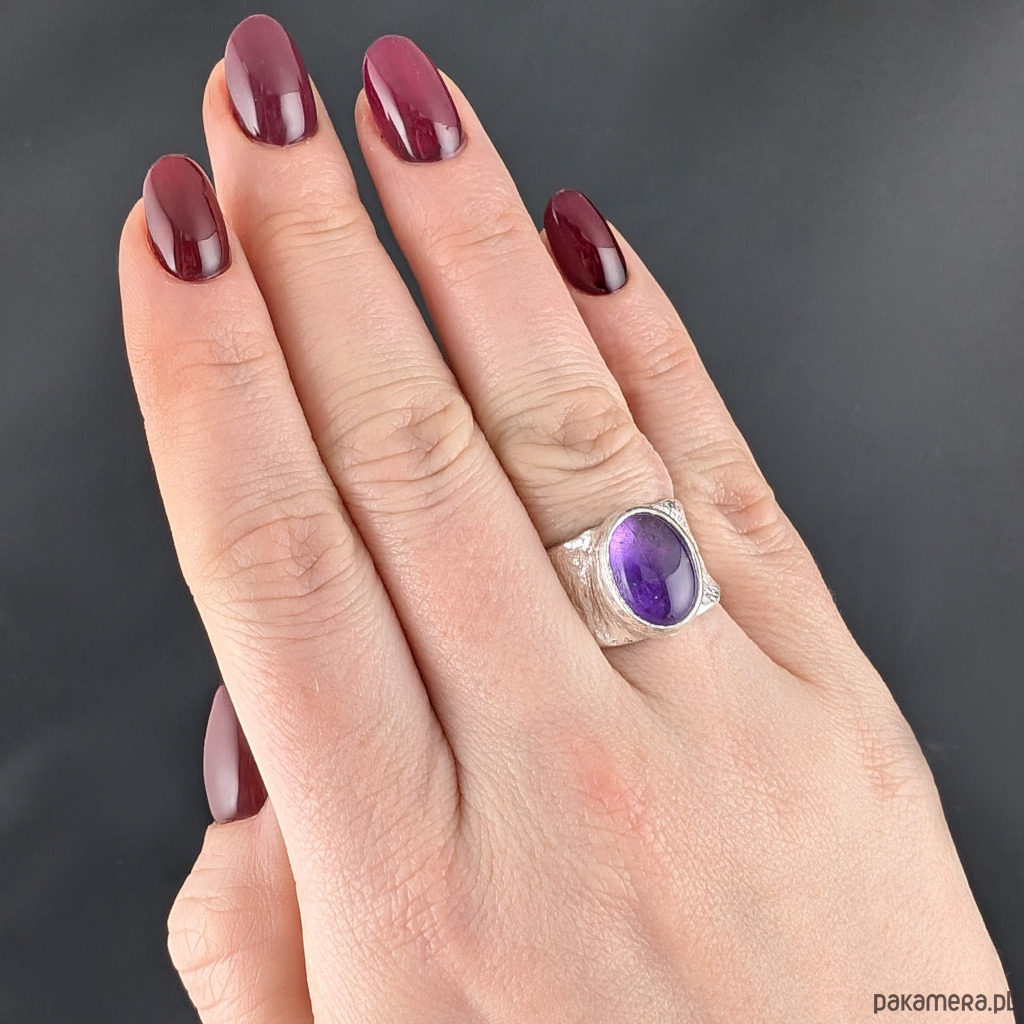 Pierścień z oprawionym w srebro pr.925 przepięknym ametystem o kształcie owalnego kaboszonu i pięknej, nasyconej barwie. Wymiary oprawy kamienia 15 x 12 mm. Obrączka z ciekawą fakturą ma szerokość max. 14 mm. Rozmiar jubilerski 15, możliwe powiększenie do MAX 16. Waga 8 g. Pierścionek zapakowany w ozdobne pudełeczko.
