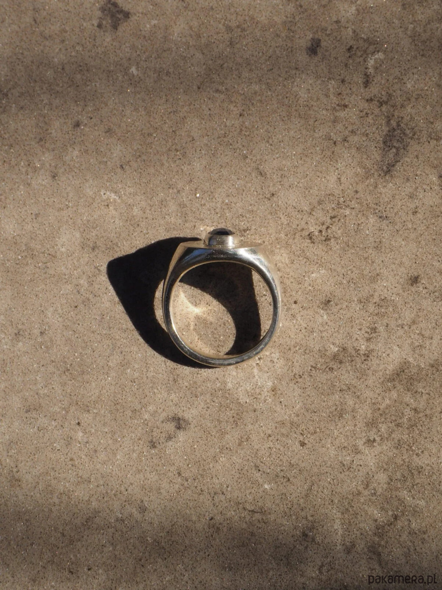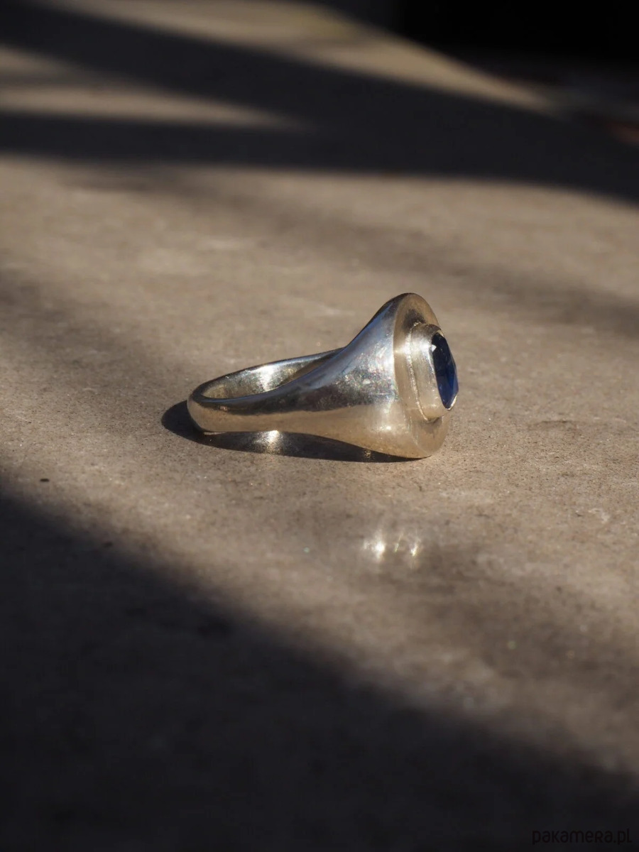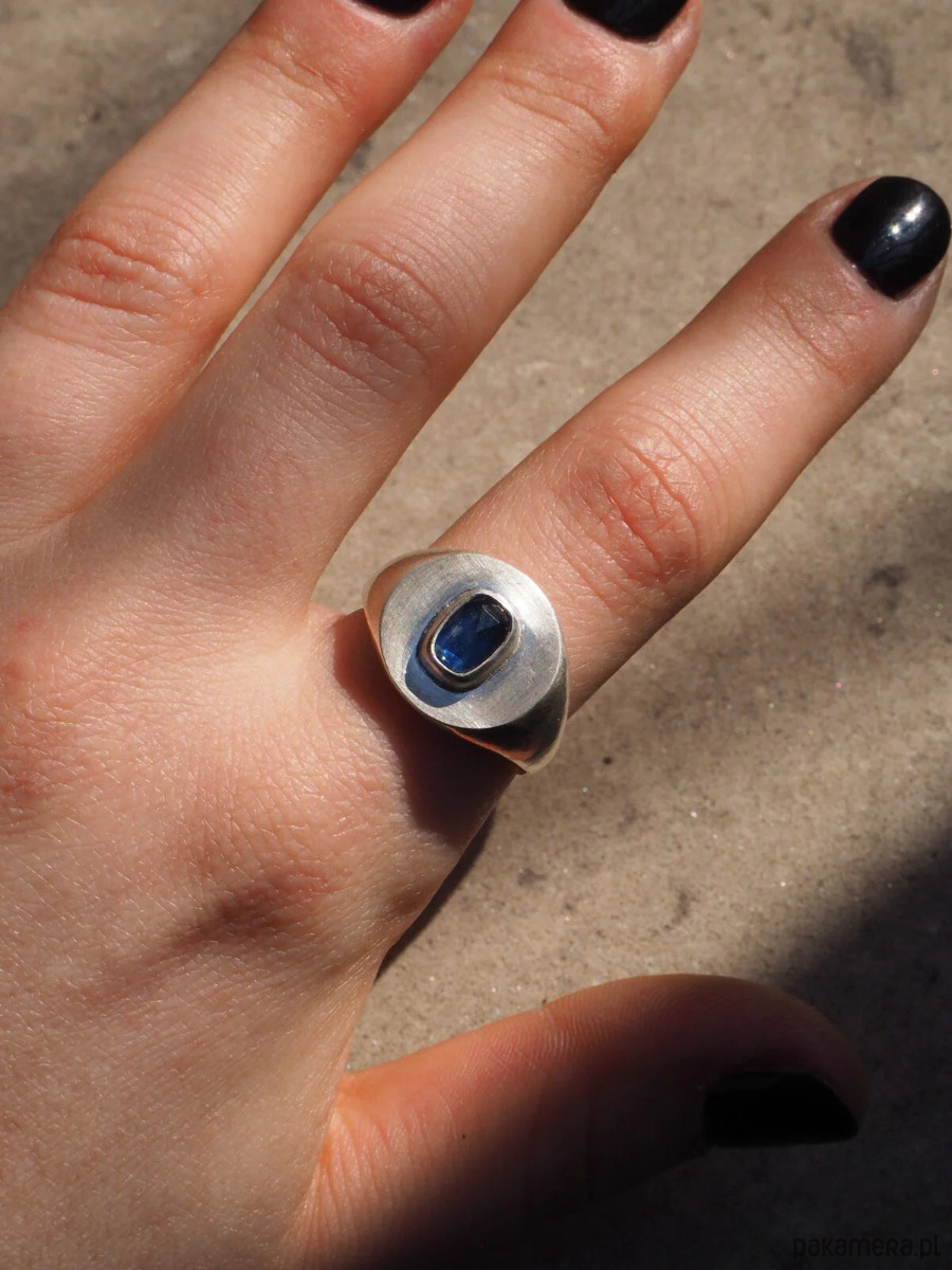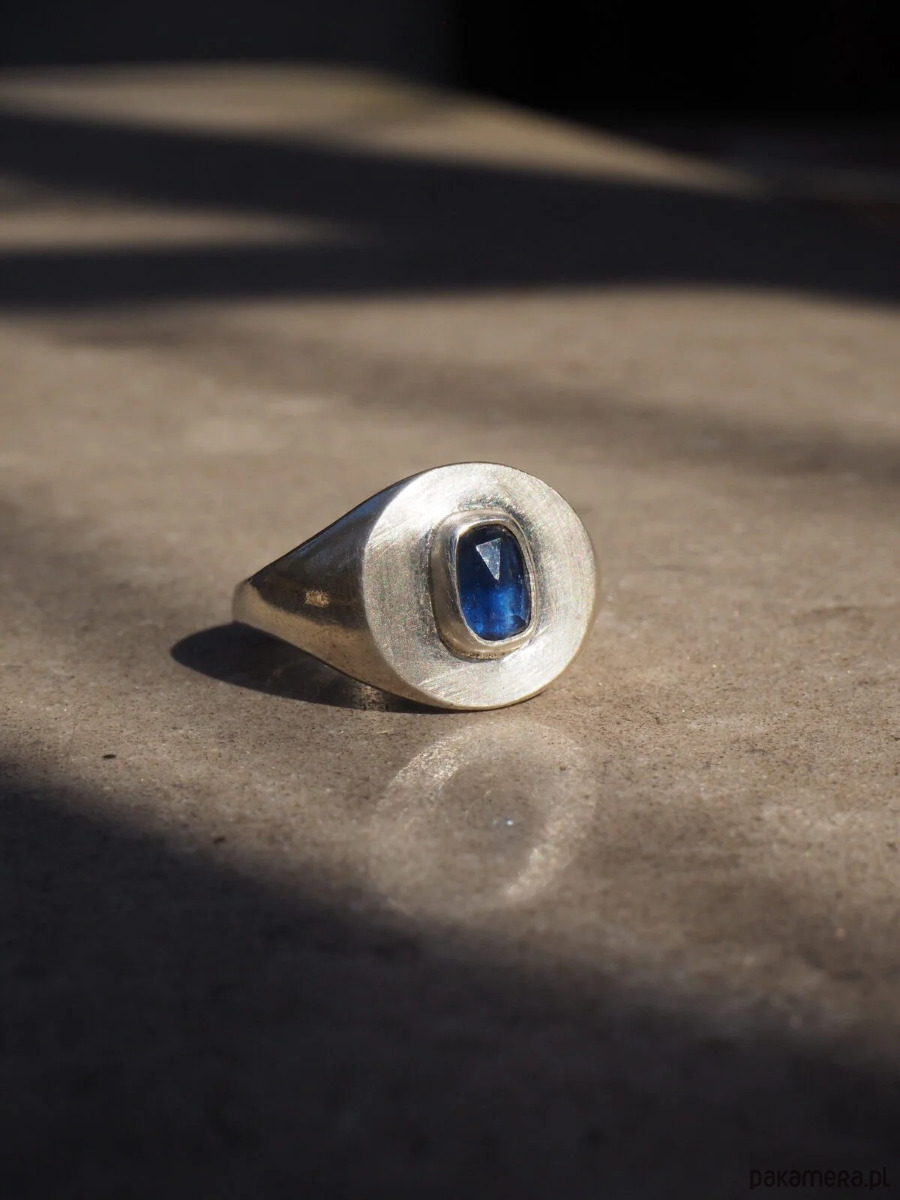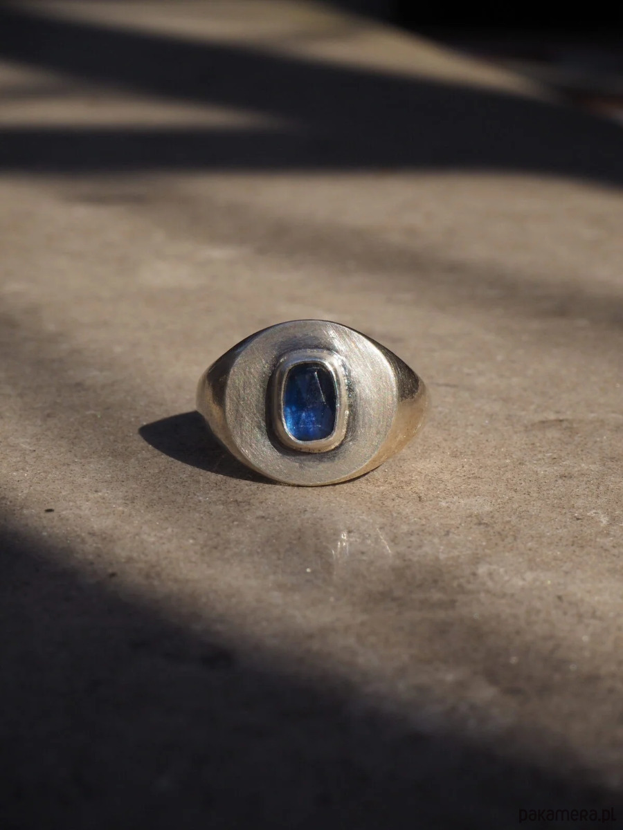 Wyjątkowy sygnet z okrągłą tarczą i oprawionym na niej niebieskim, podłużnym kyanitem. Wykończenie satyna-połysk. Próba 925. Sygnet wykonany ręcznie.