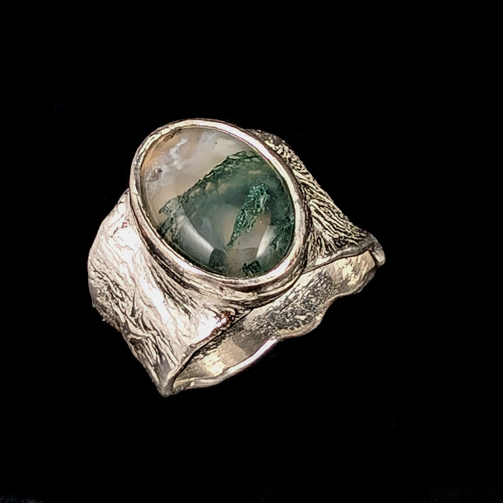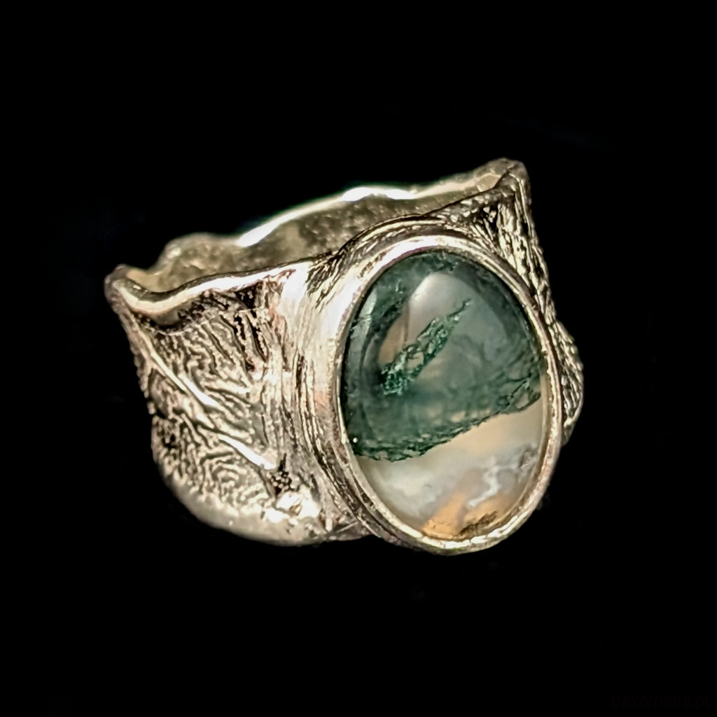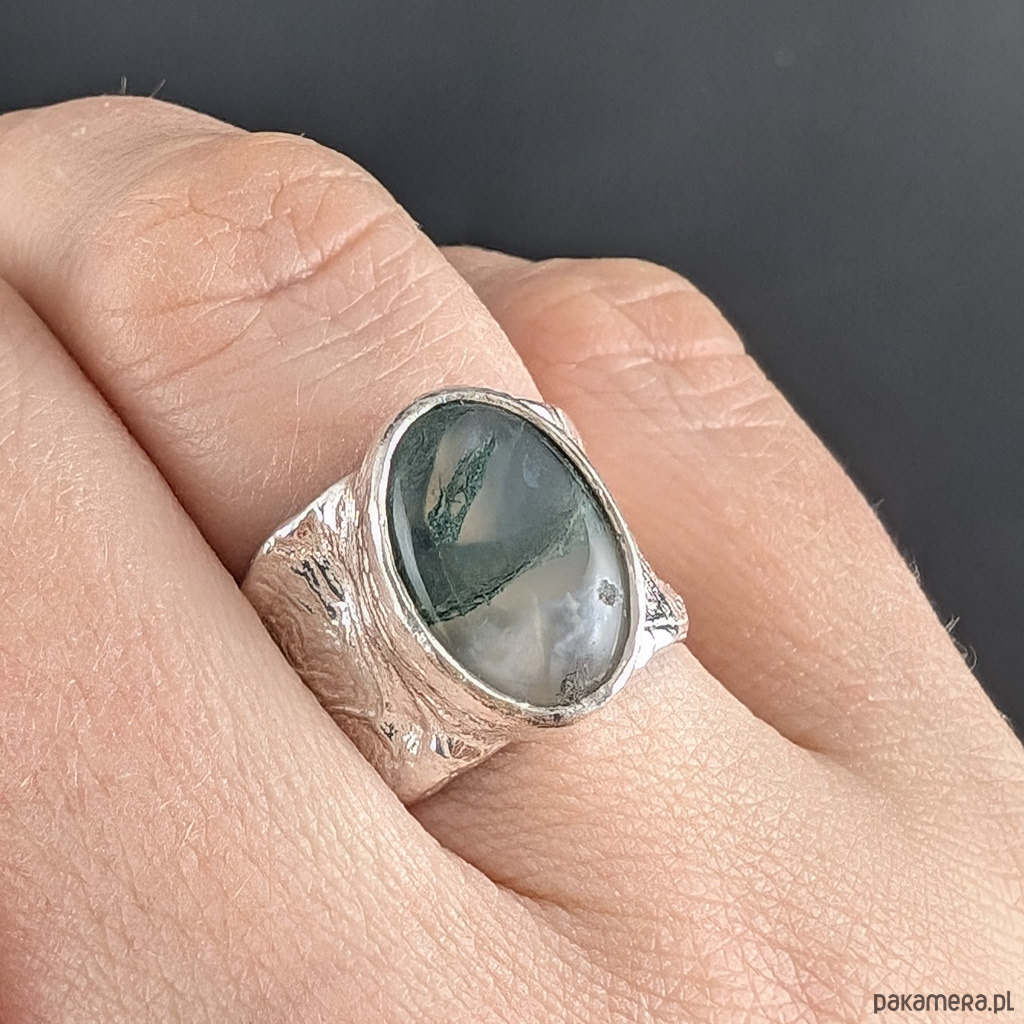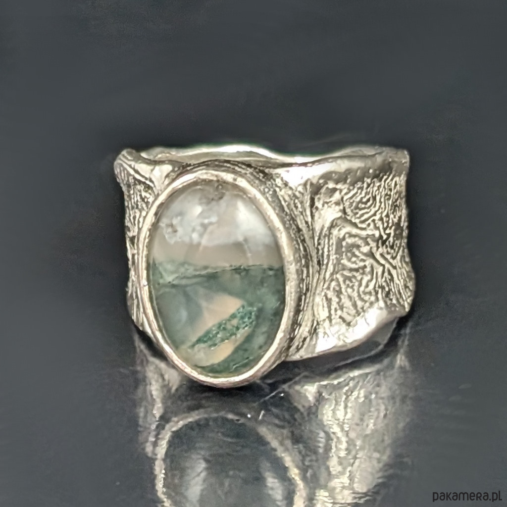 Pierścień z oprawionym w srebro pr.925 przepięknym mszystym agatem. Wymiary oprawy kamienia 14 x 12 mm. Obrączka z ciekawą fakturą ma szerokość max. 14 mm. Rozmiar jubilerski 15. Waga 8.7 g. Pierścionek zapakowany w ozdobne pudełeczko.