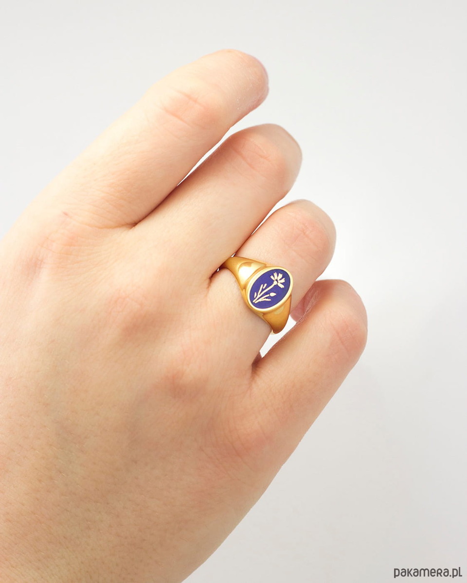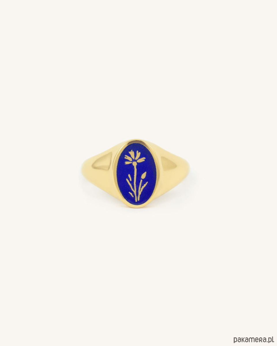 Sygnet BŁAWATEK z kolekcji „Kwiaty polne”. W całości wykonany ręcznie ze złoconego srebra próby 925 i emalii piecowej wypalanej w 800 stopniach, w kolorze kobaltowym. Sygnet po nałożeniu emalii jest szlifowany i polerowany ręcznie. Ze względu na unikatowy charakter każdy egzemplarz może się od siebie nieco różnić. Wszystkie sygnety wykonujemy na zamówienie.