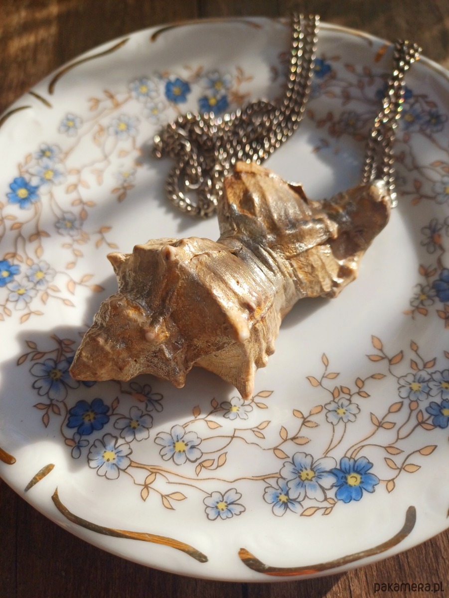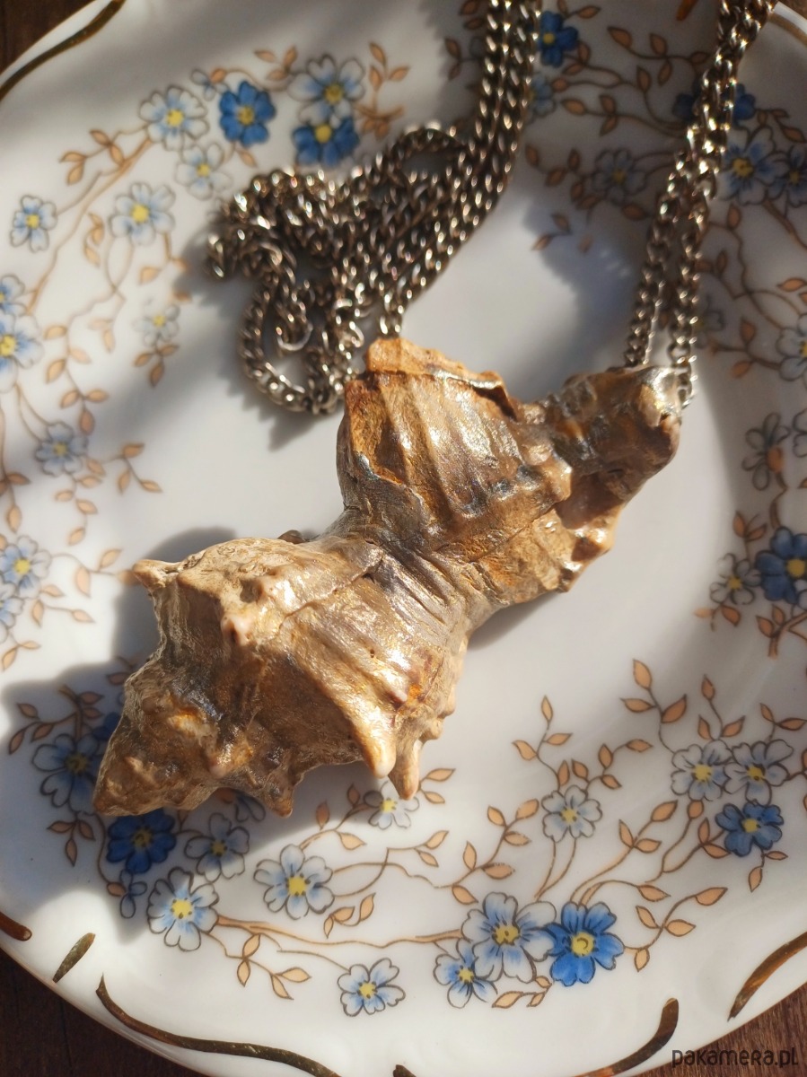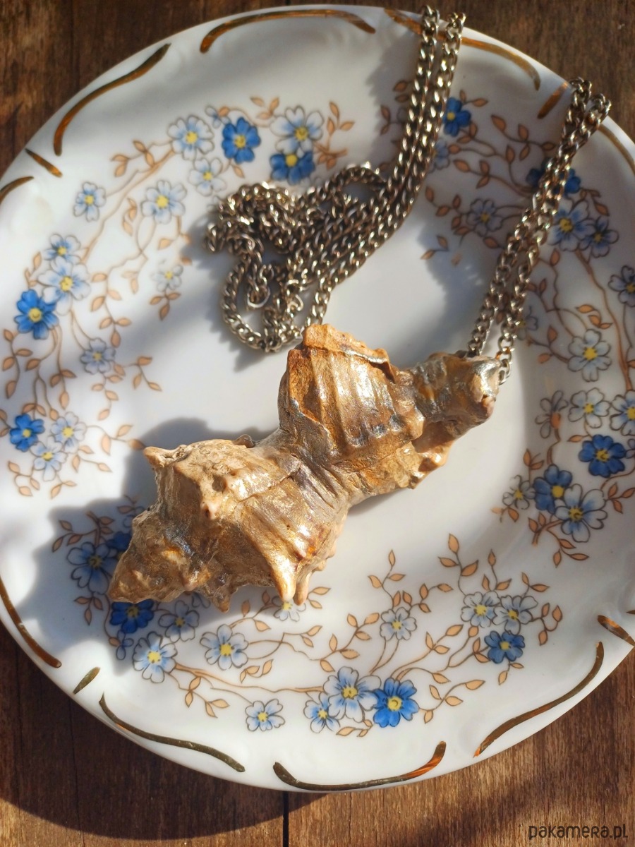 Wyjątkowa duża muszla, na długim łańcuszku, muśnięta lśnieniem, prosto z laguny pod Wenecją.