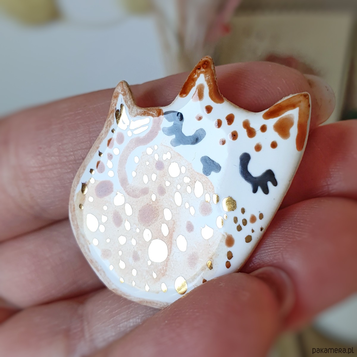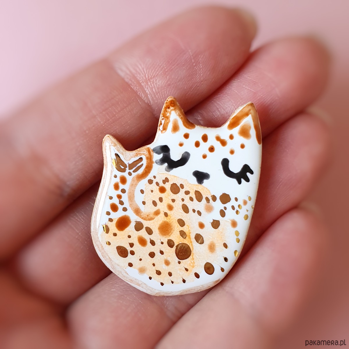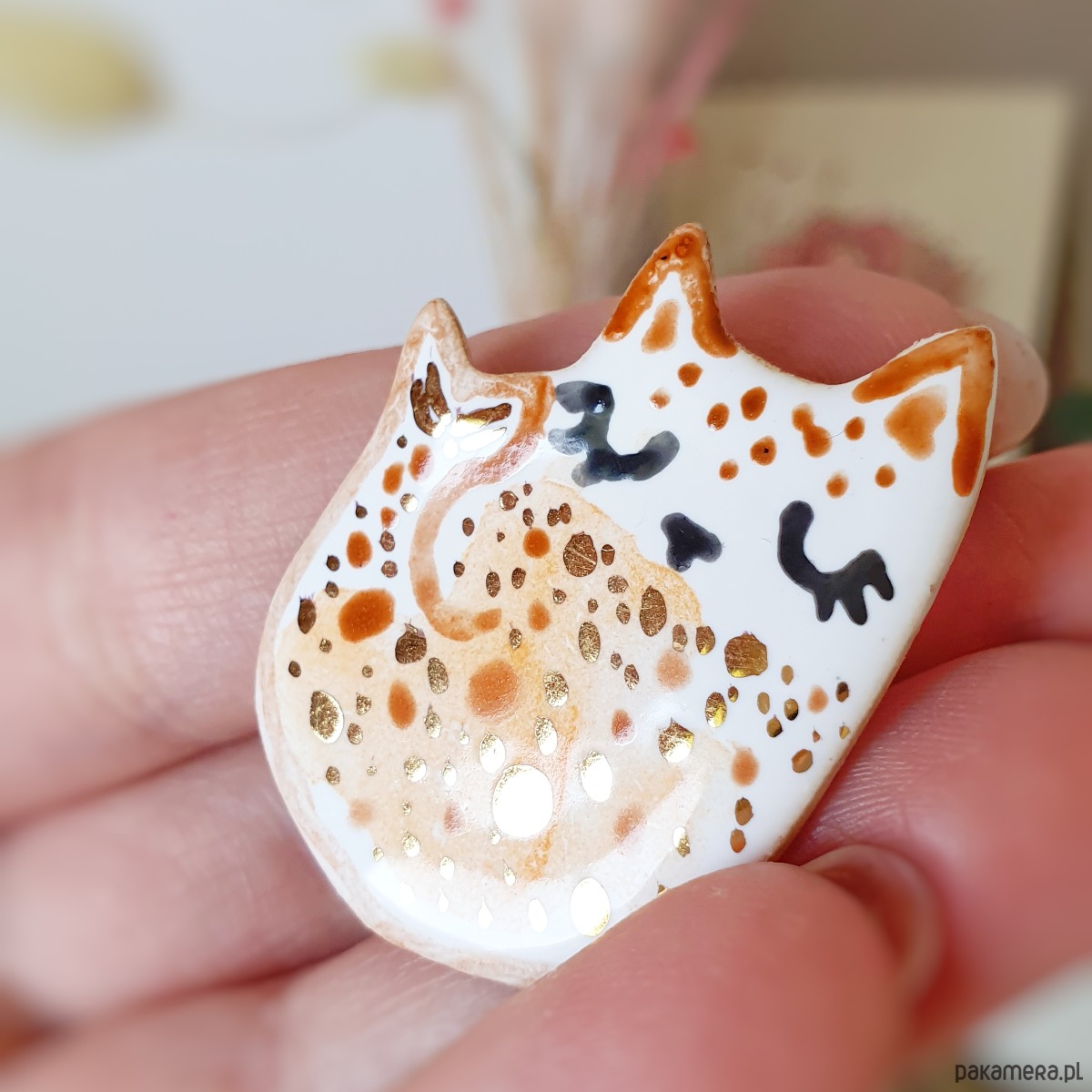 Unikatowa broszka wykonana w 100% ręcznie w pracowni Mrs. Biscuit. Szkliwiona, bogato dekorowana prawdziwym złotem.