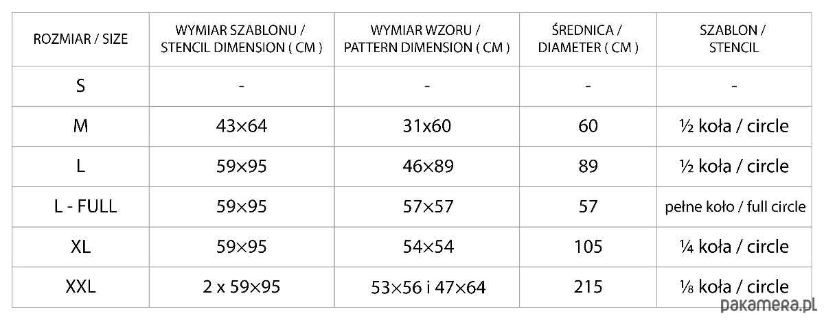 różne rozmiary: wzory mandali dostępne są w różnych rozmiarach od M do XXL o średnicach od 57 cm do 215 cm