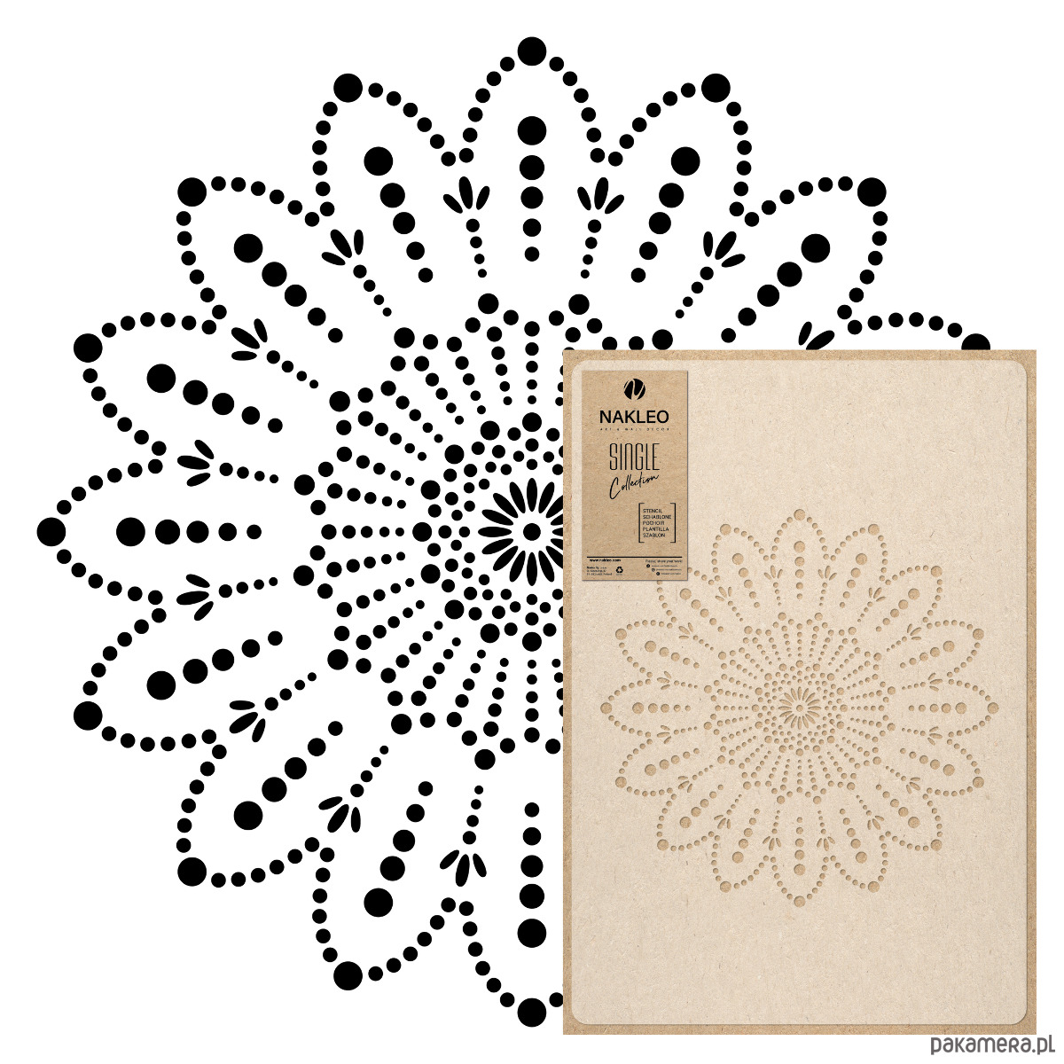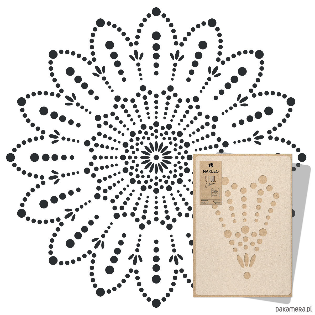 Kolekcja szablonów z serii Nakleo Single Collection zawiera unikalne, pojedyncze wzory stworzone do dekoracji ścian, mebli i nie tylko. Wykonane są z trwałego i elastycznego plastiku typu polipropylen w mlecznym kolorze. Szablony z motywem mandali dostępne są w kilku rozmiarach od M do XXL na arkuszach o wymiarach 43×64 cm lub 59×95 cm z różnymi średnicami do wyboru. Wysoka jakość i dbałość o każdy detal wzorów to gwarancja wyjątkowego efektu końcowego.