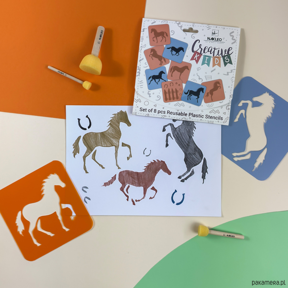 Szablony do rysowania „Konie” z serii Nakleo Creative Kids pomogą Twojemu dziecku tworzyć piękne obrazki. Osiem pomarańczowych i niebieskich arkuszy z różnymi wzorami pobudzi wyobraźnię najmłodszych i przygotuje rękę do nauki pisania. Kreatywna zabawa z naszymi produktami może stać się łatwym i przyjemnym treningiem małej motoryki maluchów. Wszystkich szablonów można używać wielokrotnie, dzięki czemu staną się one idealną rozrywką na wiele długich godzin. Malowanie farbami, mazakami czy kredkami nie będzie już problemem. Bogata gama tematyczna sprawi, że każdy znajdzie coś dla siebie, zarówno przyszły astronauta, jak i mała księżniczka. Gwarantujemy szeroki uśmiech i dumę z własnoręcznie wykonanych rysunków!