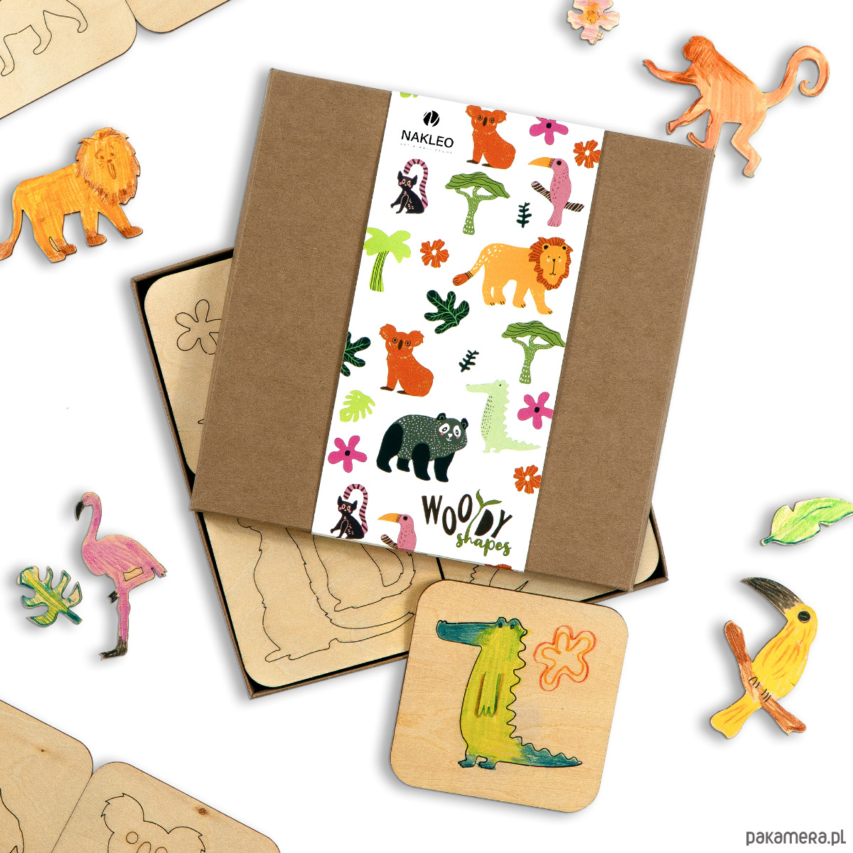 Zestaw szablonów drewnianych Nakleo Woody Shapes – Dżungla i sawanna zabiera najmłodszych w podróż po egzotycznych ekosystemach. Zawiera 20 szablonów 9,5x9,5 cm z wizerunkami lwa, żyrafy, słonia, tygrysa, tukana i tropikalnych roślin, wykonanych z 3-mm sklejki i ciętych laserowo.