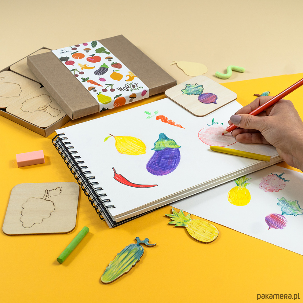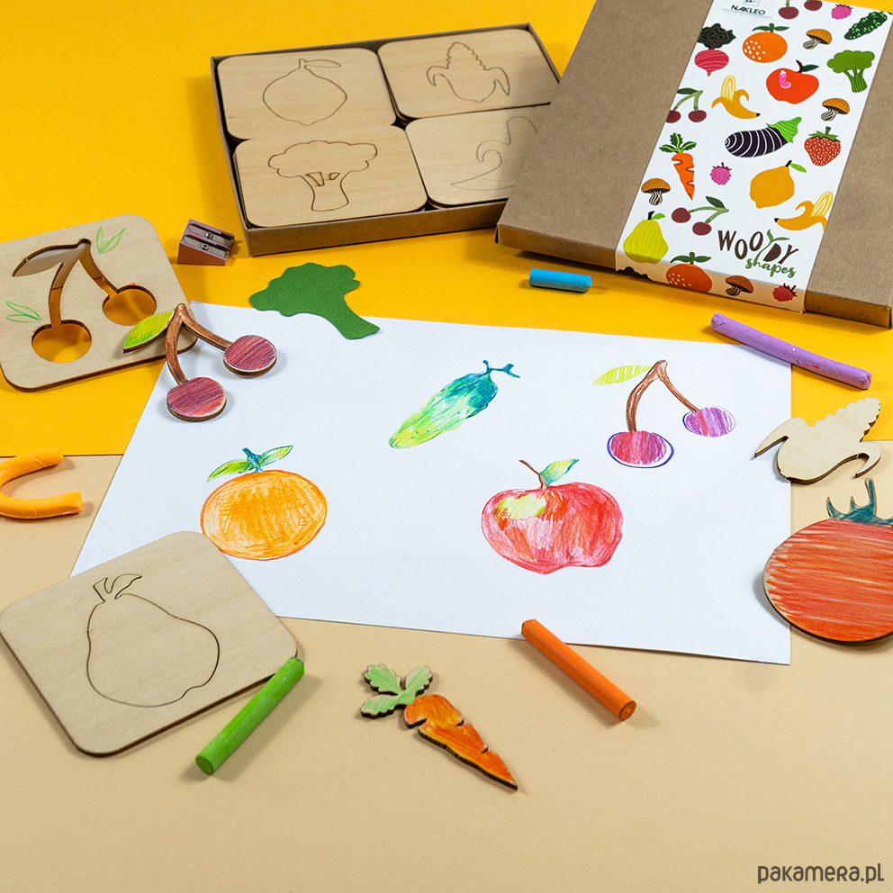 Dzieci poznają nazwy i kształty produktów, uczą się klasyfikacji, liczenia elementów i tworzą własne ilustracje przepisów. To świetna pomoc na lekcjach plastyki i przyrody oraz w domowej zabawie w kuchnię. Zestaw wspiera metodę Montessori, rozwijając sensorykę, koncentrację i motorykę małą. Sprawdź również nasz zestaw szablonów „Owoce” i „Warzywa” z kolekcji Creative Kids, który doskonale uzupełni drewniane szablony Woody Shapes i wprowadzi dzieci w świat zdrowego odżywiania poprzez zabawę, kolorowanie i naukę rozpoznawania smakowitych kształtów.