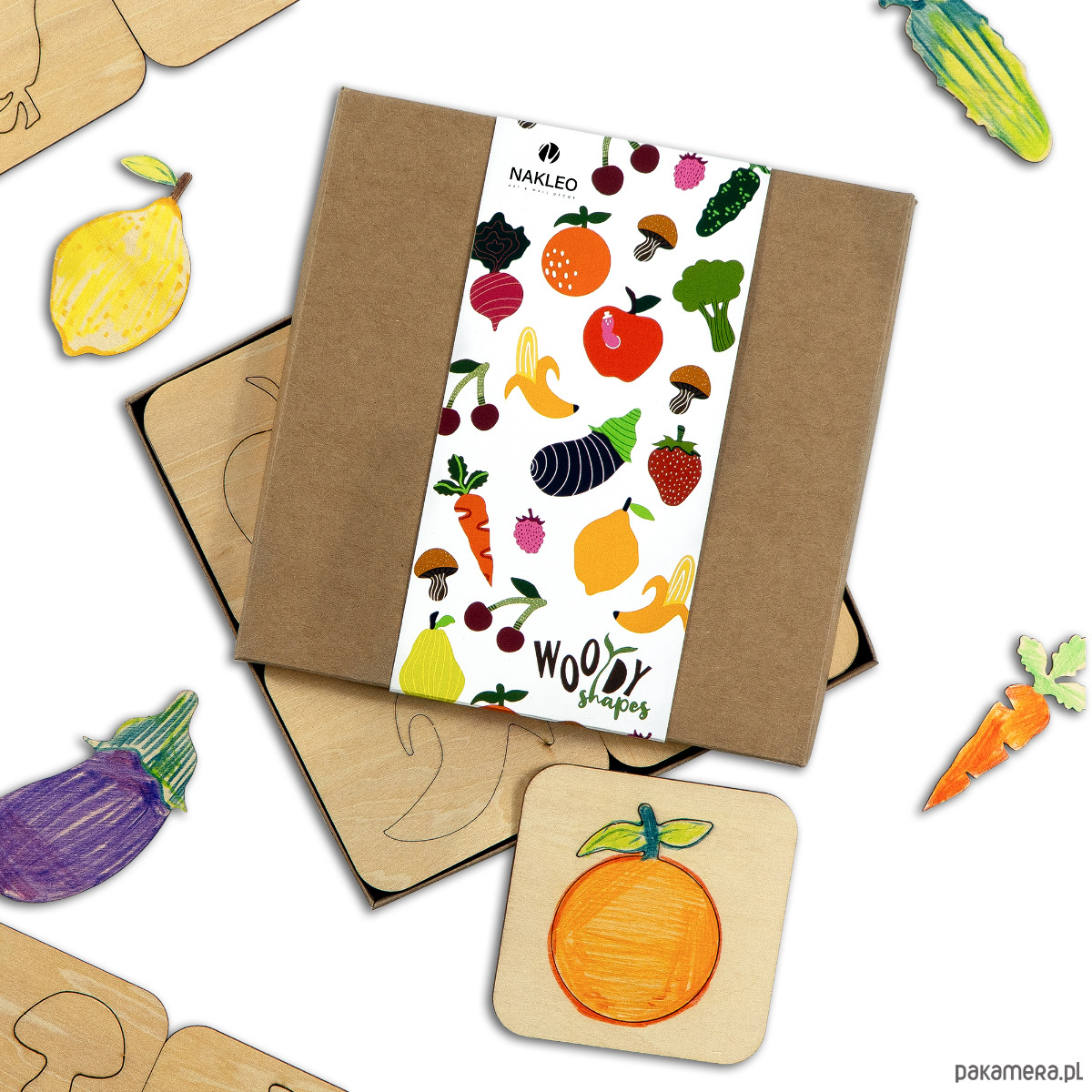 Zestaw szablonów drewnianych Nakleo Woody Shapes – Owoce i warzywa łączy sztukę z edukacją o zdrowym jedzeniu. W komplecie jest 20 szablonów o wymiarach 9,5x9,5 cm z jabłkiem, gruszką, truskawką, marchwią, papryką, pomidorem i innymi smakołykami, wykonanych z 3-mm sklejki. Każdy kształt jest laserowo wycięty, co ułatwia dokładne odrysowywanie, kolorowanie i pracę farbami czy kredkami.