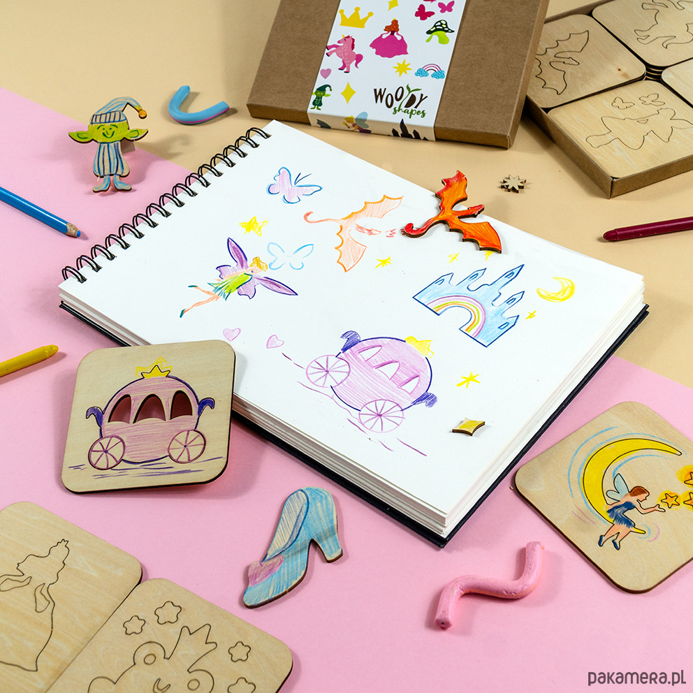 Wyraźne kontury ułatwiają odrysowywanie i malowanie, a bogata tematyka zaprasza do wymyślania historii i inscenizacji. Sprawdź również nasze zestawy szablonów „Wróżki” i „Syreny” z kolekcji Creative Kids, który doskonale uzupełni drewniane szablony Woody Shapes i przeniesie dzieci do magicznej krainy wróżek, smoków i czarodziejskich zamków pełnych kolorów i fantazji.
