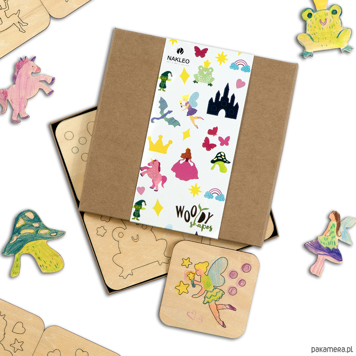Zestaw szablonów drewnianych Nakleo Woody Shapes – Świat baśni i magii przenosi dzieci do krainy wróżek, smoków, zamków i jednorożców. W środku znajduje się 20 drewnianych szablonów 9,5×9,5 cm z 3-mm sklejki, precyzyjnie wyciętych laserowo.