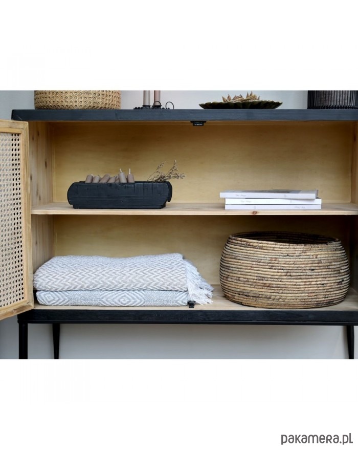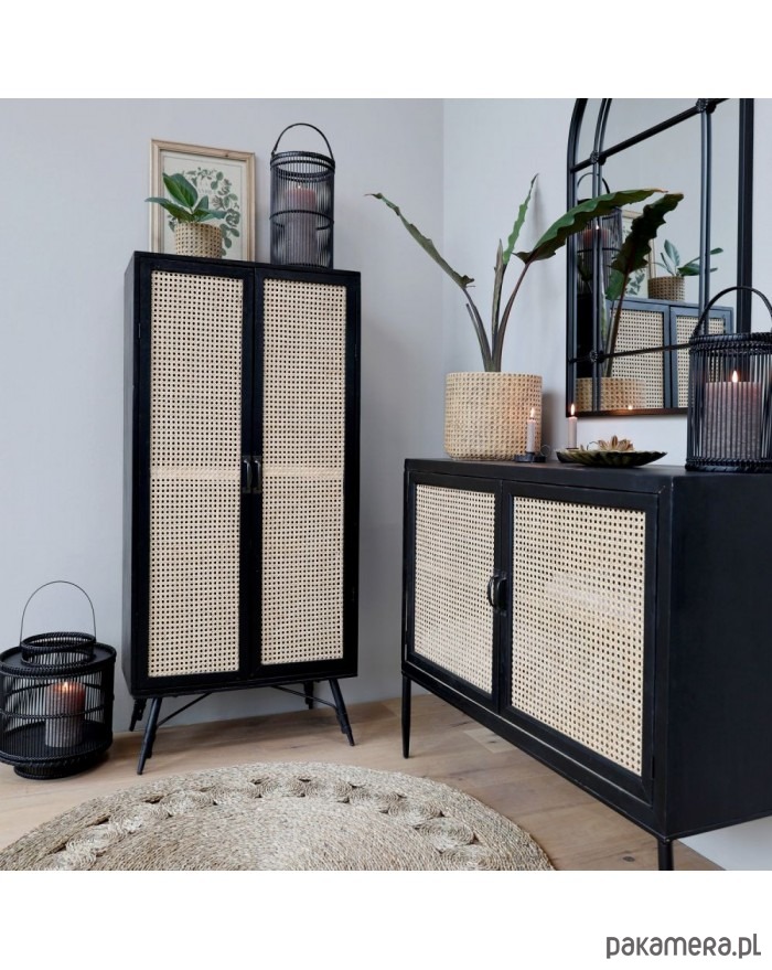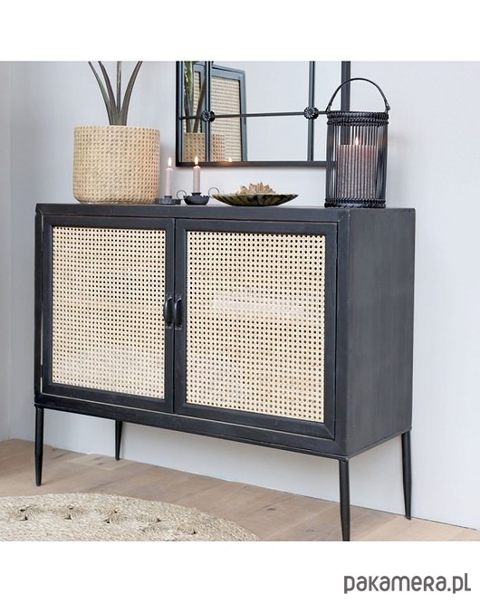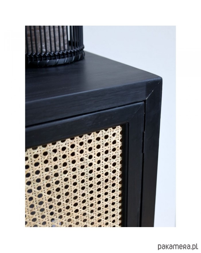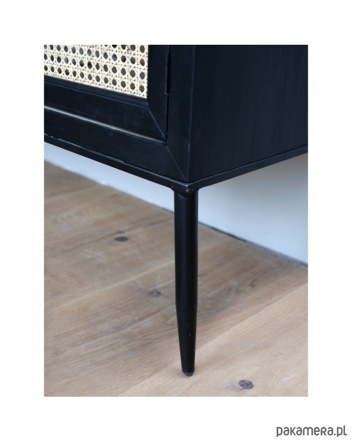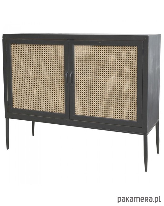 Bardzo ciekawa komoda wykonana z drewna jodłowego oraz drewnianej sklejki. Nóżki metalowe. Całość w kolorze antycznej czerni. Drzwi są rattanowe. Tworzą plecionkę wiedeńską. Mebel jest lekko postarzany, co jest zabiegiem celowym.