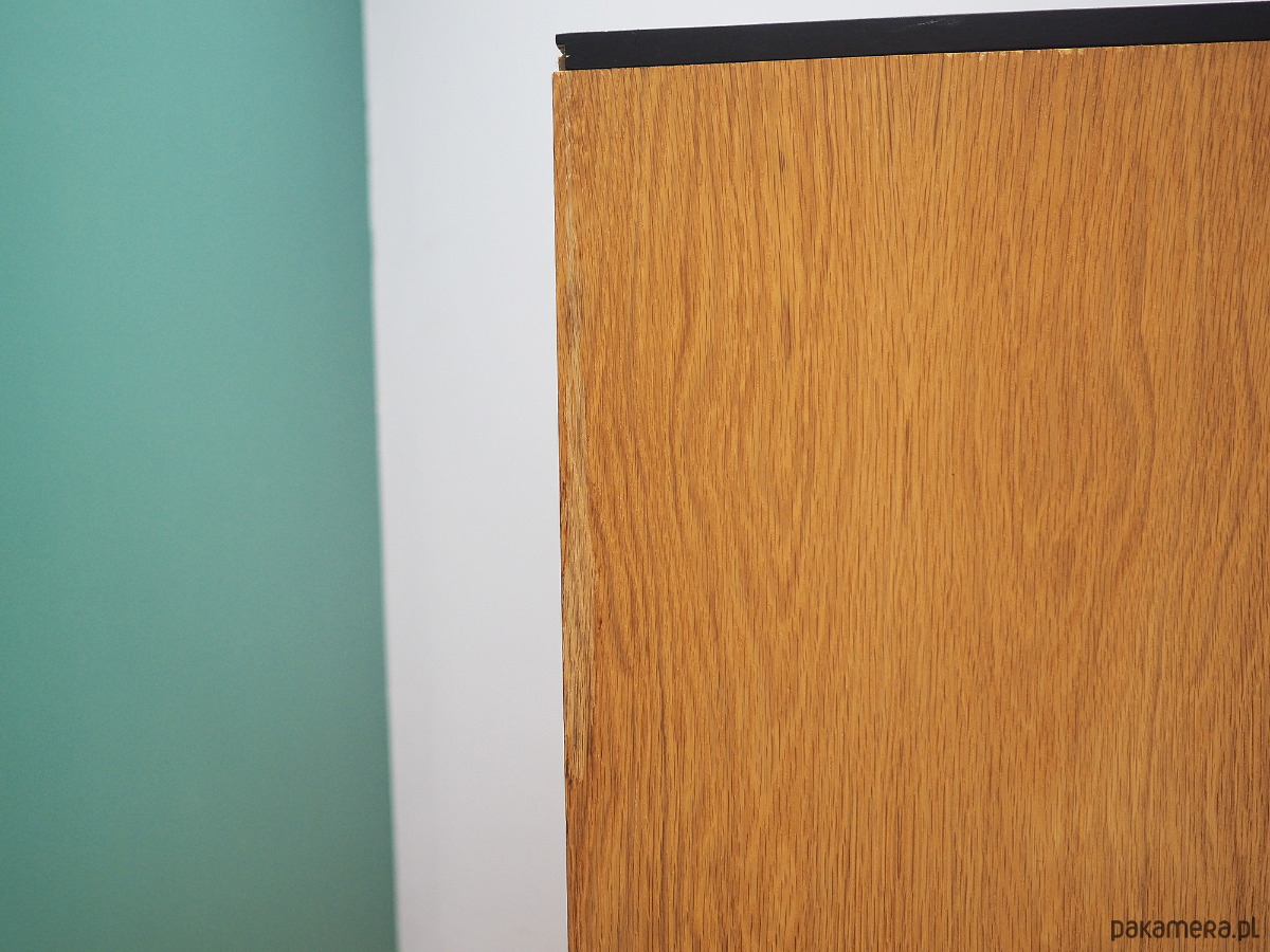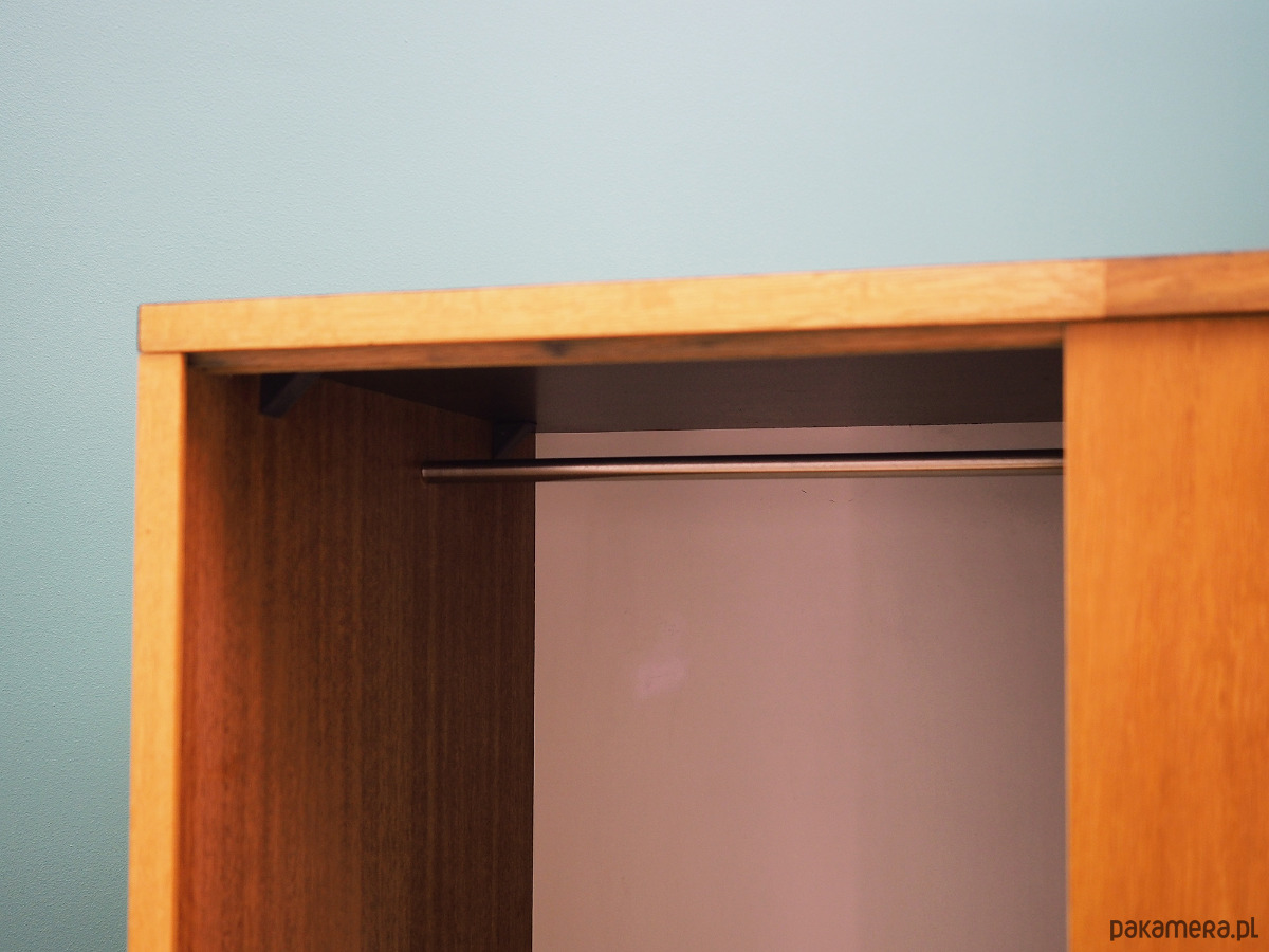 Konstrukcja pokryta jest fornirem jesionowym. Uchwyty zostały wykonane z litego drewna jesionowego. Powierzchnia po odświeżeniu. Wewnątrz przestrzeń została wypełniona praktycznymi półkami bez możliwości regulacji wysokości oraz rurką na ubrania. Szafa posiada praktyczne rozwiązanie drzwi przesuwnych, dzięki czemu ograniczamy konieczność pozostawienia dużej wolnej przestrzeni przed meblem, jednocześnie nie ograniczając sobie dostępu do wnętrza mebla. Jest to idealne rozwiązanie do niewielkich pomieszczeń. Do mebla dołączony jest klucz, zamek sprawny.