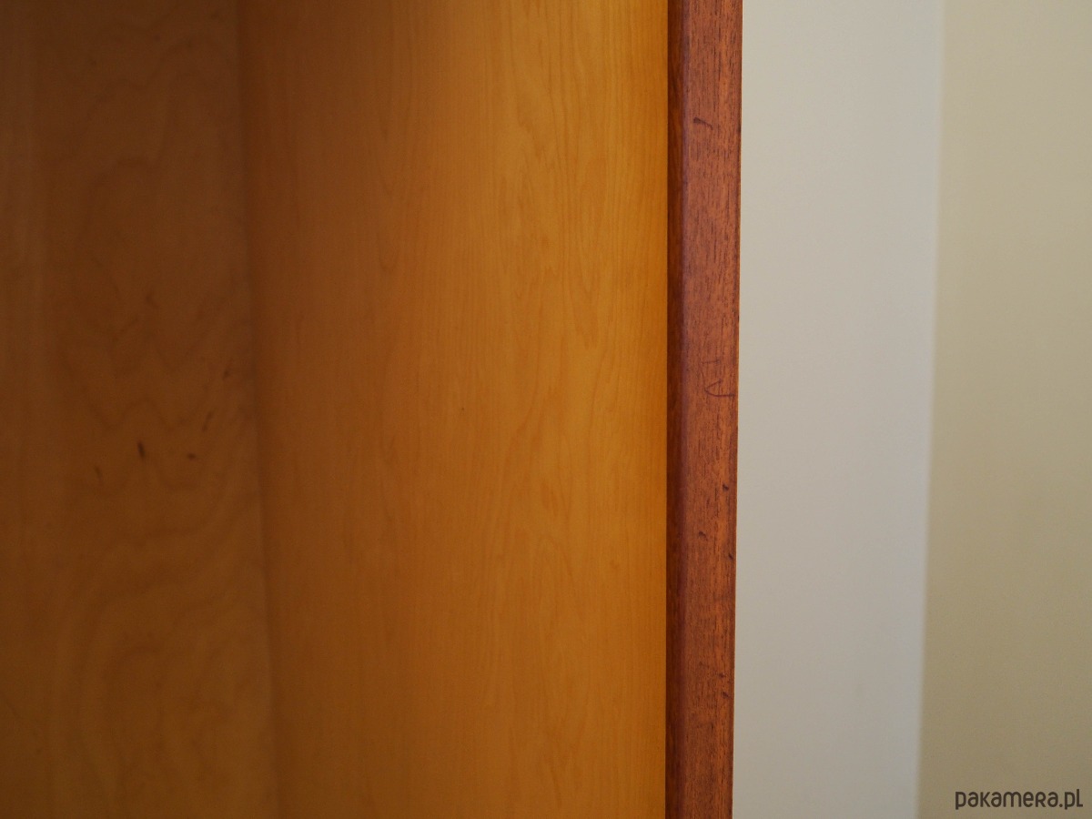 Konstrukcja pokryta jest fornirem tekowym. Powierzchnia po odświeżeniu. Wewnątrz przestrzeń została wypełniona czterema praktycznymi półkami bez możliwości regulacji wysokości, szufladką oraz rurką na ubrania. Szafa posiada praktyczne rozwiązanie drzwi przesuwnych, dzięki czemu ograniczamy konieczność pozostawienia dużej wolnej przestrzeni przed meblem, jednocześnie nie ograniczając sobie dostępu do jego wnętrza.