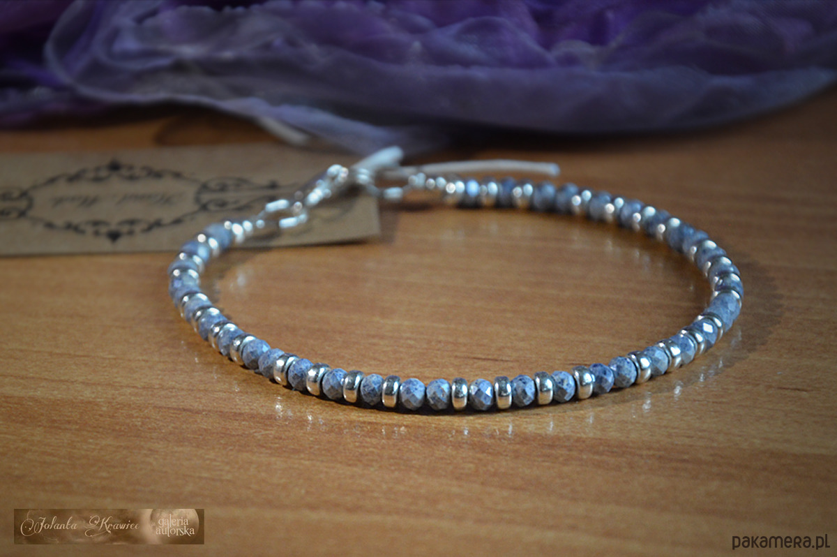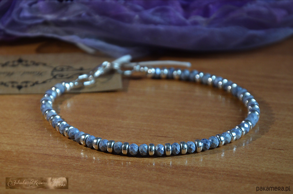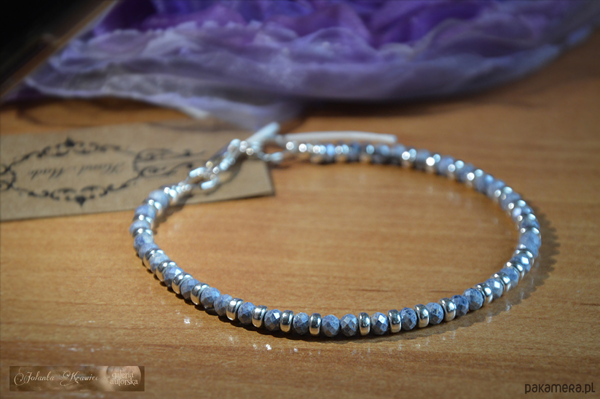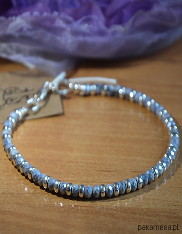 Bransoletka autorska z kolekcji baśniowej wykonana z Szafirów błękitnych kaszmirskich naturalnych wielkości ok.4 mm x 3 mm, kamienie o szlifie diamentowym, poprzeplatane oponkami ze srebra 925 wielkości 4 mm x 2 mm.