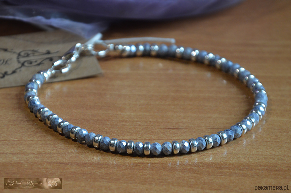 Długość bransoletki 18 cm plus przedłużka 1.5 cm. Nośnikiem jest mocna linka jubilerska japońska. Wykończenie ze srebra 925 wolnego od niklu.