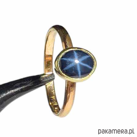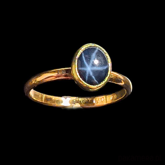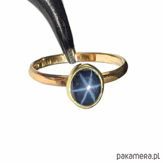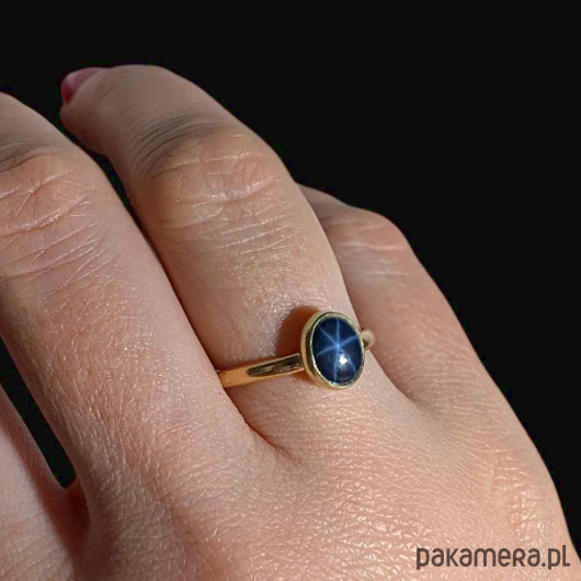 Pierścień wykonany od podstaw własnoręcznie ze złota próby 585, 14 K. Dostępne rozmiary jubilerskie 14, 16, 17, 21. Ozdobą pierścionka jest przepiękny szafir gwiaździsty ze zjawiskiem asteryzmu- bardzo wyraźna gwiazda, zjawisko widoczne w skupionym świetle (żarówka, halogen, słońce) porusza się wraz ze źródłem światła.Wymiary oprawy kamienia 6 x 7 mm, szerokość obrączki 2 mm. Waga pierścionka 2.6 grama. Wyrób sygnowany imiennikiem oraz próbą w urzędzie probierczym. Pierścionek zostanie zapakowany w ozdobne pudełeczko. Polecamw komplecie z pięknym wisiorkiem.