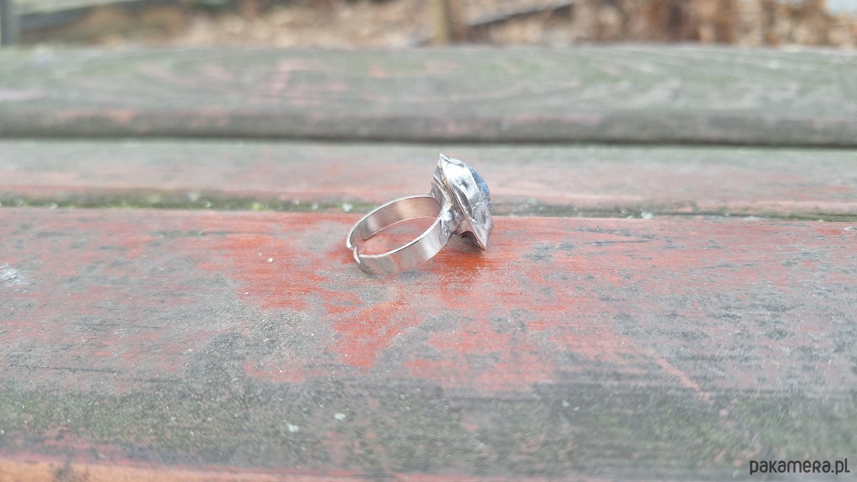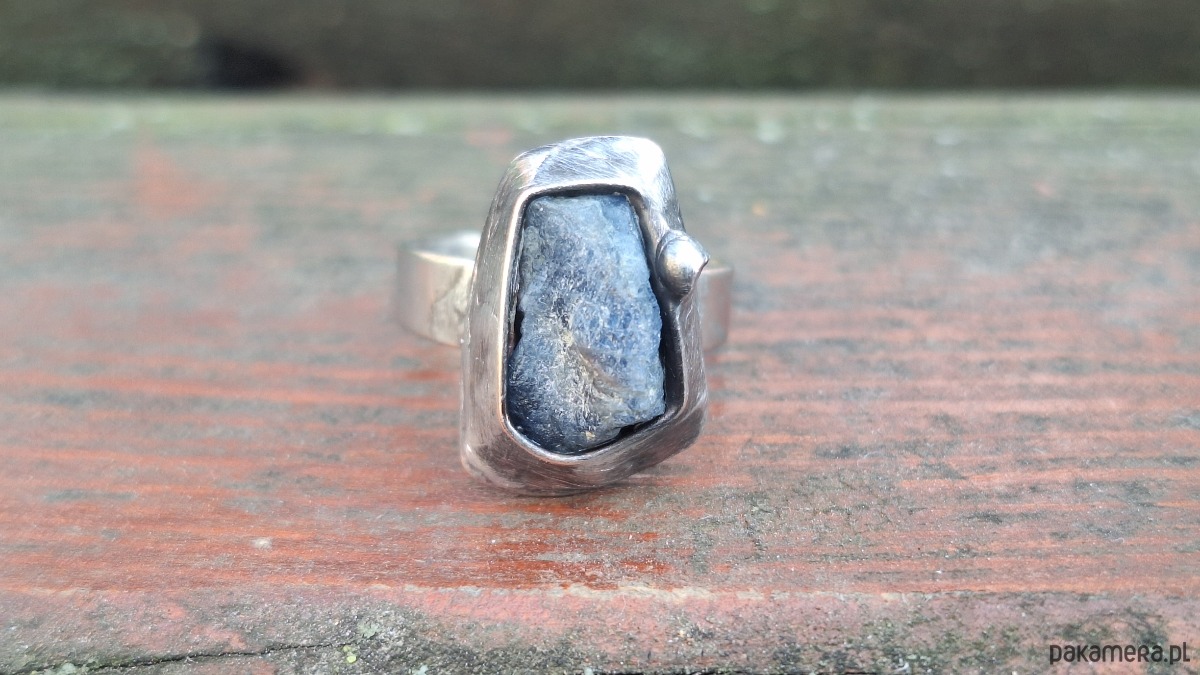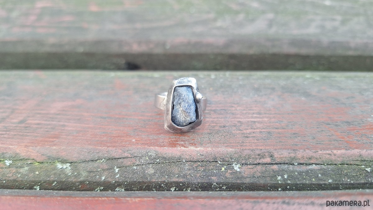 Pierścionek wykonany z miedzi, cyny i surowego szafiru. Wymiary ok. 1.5 na 1 cm. Regulowany. Nie jest ciężki.