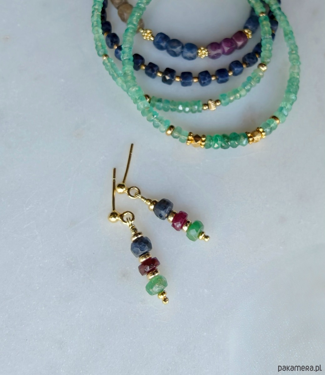 Szafir rubin szmaragd, pozłacane kolczyki